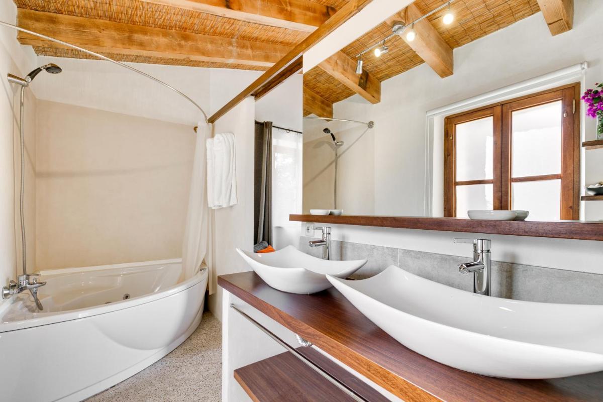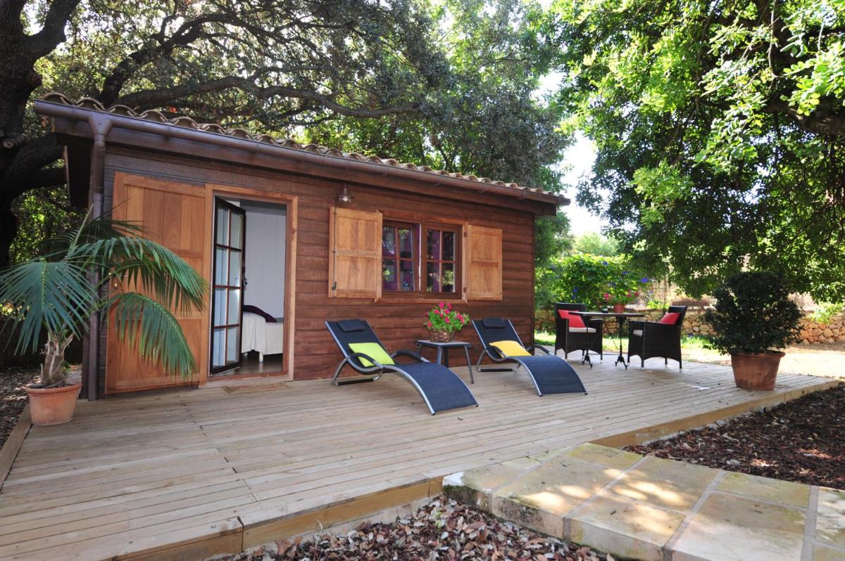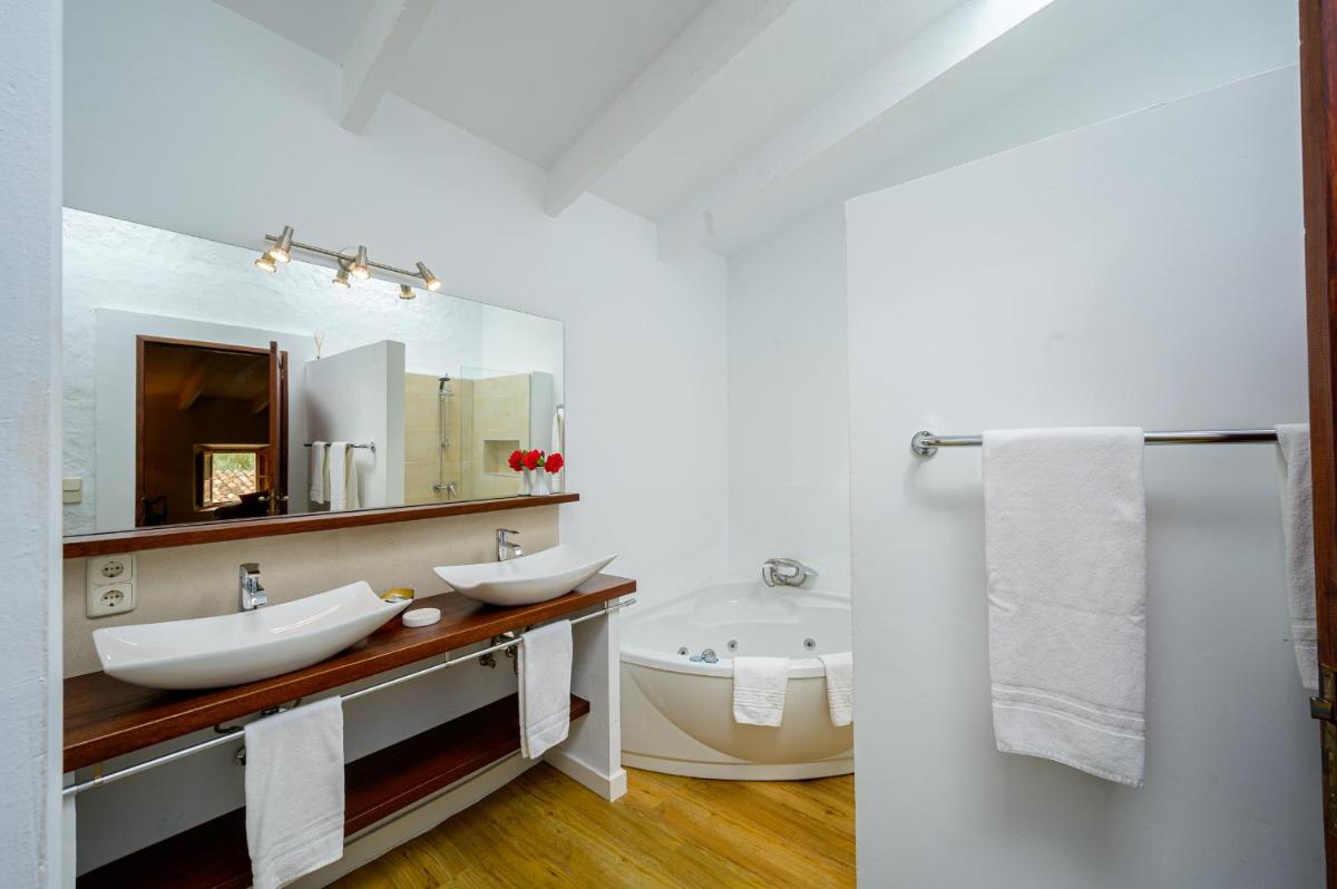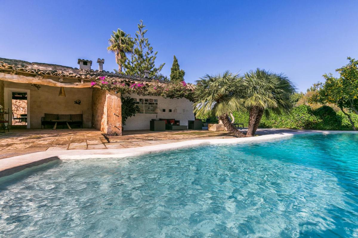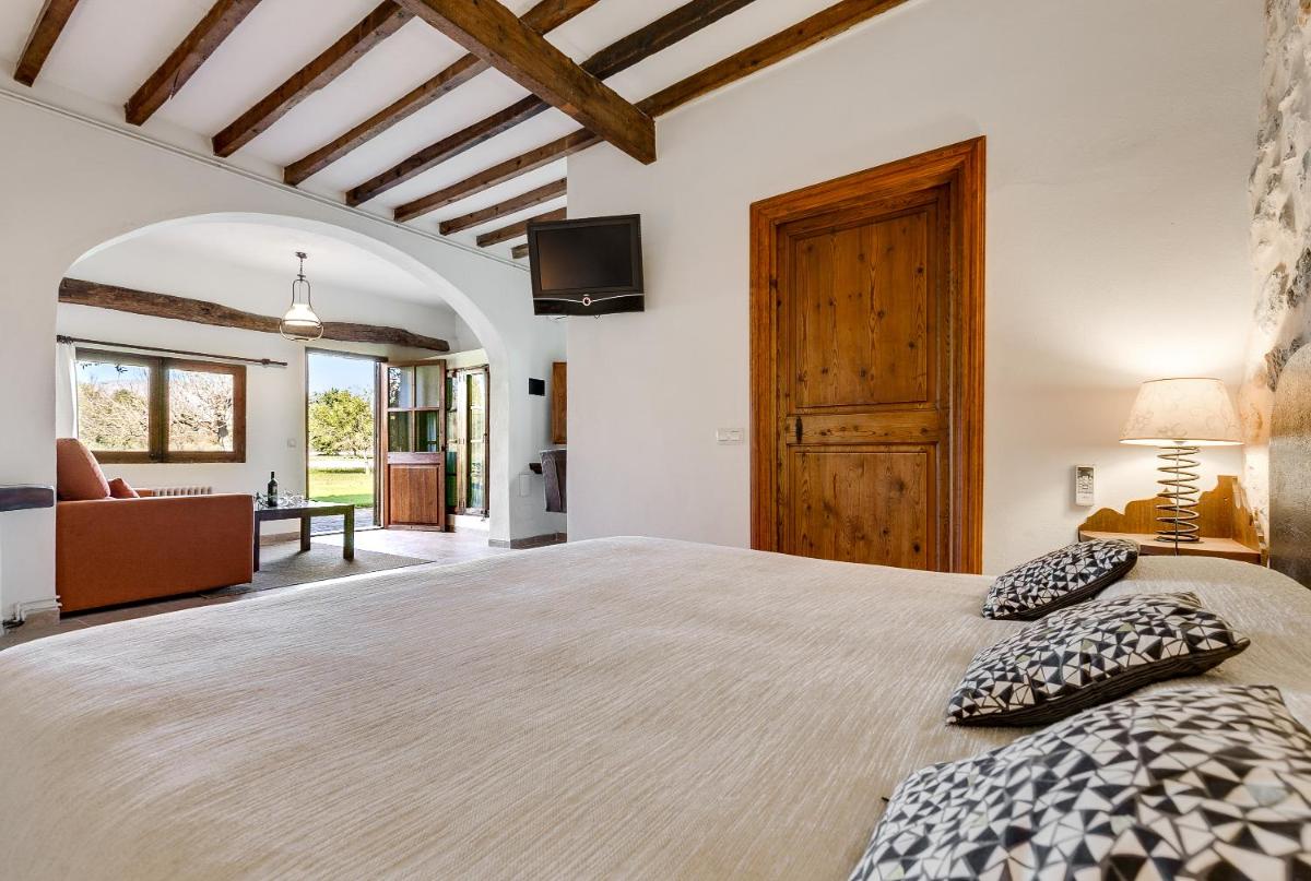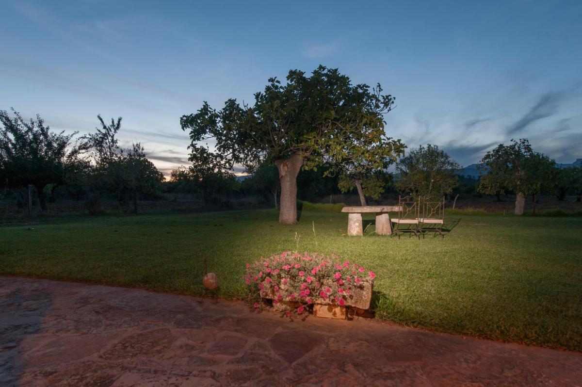 El agroturismo está rodeado de vastos jardines, almendros y cultivos, ofreciendo amplios espacios para pasear y relajarse. La piscina exterior, con una agradable vista de la campiña y la Sierra de Tramuntana a lo lejos, es el lugar ideal para disfrutar del sol de Mallorca en total calma.
