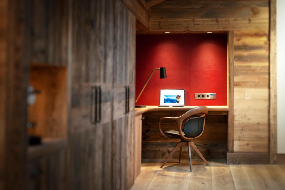 Los interiores son una obra maestra de diseño, caracterizados por una combinación de madera antigua, piedra local y mobiliario de alta gama. Las habitaciones, suites y chalets privados están concebidos como oasis de paz con detalles cuidados, como chimeneas y balcones panorámicos. La fusión entre estética rústica y lujo contemporáneo crea una atmósfera cálida, elegante y profundamente en sintonía con el entorno montañoso, un refugio de belleza artesanal.