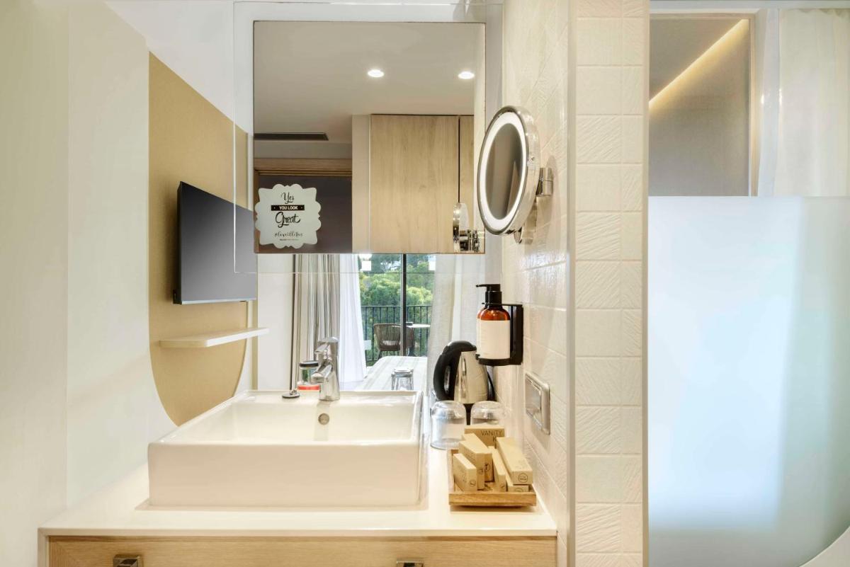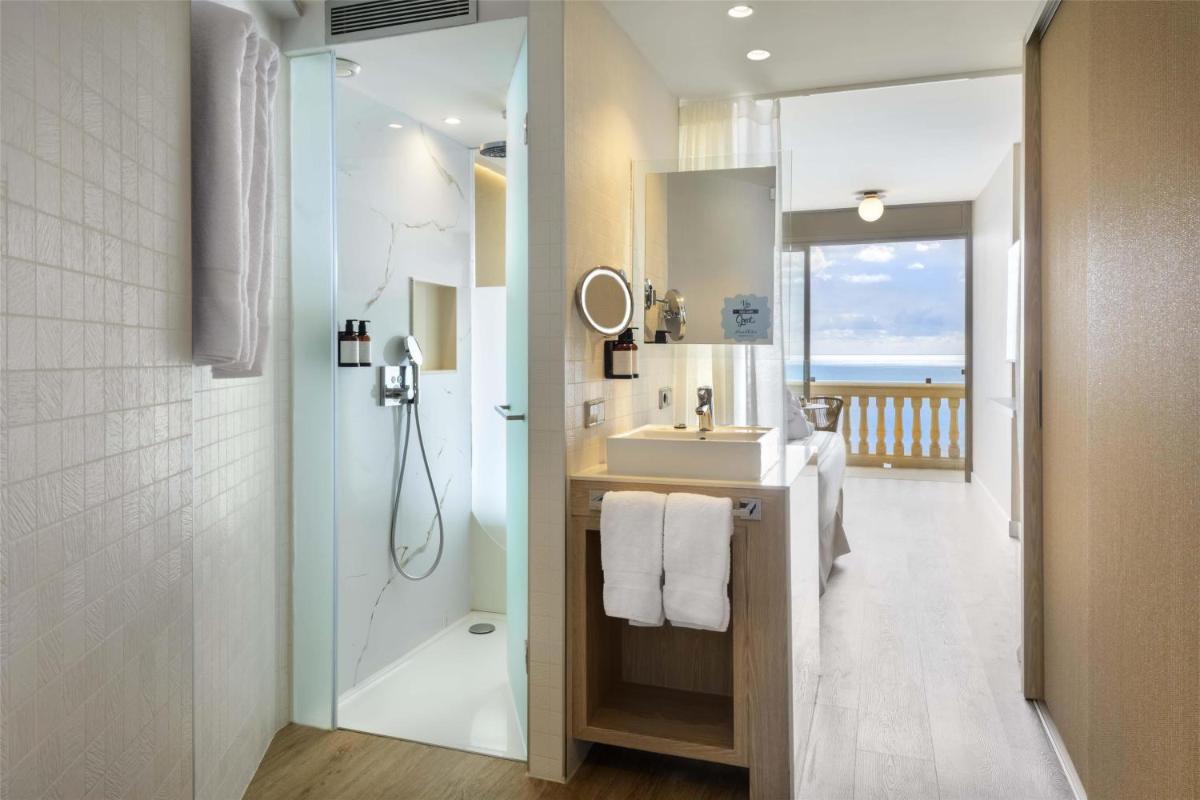 El diseño del hotel se centra en maximizar la vista al mar, con amplias terrazas y diversas áreas de piscina. El punto focal es la gran piscina infinita sobre el mar y las terrazas solárium con acceso directo al agua, creando una ilusión óptica de continuidad entre la arquitectura y el azul intenso del Mediterráneo.