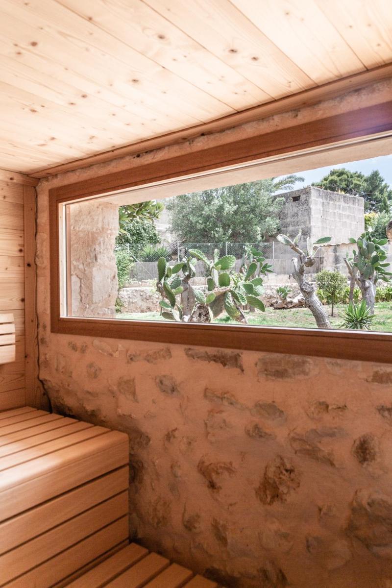 El hotel ofrece piscina exterior con solárium, sauna y rincones de jardín ideales para relajarse, leer o disfrutar del silencio entre aromas mediterráneos.