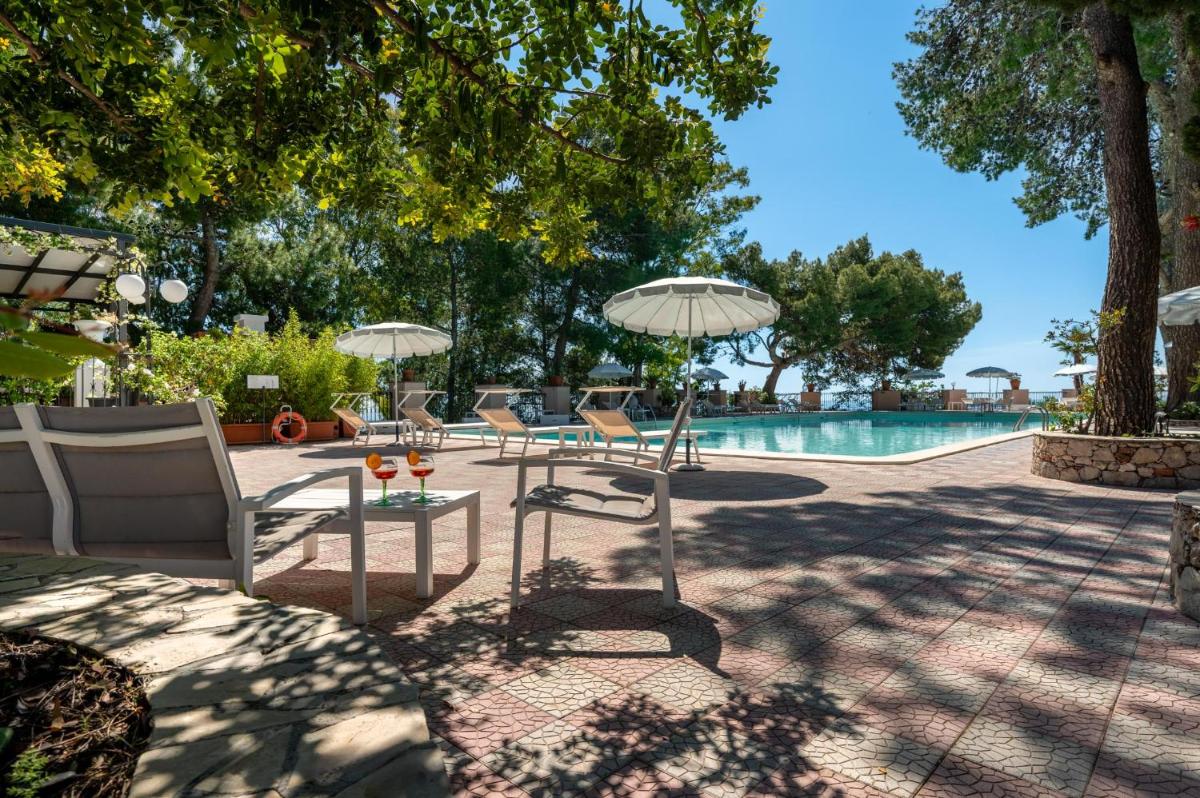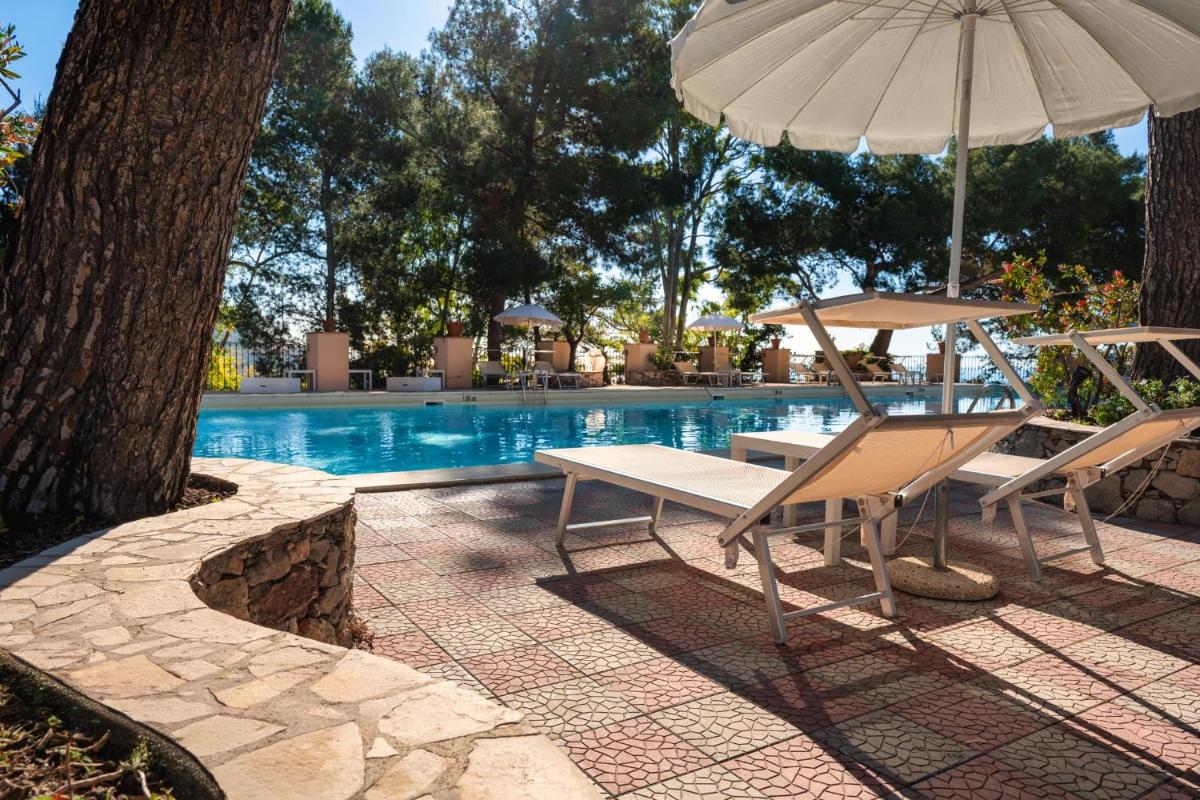 Una piscina exterior escénica entre zonas verdes, con solárium y lounges al aire libre, invita a relajarse con vistas a Isola Bella.