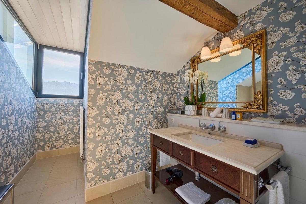Los interiores, curados por el arquitecto de interiores Pierre-Yves Rochon, mantienen una elegancia clásica con un toque contemporáneo. Las habitaciones y suites ofrecen vistas encantadoras del lago o las montañas, con muebles de calidad, telas lujosas y una atmósfera de paz y serenidad. Es el refugio ideal en la Riviera suiza.