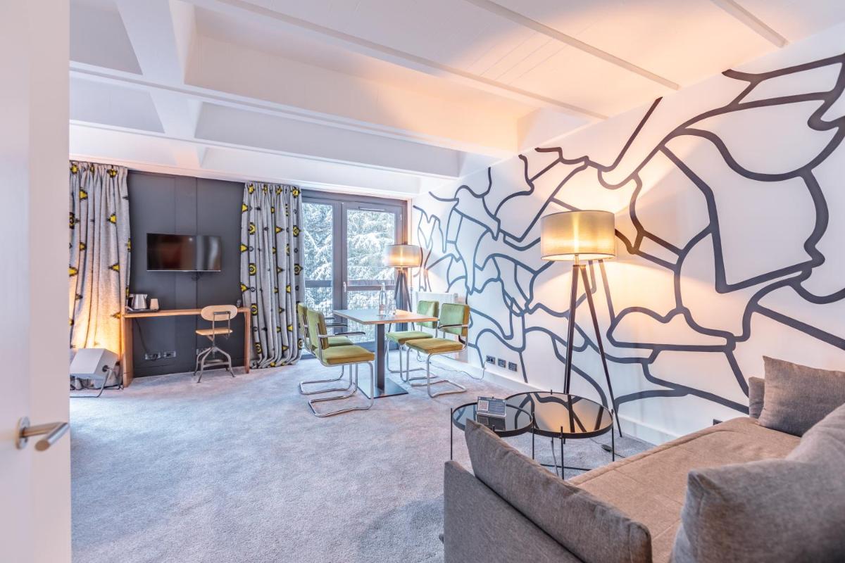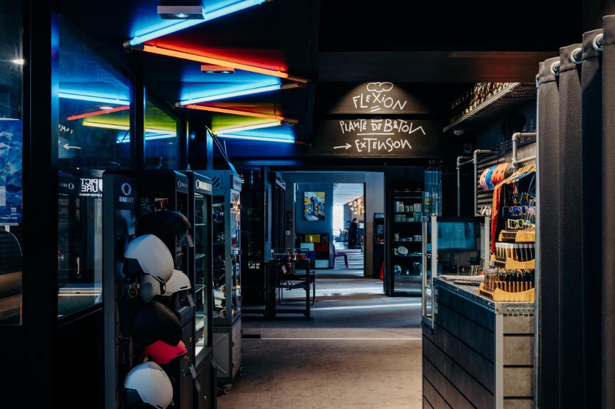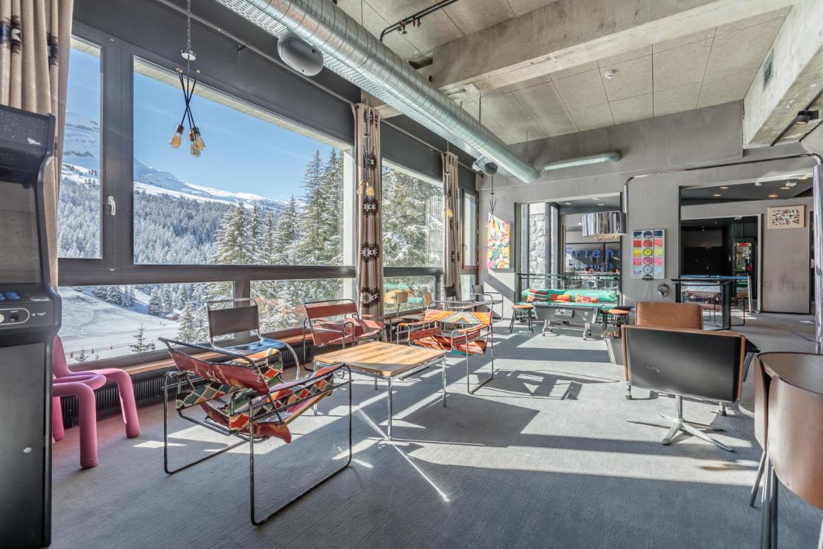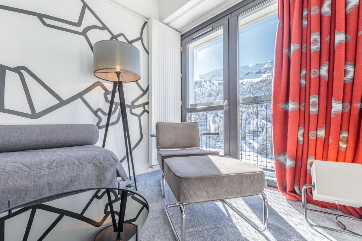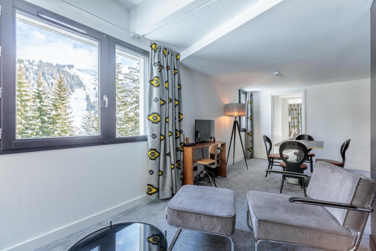 Los interiores fusionan la calidez de la madera con líneas limpias y obras de arte contemporáneo, creando una atmósfera única. Las áreas comunes, amplias y luminosas, invitan a la convivencia, ofreciendo espacios para la relajación con chimeneas y un diseño que celebra la herencia artística de Flaine. Las habitaciones son funcionales y cómodas, optimizadas para el descanso después de un día en la montaña.