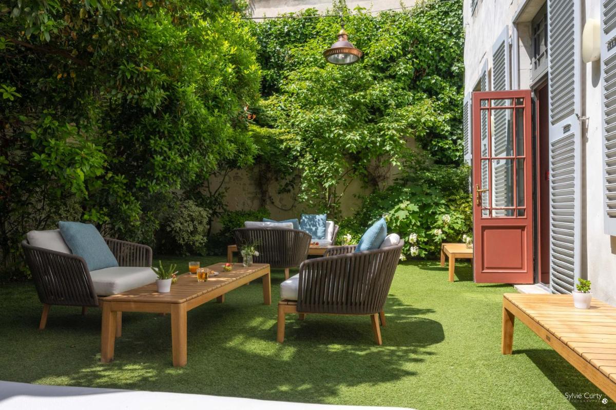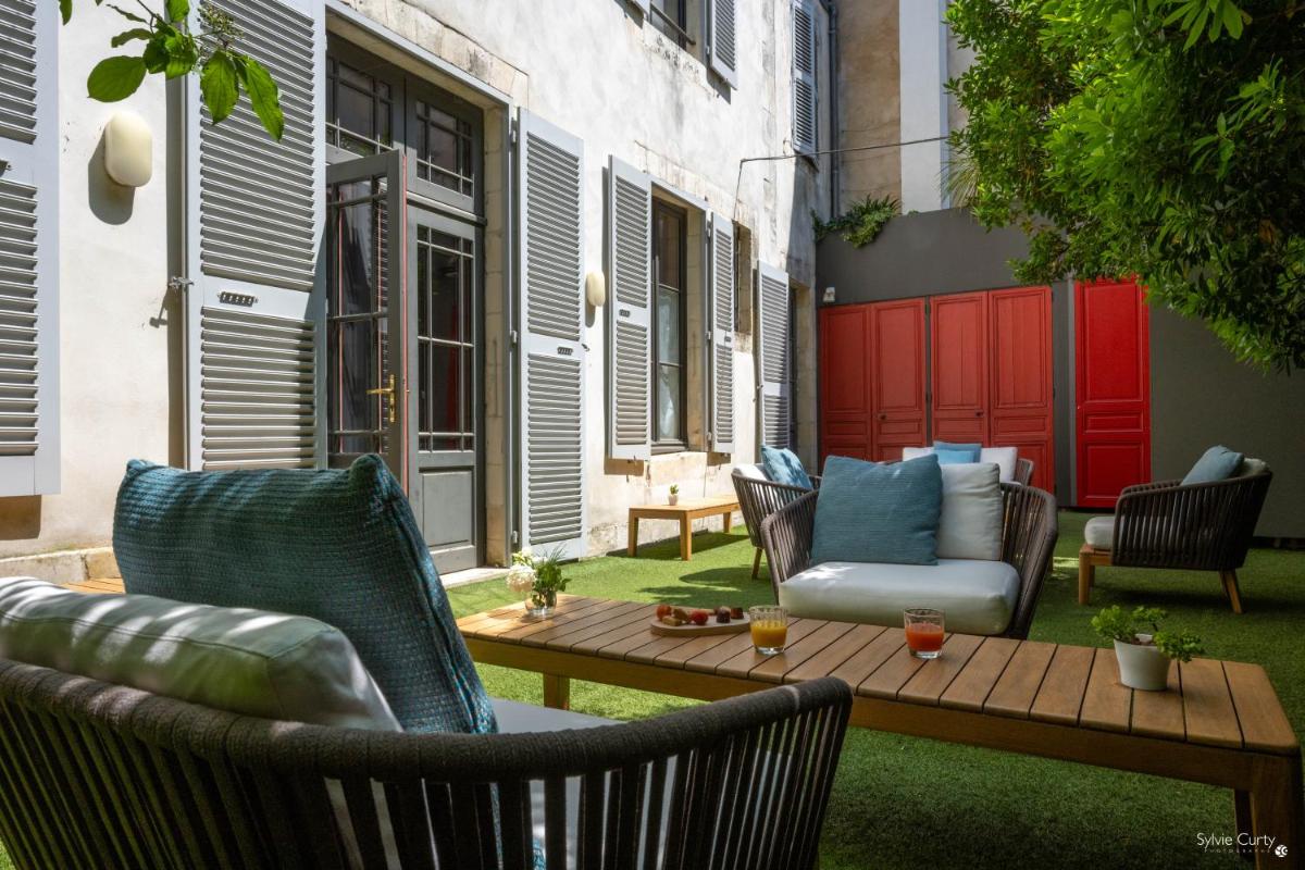 El hotel se articula alrededor de un patio interior luminoso y un pequeño jardín secreto, un oasis de paz en el corazón de la ciudad. Estos espacios exteriores, raros en La Rochelle, son perfectos para el desayuno o un momento de relax, ofreciendo una inesperada experiencia de quietud en el centro histórico.