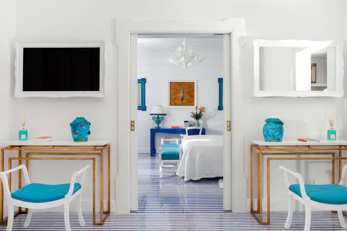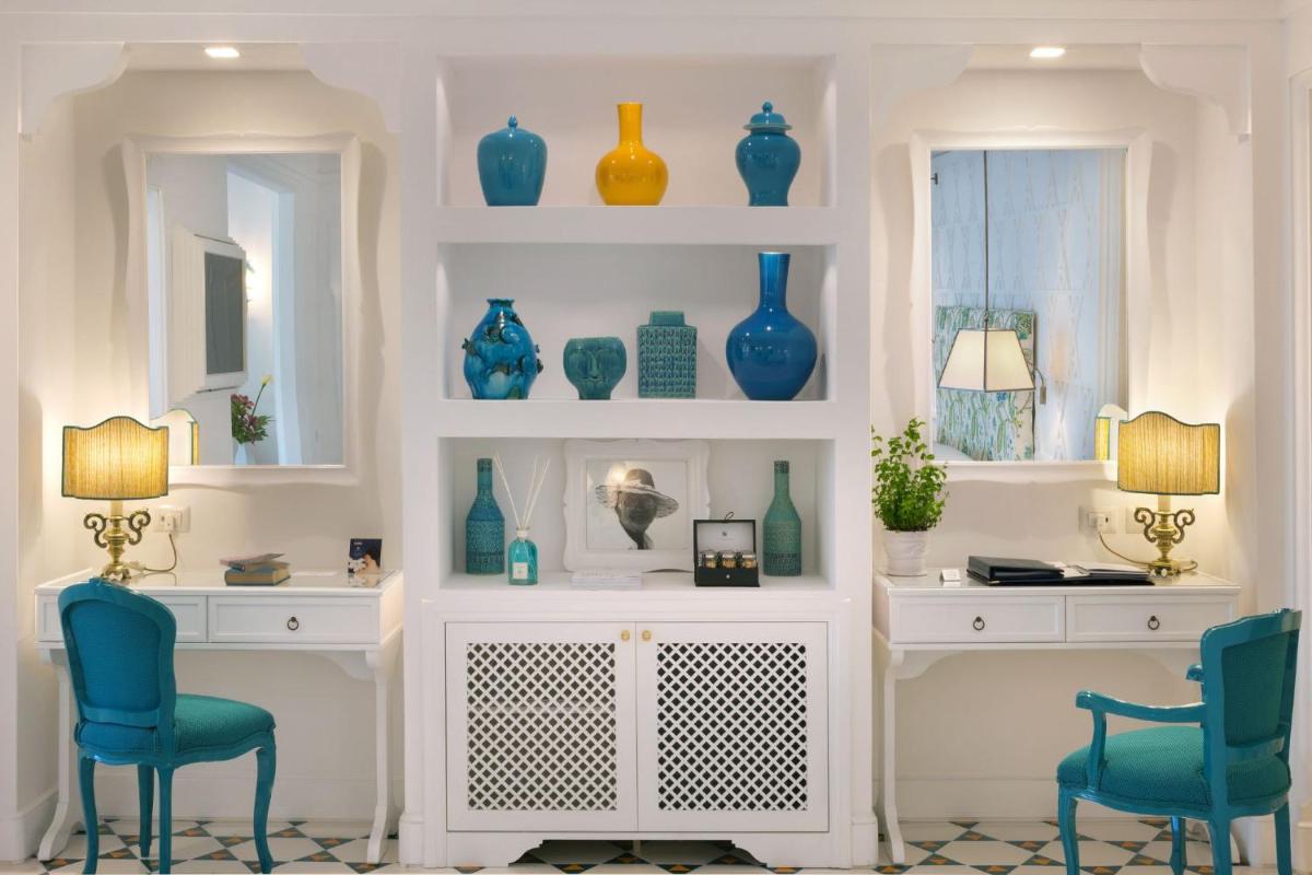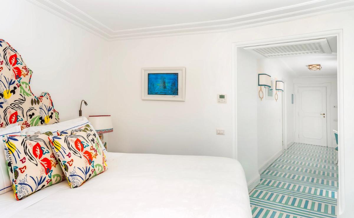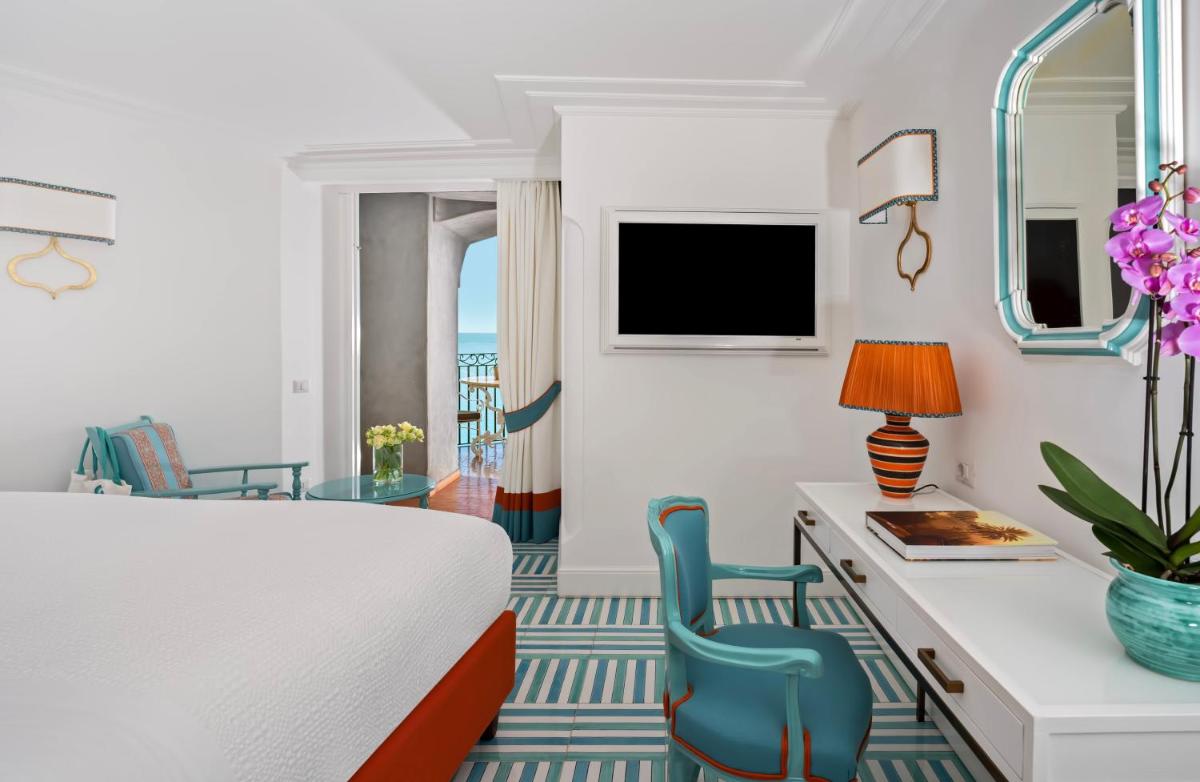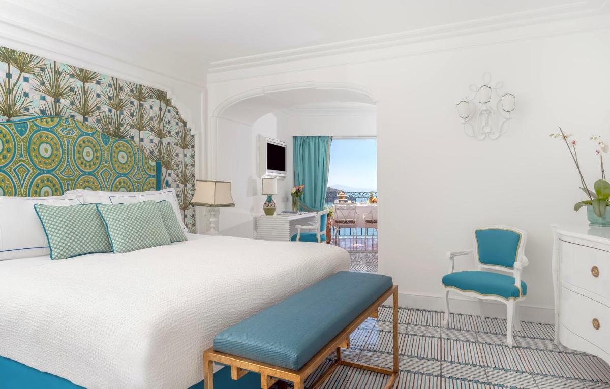 El hotel ofrece 58 Habitaciones y Suites, cada una única e inimitable, con un diseño curado por Renzo Mongiardino. Todos los alojamientos cuentan con una terraza o balcón privado con vistas al mar, complementados con jardines colgantes y mobiliario elegante. Las comodidades incluyen: aire acondicionado, WiFi gratuito, TV de pantalla plana, minibar y baños revestidos con mayólicas artísticas y mármol. La experiencia se completa con un servicio de habitaciones impecable y una vista que es, en sí misma, una obra de arte.