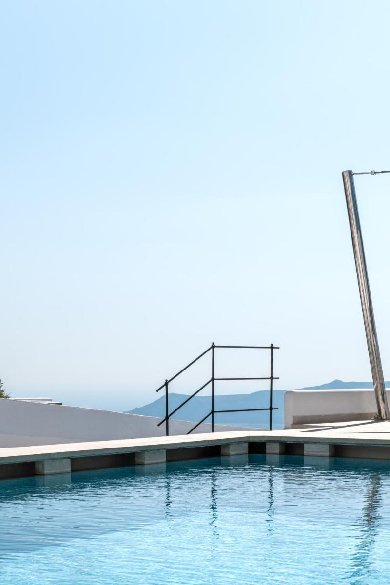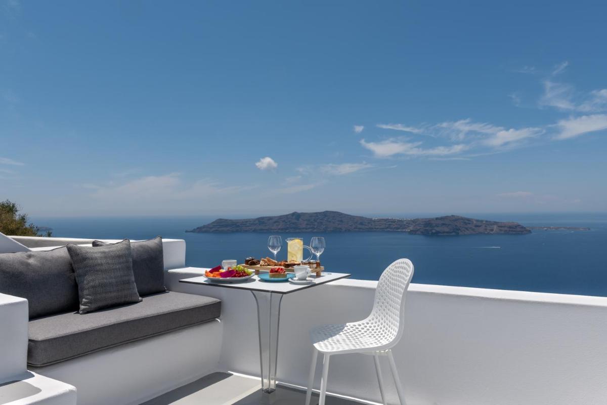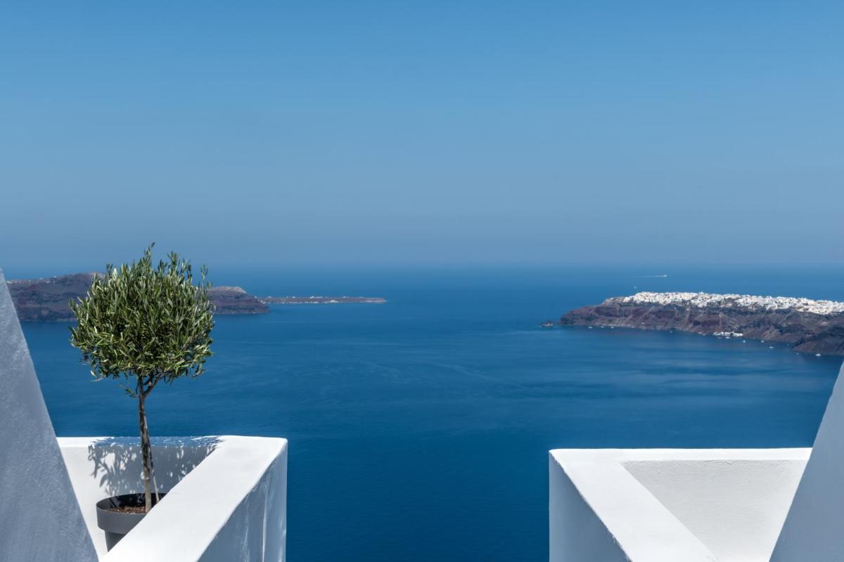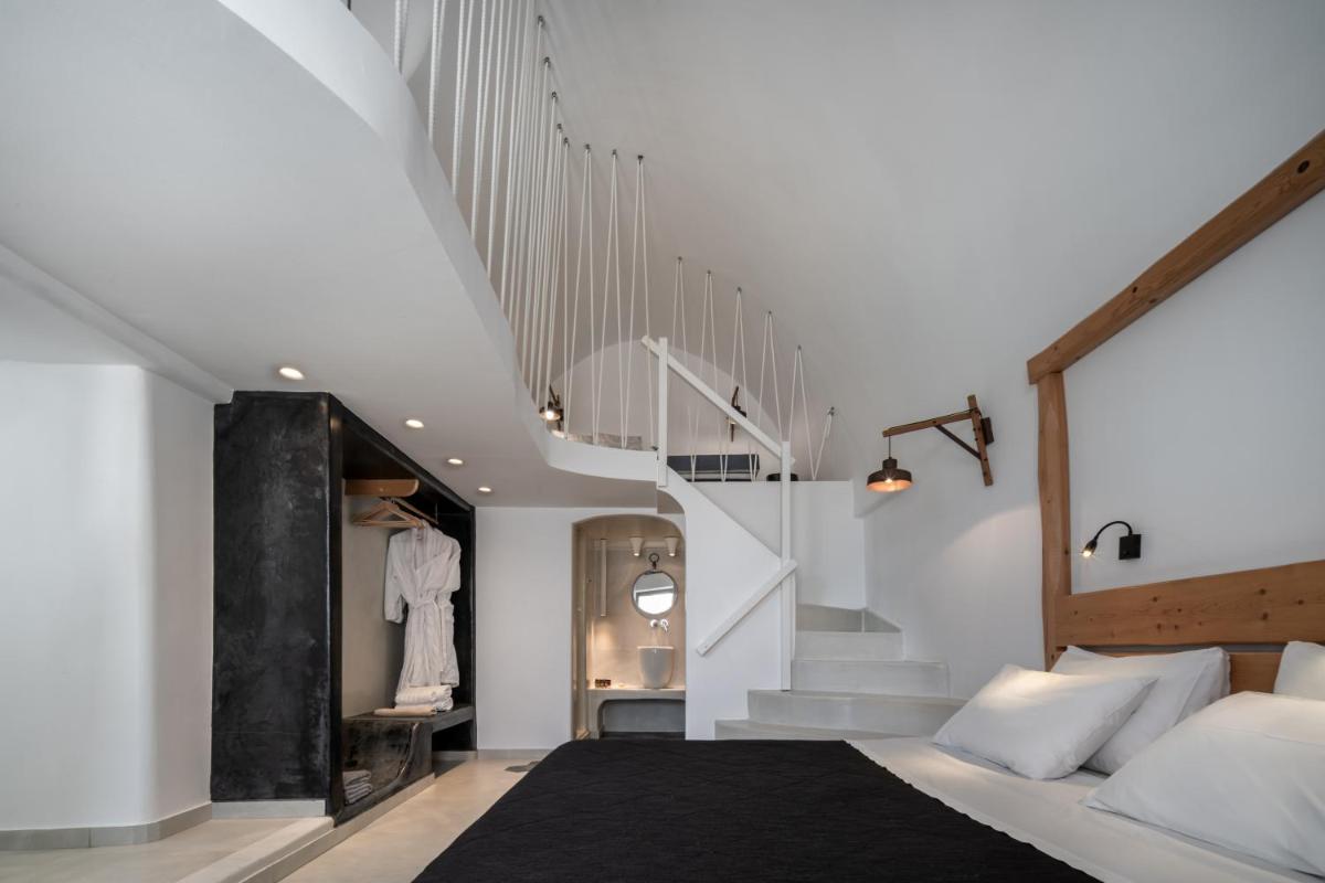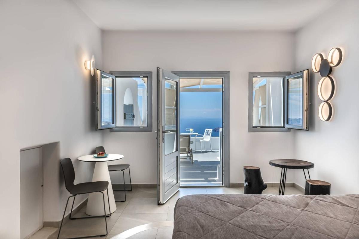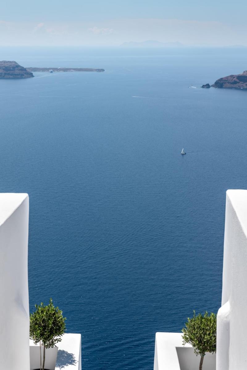 El hotel aprovecha al máximo su ubicación en el acantilado, con cada habitación y suite contando con un balcón o terraza privada que mira directamente al volcán y al Egeo. El diseño sigue el estilo minimalista de las Cícladas, con blancos brillantes y piedra oscura, creando un contraste elegante que enmarca perfectamente la vista impresionante.
