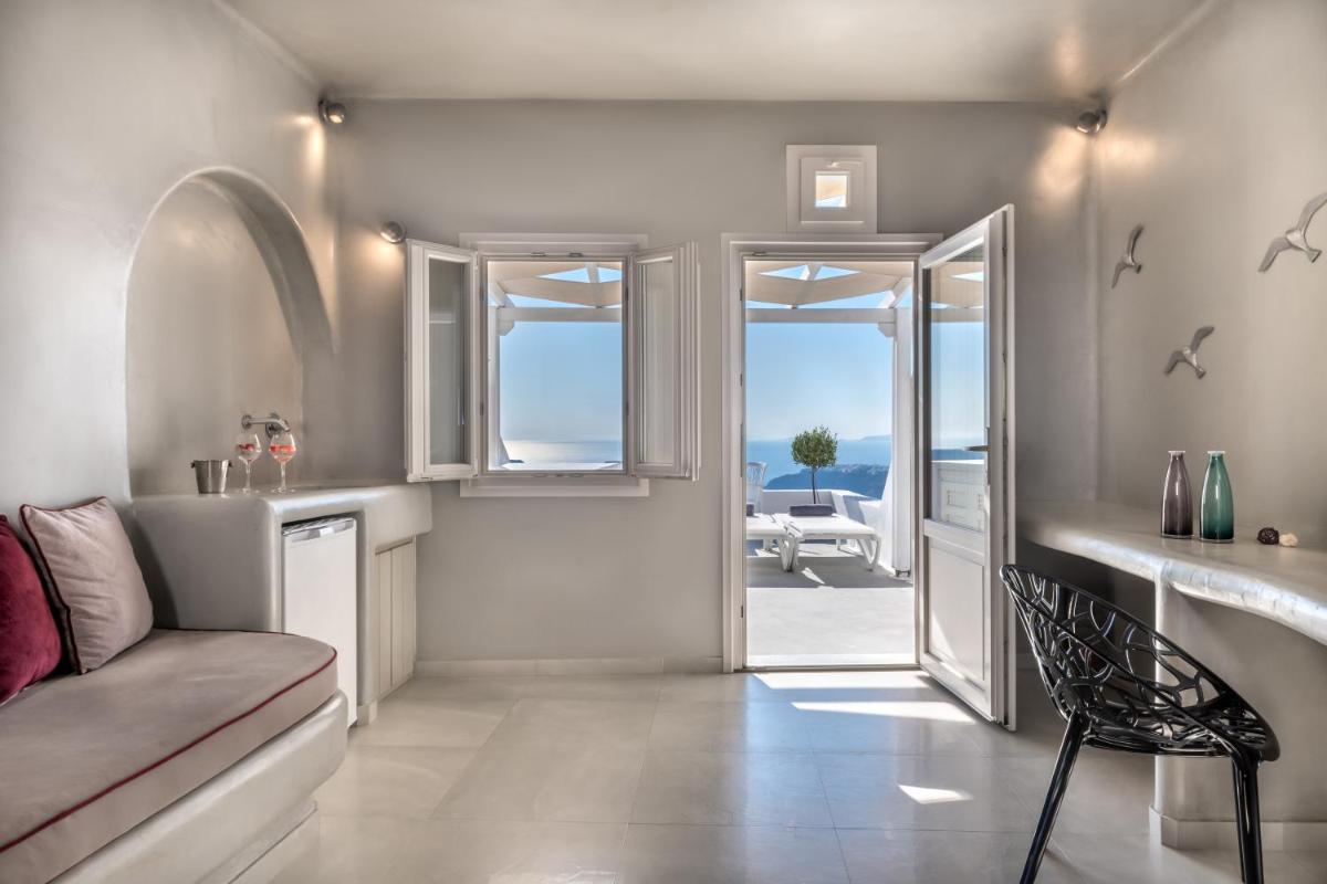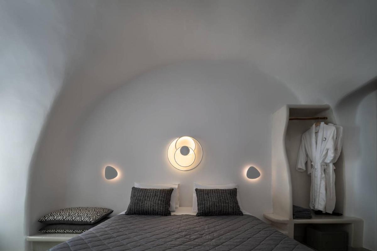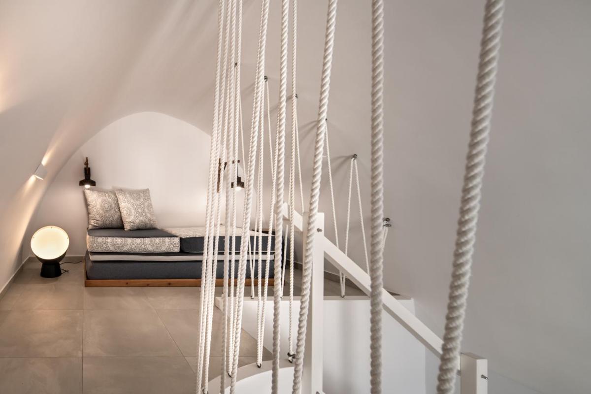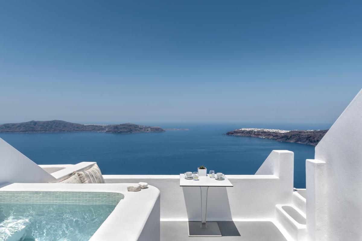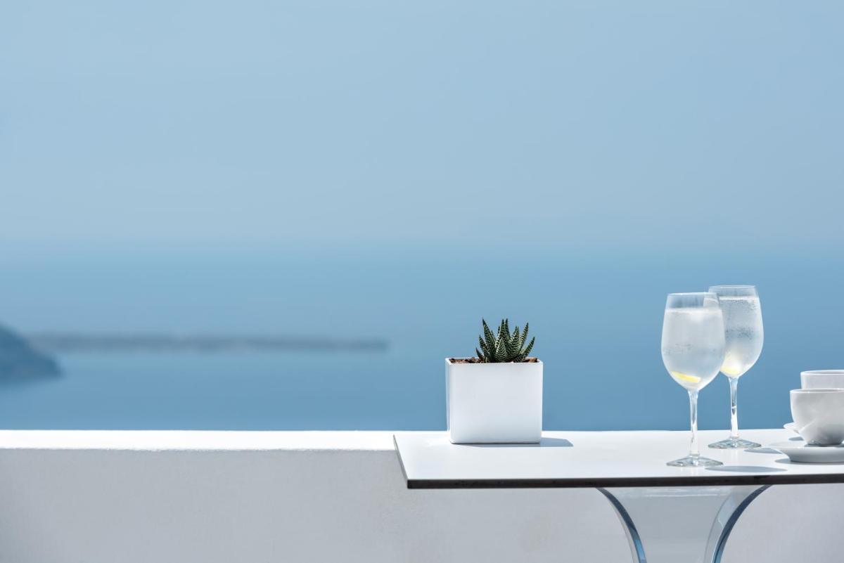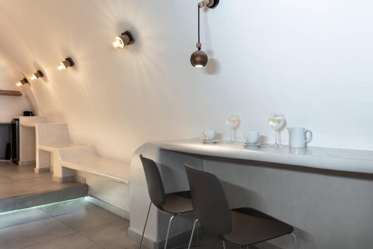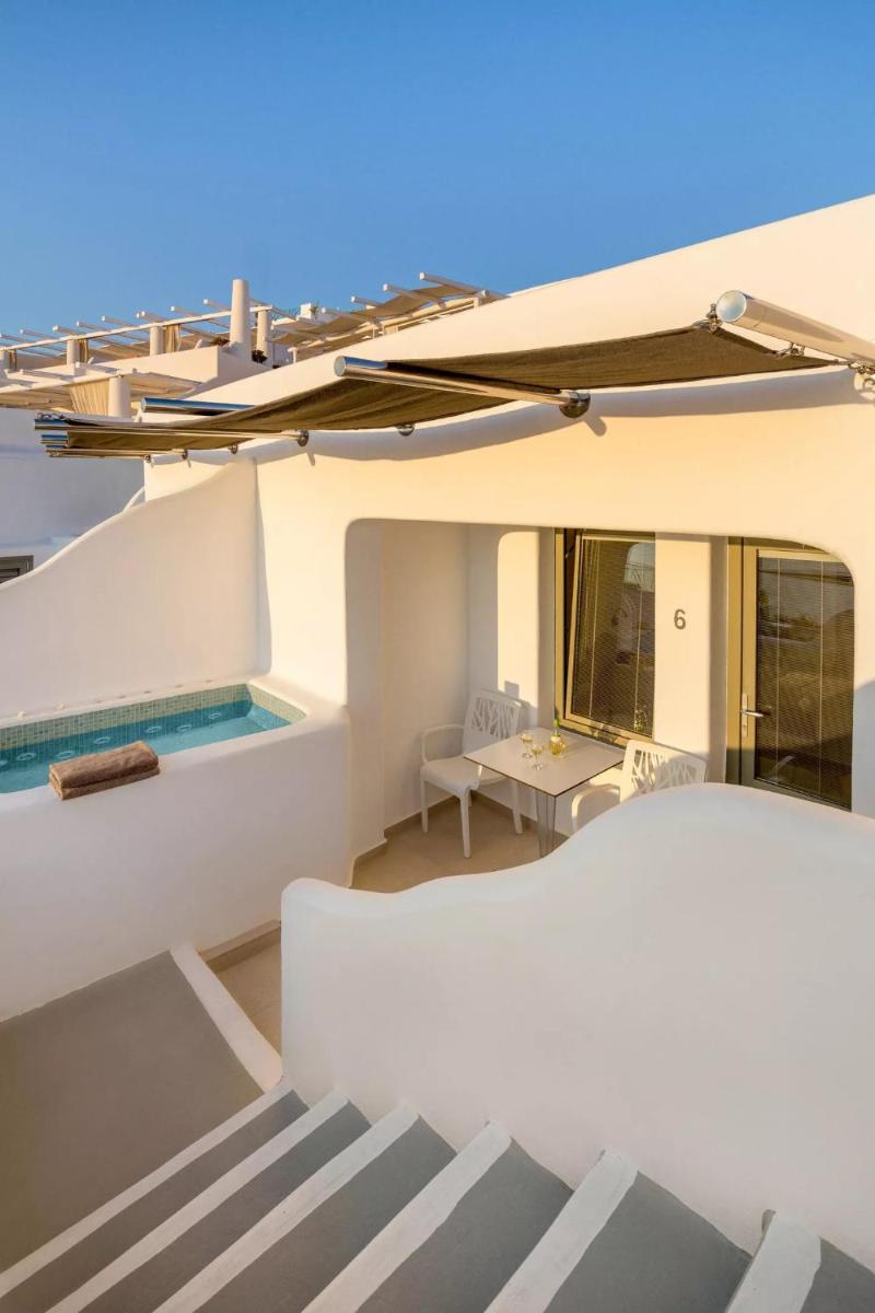 El hotel aprovecha al máximo su ubicación en el acantilado, con cada habitación y suite contando con un balcón o terraza privada que mira directamente al volcán y al Egeo. El diseño sigue el estilo minimalista de las Cícladas, con blancos brillantes y piedra oscura, creando un contraste elegante que enmarca perfectamente la vista impresionante.