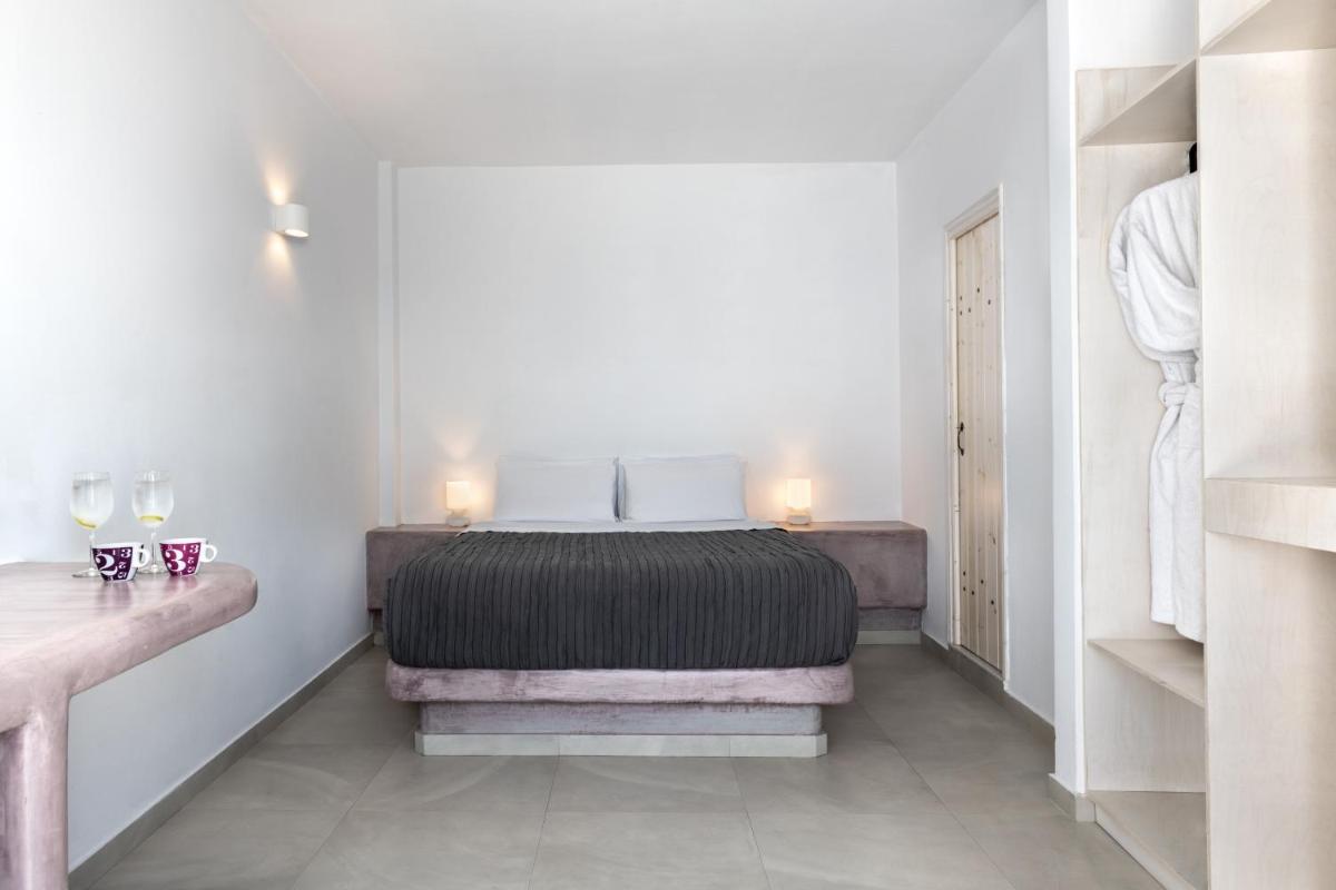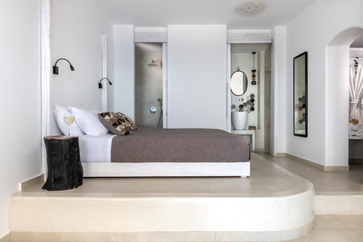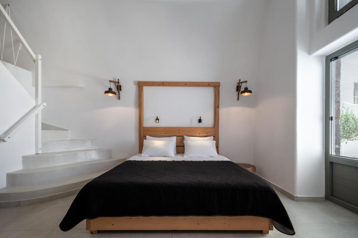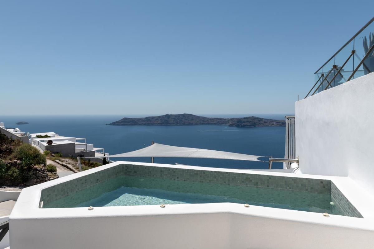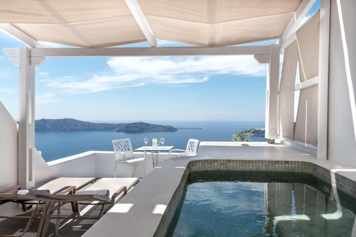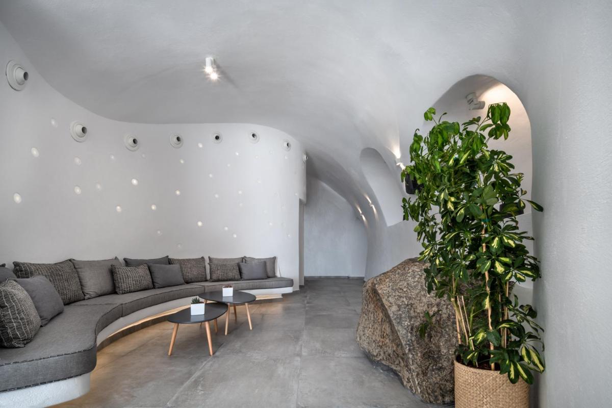 El hotel aprovecha al máximo su ubicación en el acantilado, con cada habitación y suite contando con un balcón o terraza privada que mira directamente al volcán y al Egeo. El diseño sigue el estilo minimalista de las Cícladas, con blancos brillantes y piedra oscura, creando un contraste elegante que enmarca perfectamente la vista impresionante.