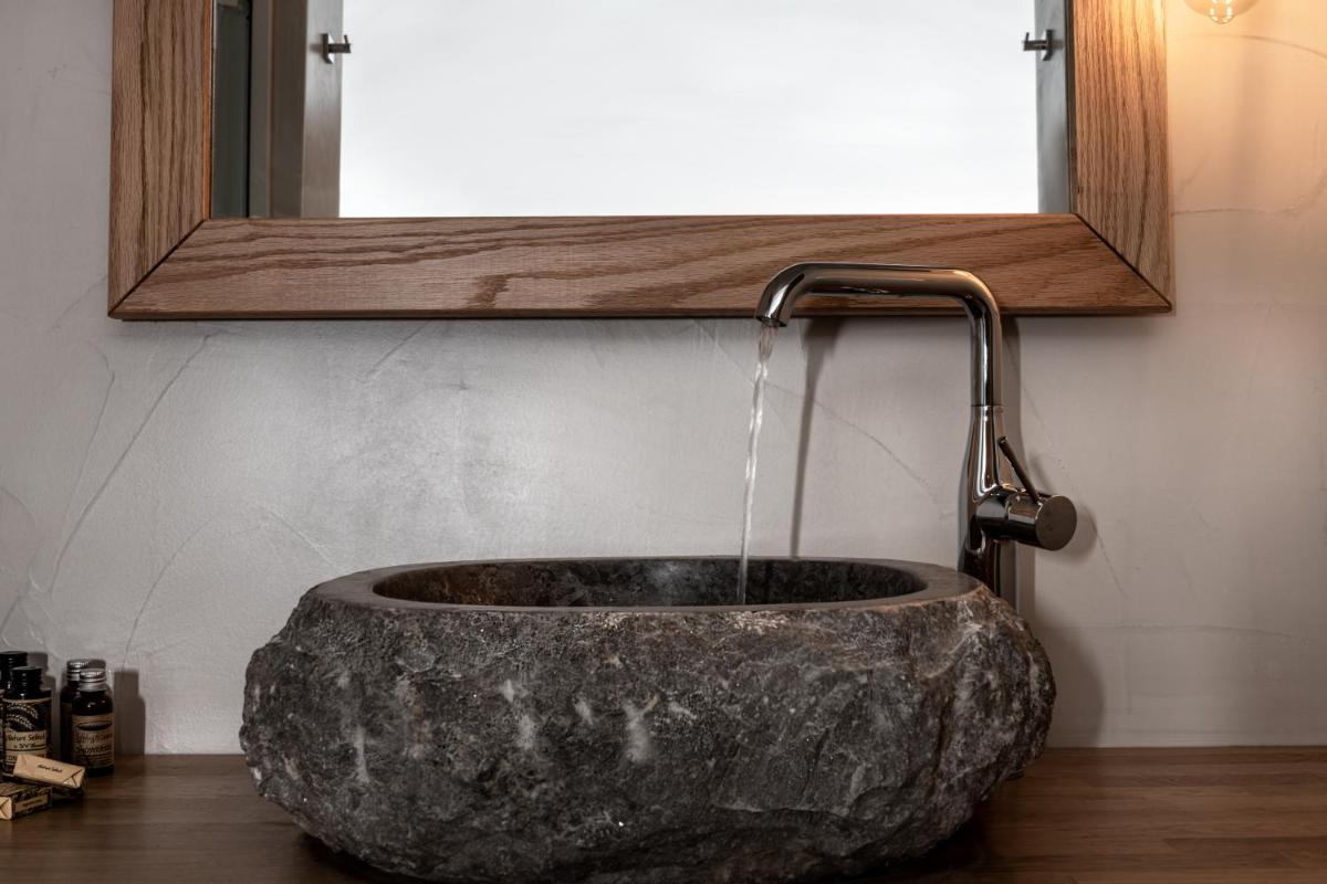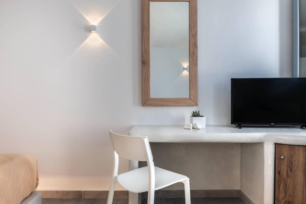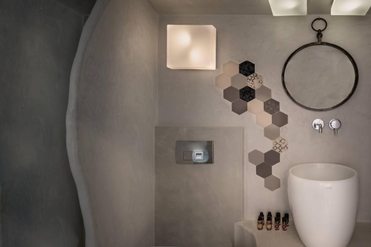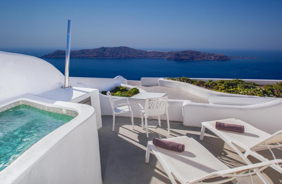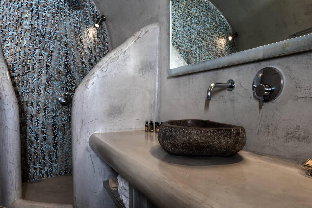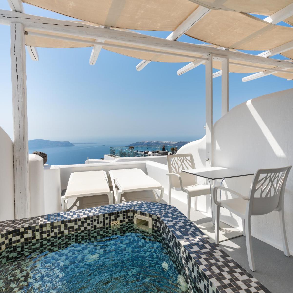 El hotel aprovecha al máximo su ubicación en el acantilado, con cada habitación y suite contando con un balcón o terraza privada que mira directamente al volcán y al Egeo. El diseño sigue el estilo minimalista de las Cícladas, con blancos brillantes y piedra oscura, creando un contraste elegante que enmarca perfectamente la vista impresionante.
