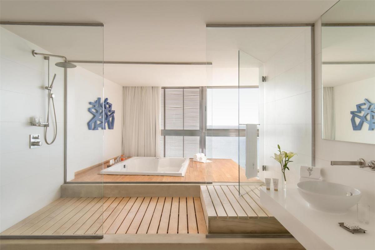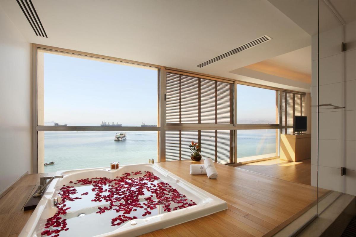 Suite de lujo con 1 cama extragrande y terraza amplia con vistas panorámicas al mar Rojo y al golfo de Áqaba. Esta suite cuenta con aire acondicionado, jacuzzi, salón, zona de comedor y escritorio. El baño tiene ventana de cristal con vistas al mar, bañera de hidromasaje, ducha a ras de suelo y espejo de aumento. También incluye artículos de aseo de lujo, zapatillas, albornoces, secador de pelo, minibar gratuito (refrescos y agua), conexión a internet por cable gratuita, set de té/café gratuito, prensa local gratuita y carta de almohadas.