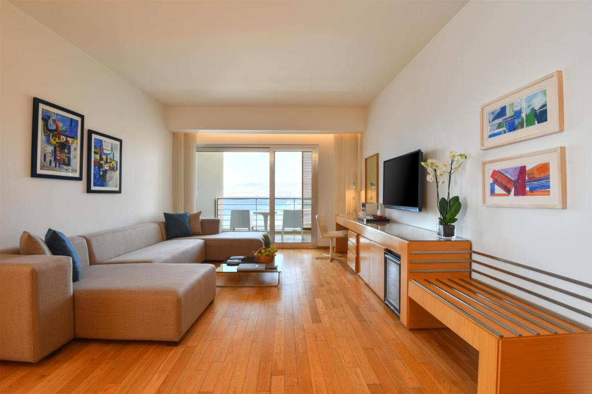 Suite con 1 cama extragrande y balcón privado amplio con vistas al mar Rojo y al golfo de Áqaba. Suite con aire acondicionado, sala de estar, escritorio, baño con ventana, ducha de efecto lluvia y espejo de aumento. Incluye artículos de aseo de lujo, zapatillas, albornoces, secador de pelo, minibar gratuito (refrescos y agua), WiFi y conexión a internet por cable gratuitas, set de té y café gratuito, periódico local gratuito y carta de almohadas.