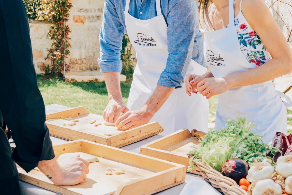 El restaurante interno, Leonardo ArteCibo, celebra la cocina tradicional pugliese y de temporada bajo la dirección del Chef Francesco Cataldi. La filosofía culinaria es sostenible y Km 0, con verduras frescas recolectadas directamente del Huerto Ecológico adyacente a la cocina. El servicio incluye un completo Desayuno (Continental/dulce y salado) con productos locales y opciones para vegetarianos, celíacos e intolerantes a la lactosa. Un Bar junto a la piscina y una bodega curada están disponibles.
