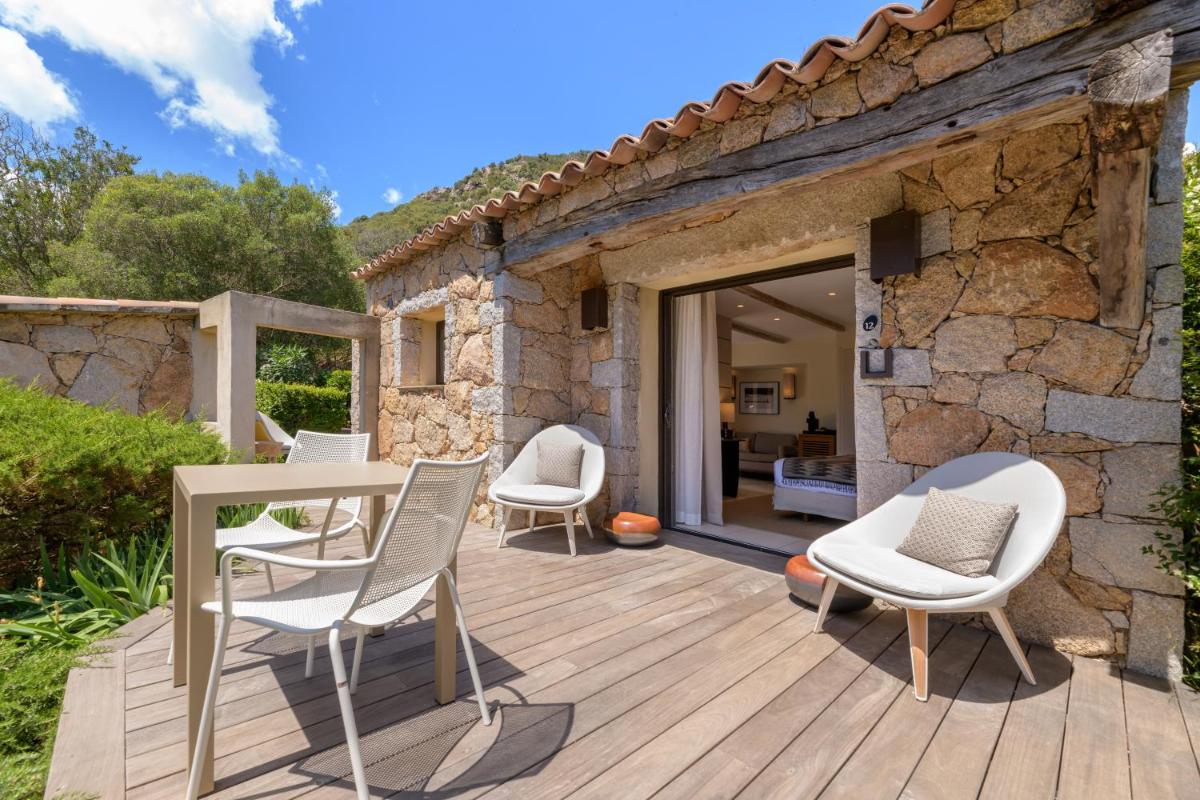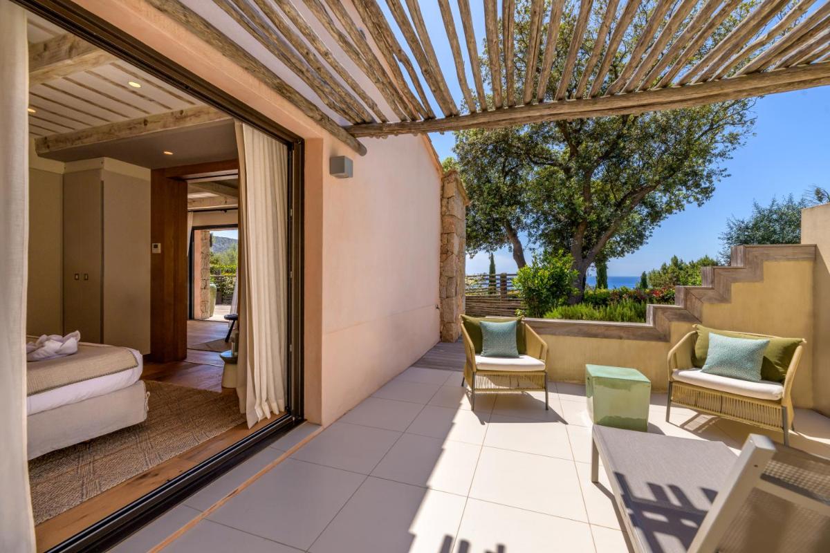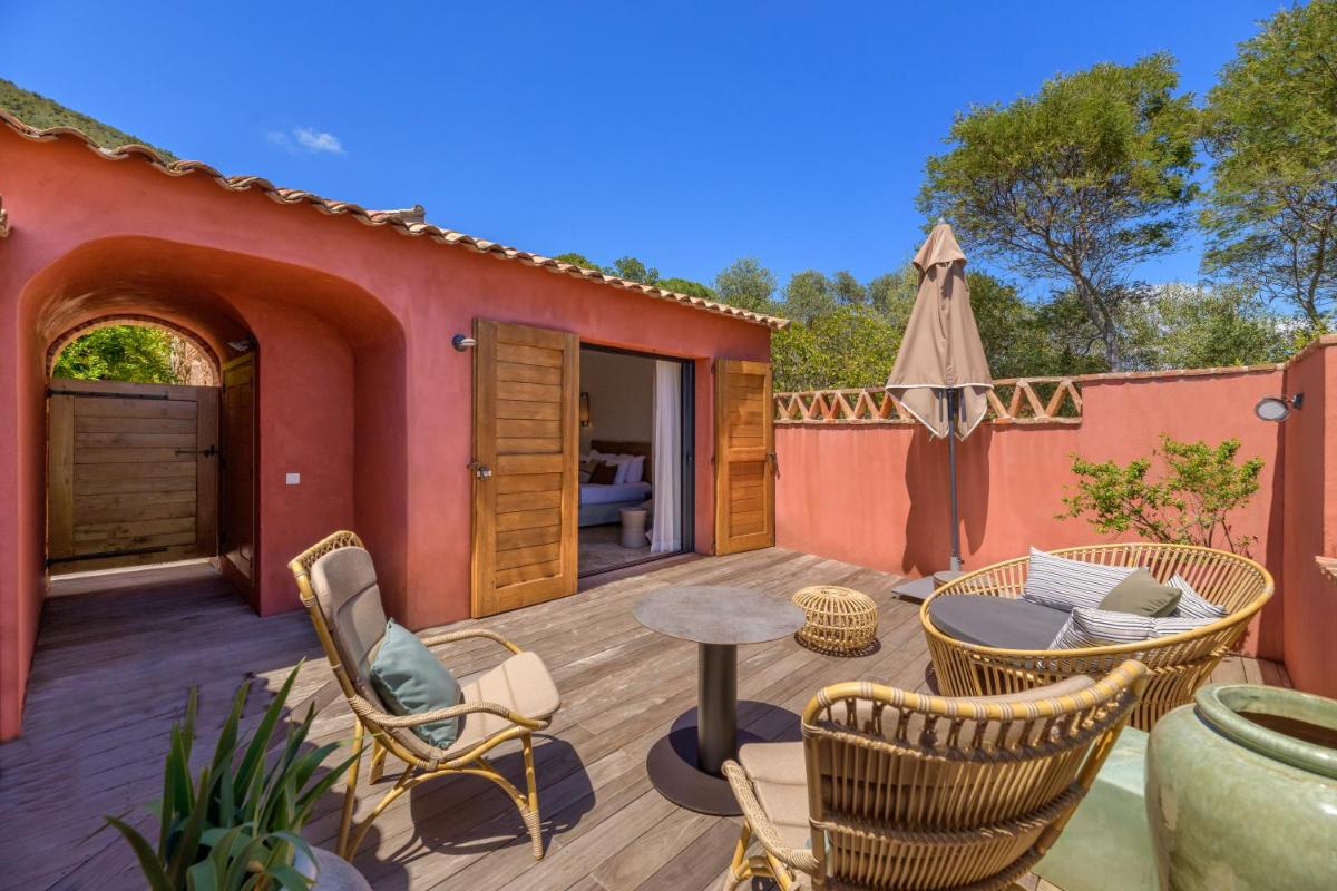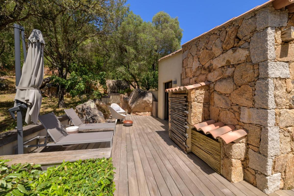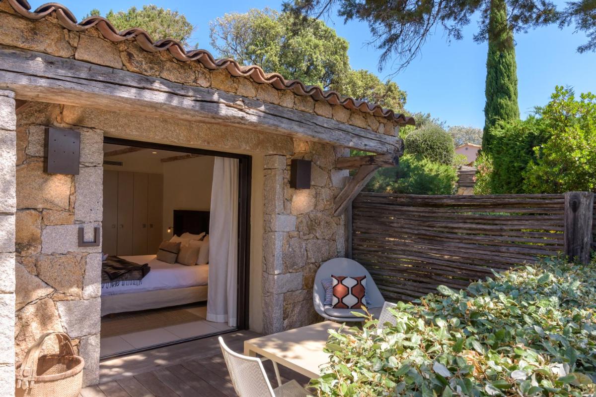La arquitectura del hotel se inspira en las tradicionales "bergeries" corsas (cabañas de pastores), con el uso de piedra local y materiales naturales, creando una armonía perfecta con el entorno circundante. Las lujosas habitaciones y suites, equipadas con todas las comodidades, se abren a terrazas privadas que ofrecen vistas impresionantes del mar y del paisaje virgen.