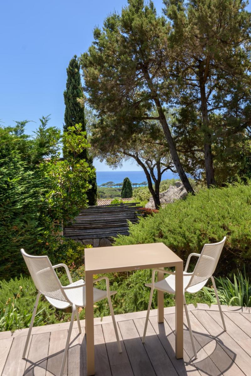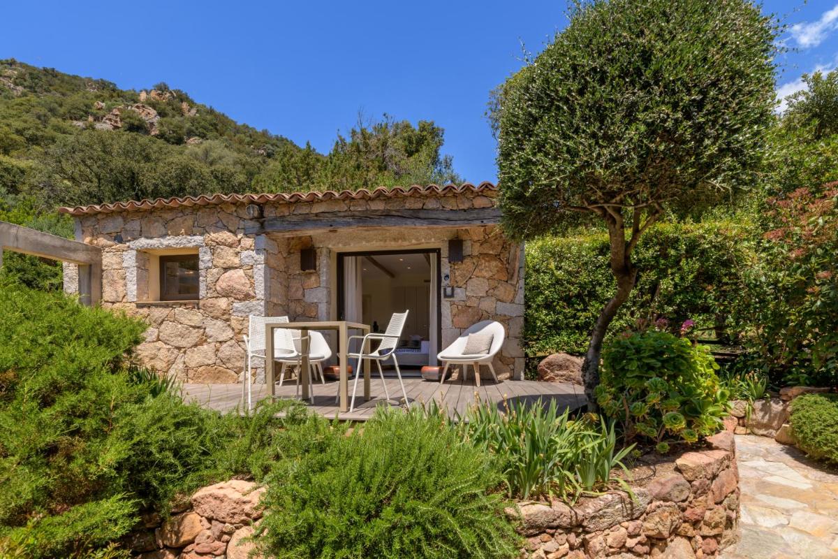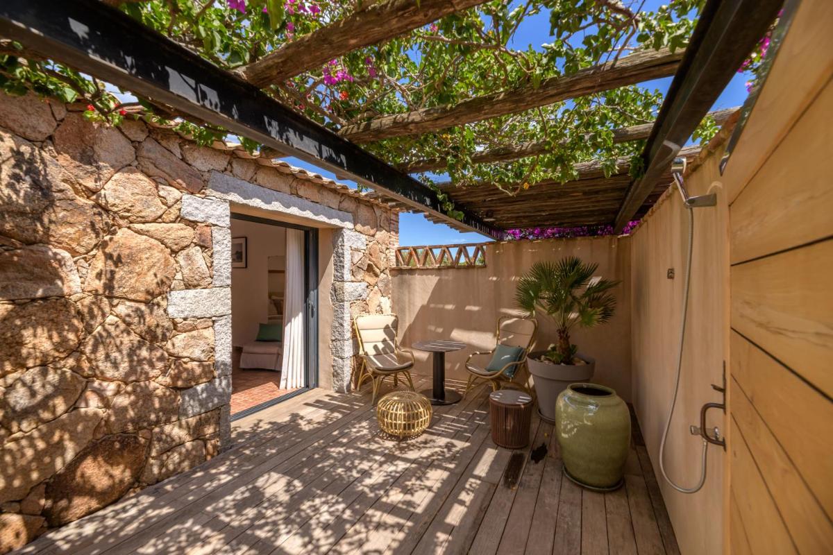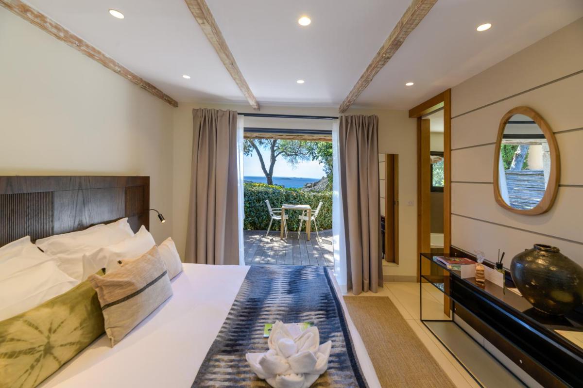La arquitectura del hotel se inspira en las tradicionales "bergeries" corsas (cabañas de pastores), con el uso de piedra local y materiales naturales, creando una armonía perfecta con el entorno circundante. Las lujosas habitaciones y suites, equipadas con todas las comodidades, se abren a terrazas privadas que ofrecen vistas impresionantes del mar y del paisaje virgen.