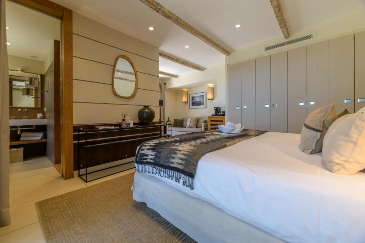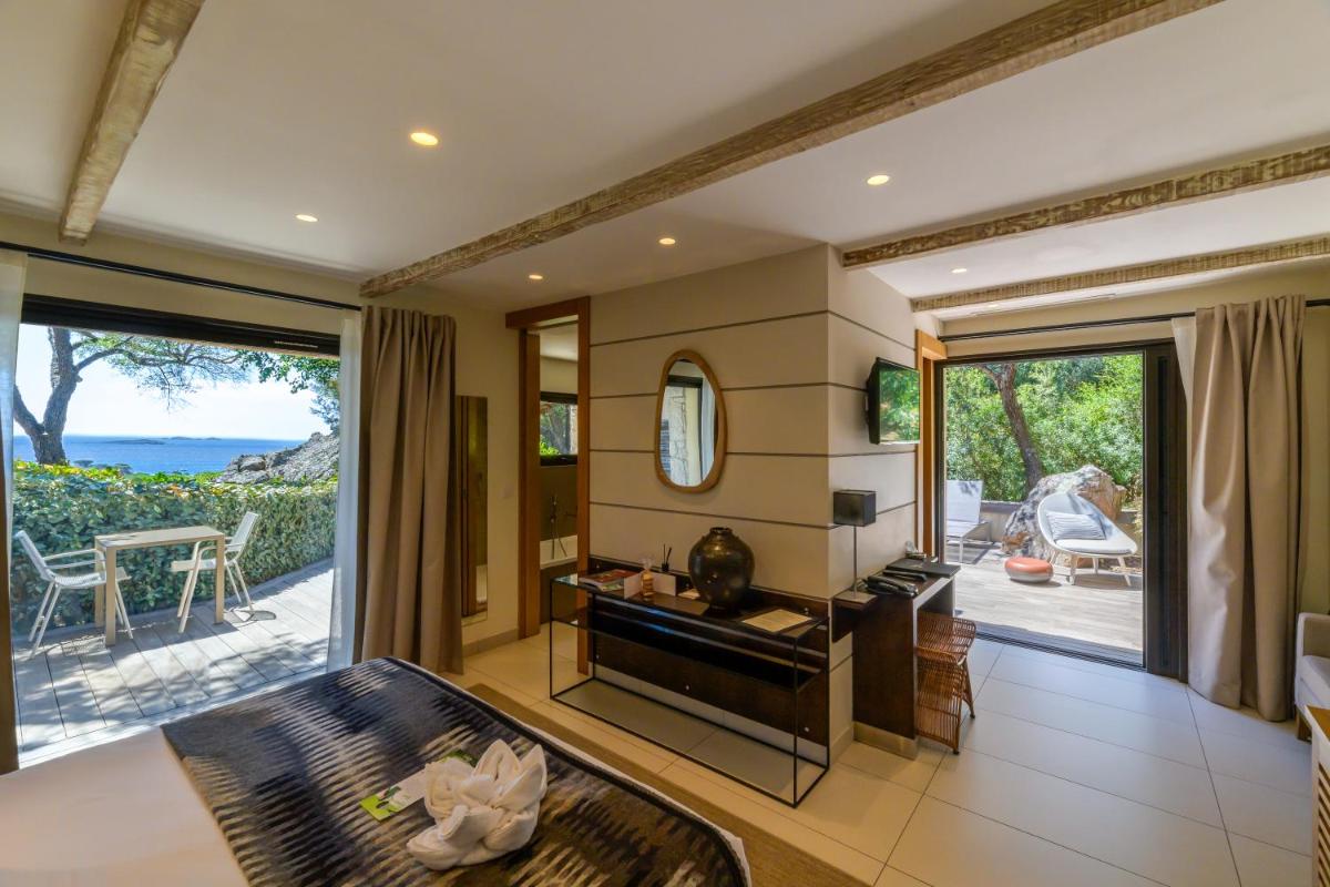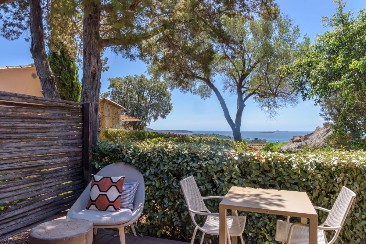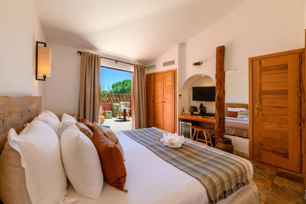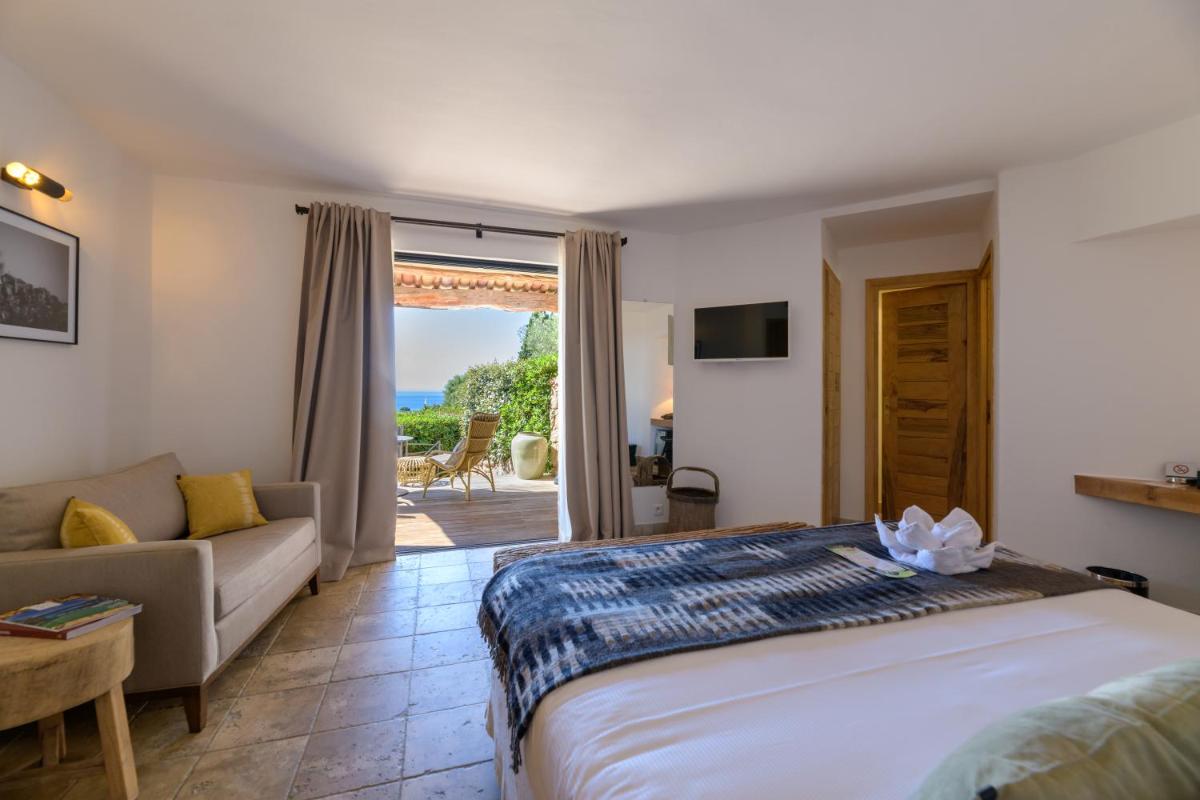 La arquitectura del hotel se inspira en las tradicionales "bergeries" corsas (cabañas de pastores), con el uso de piedra local y materiales naturales, creando una armonía perfecta con el entorno circundante. Las lujosas habitaciones y suites, equipadas con todas las comodidades, se abren a terrazas privadas que ofrecen vistas impresionantes del mar y del paisaje virgen.
