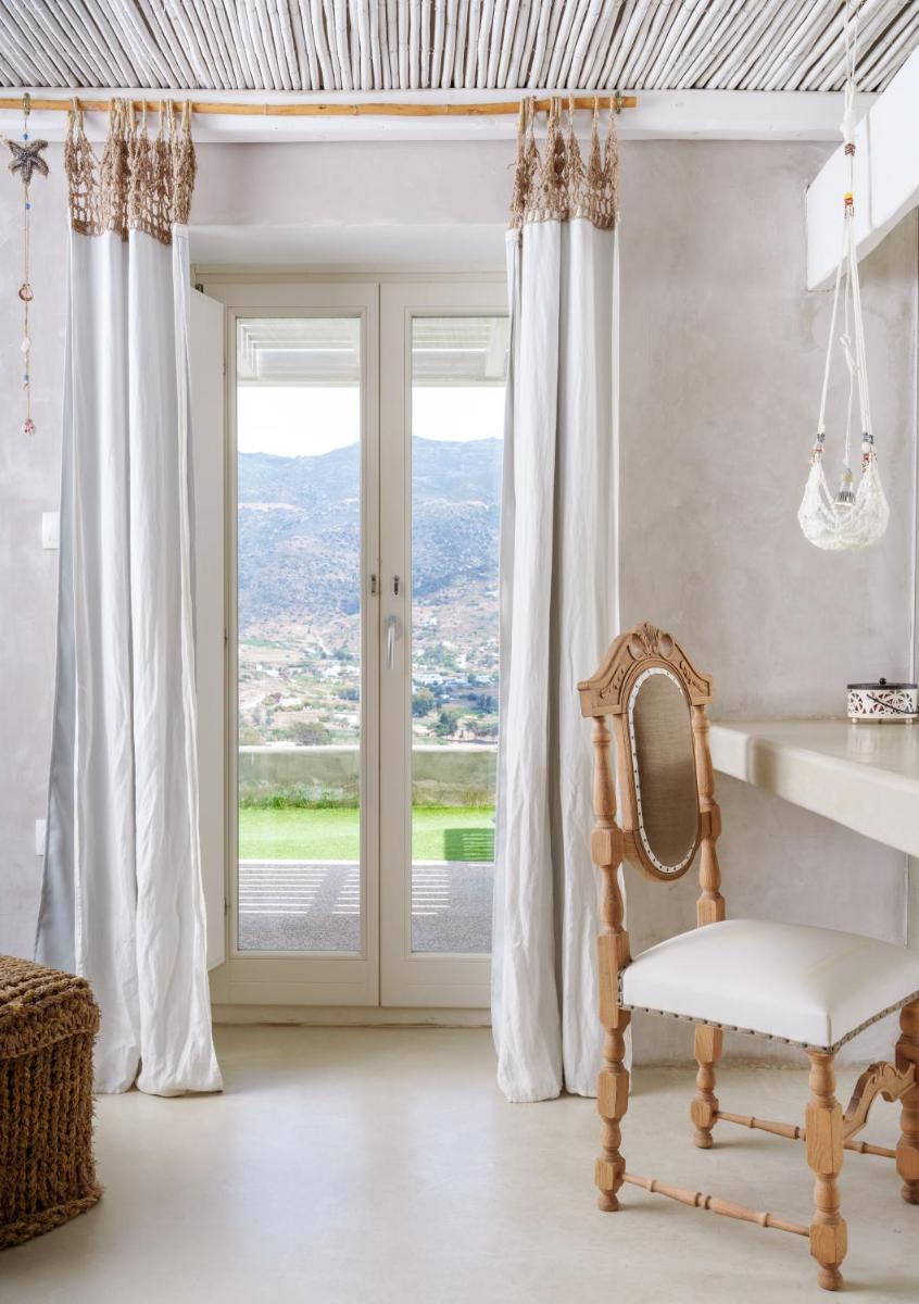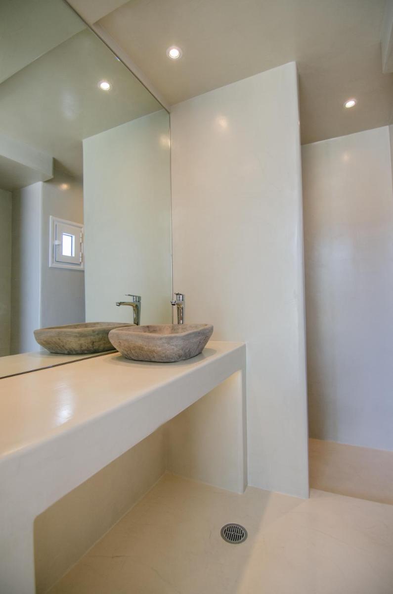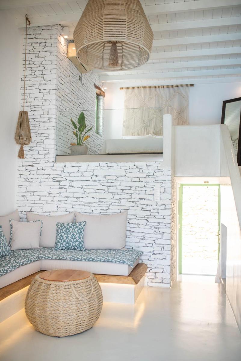 Los alojamientos, todos con vistas panorámicas al Mar Egeo, se caracterizan por paredes blancas, mobiliario minimalista y toques de color que recuerdan el azul intenso del mar. Cada habitación o suite ofrece un balcón o una terraza privada, proporcionando un refugio de paz para admirar el paisaje icónico de la isla. Las habitaciones están diseñadas para maximizar la luz natural y la sensación de espacio.
