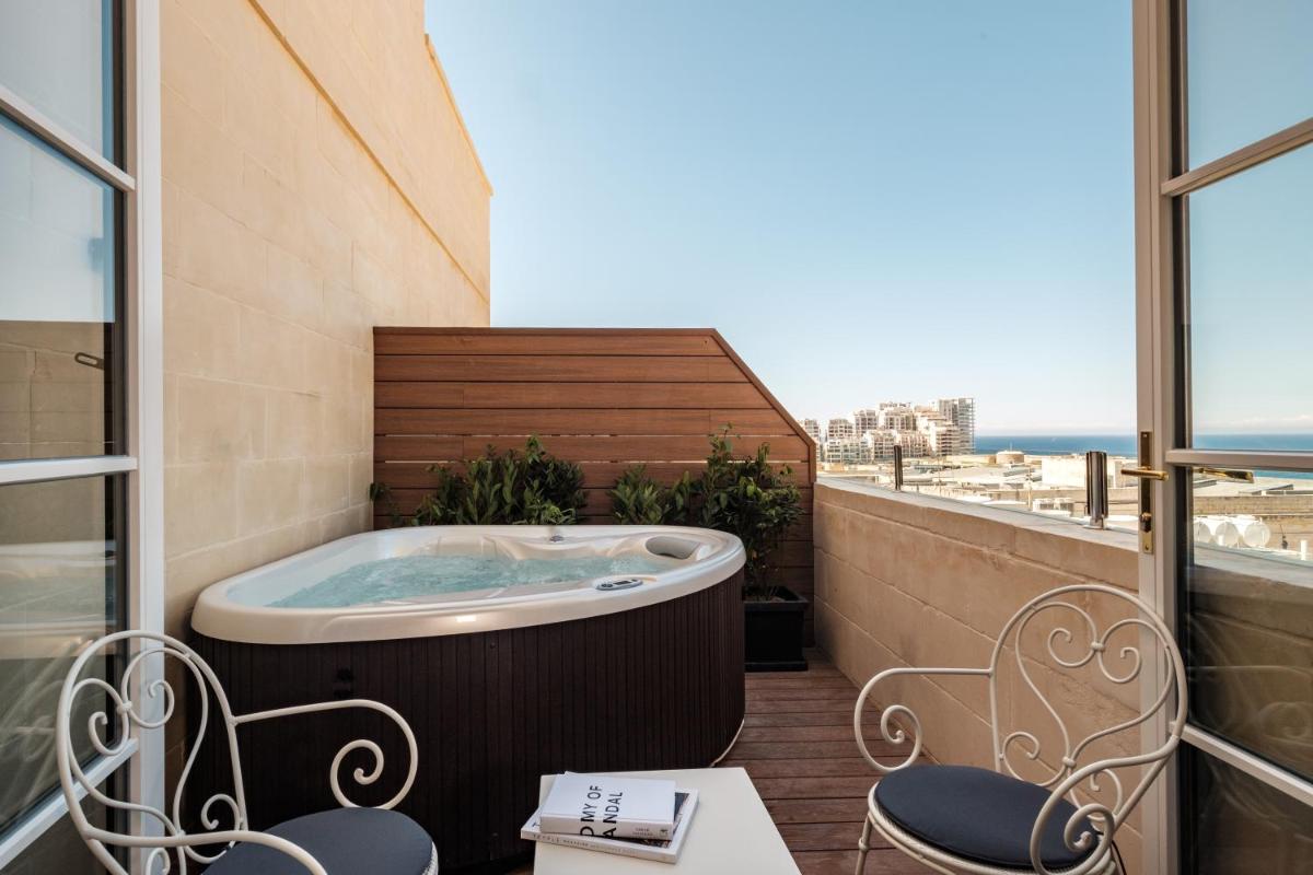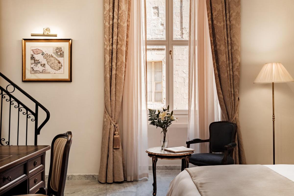 Las habitaciones y suites se caracterizan por techos altos, decoraciones de época restauradas y una decoración que fusiona la elegancia clásica con toques modernos. El uso de telas ricas, mármoles preciosos y obras de arte seleccionadas confiere a cada espacio una atmósfera de lujo atemporal. Muchas suites ofrecen balcones tradicionales malteses, con vistas a las calles históricas.