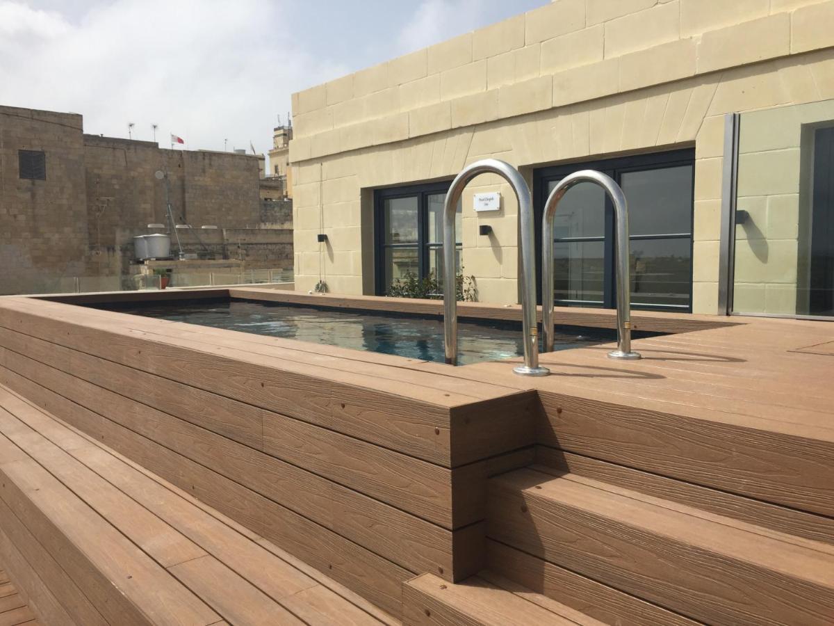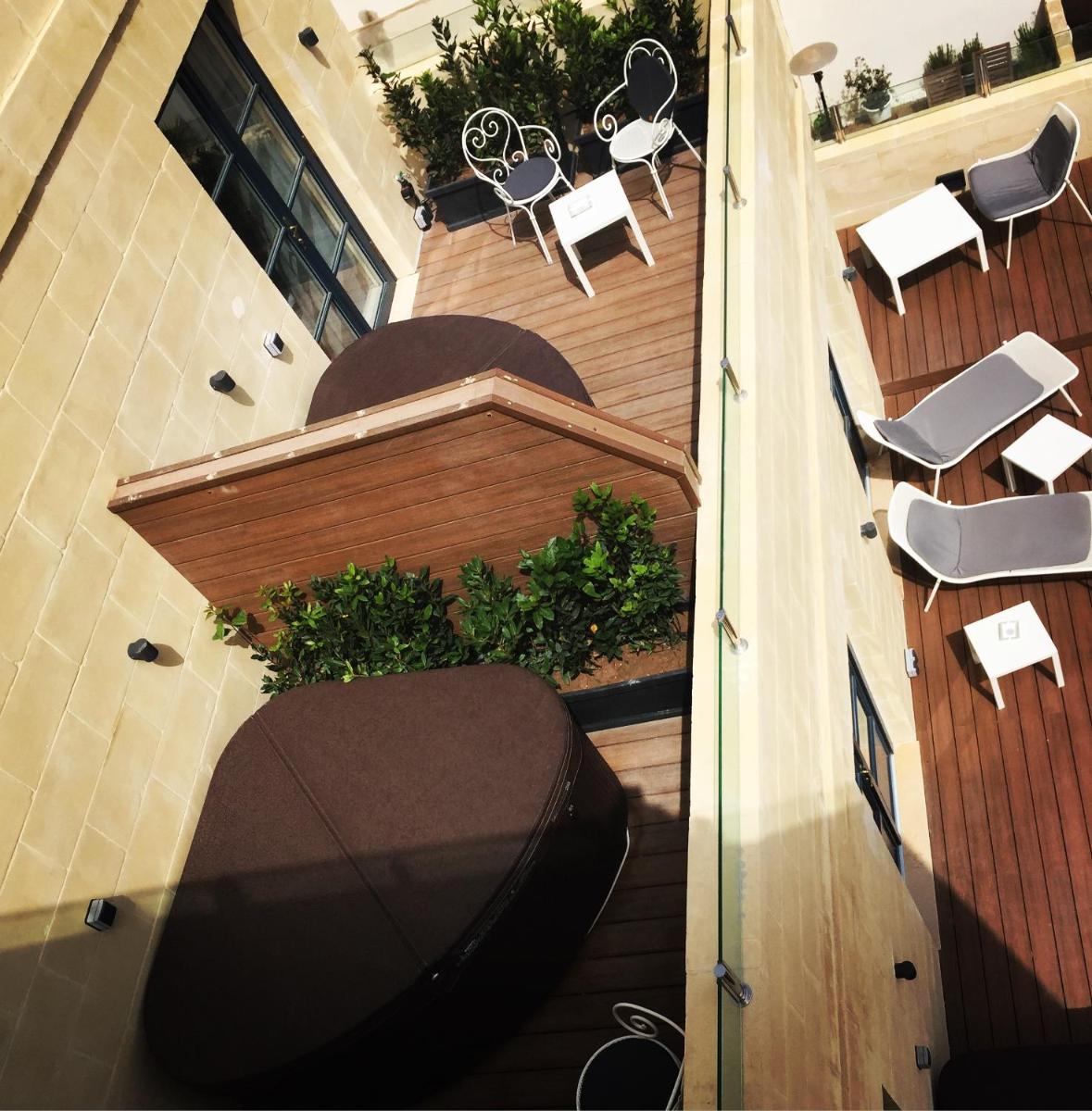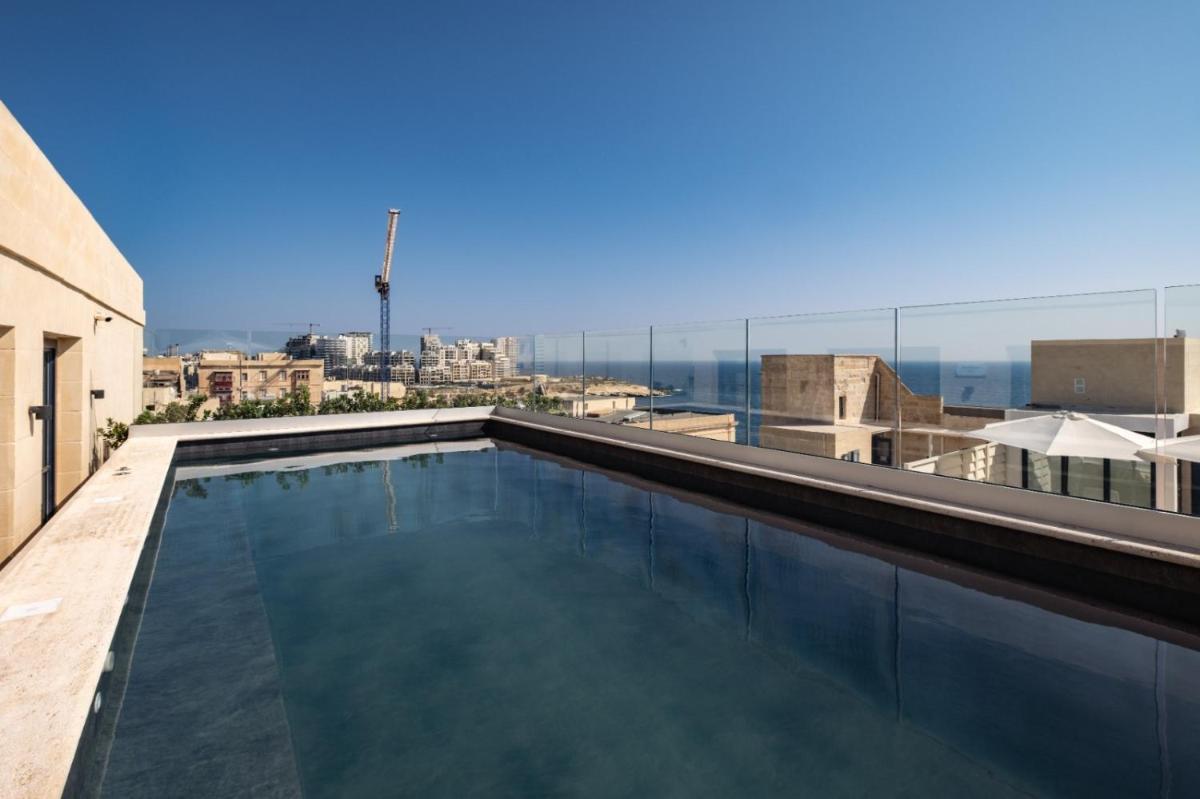 El punto culminante del Palais Le Brun es sin duda su espléndida piscina exterior en la azotea. Este espacio ofrece una vista parcial pero sugerente sobre los tejados de La Valeta y el Gran Puerto, un lugar de relajación inigualable para disfrutar del sol maltés y un cóctel. El solárium circundante está amueblado con elegantes tumbonas, asegurando una experiencia de lujo en altura.