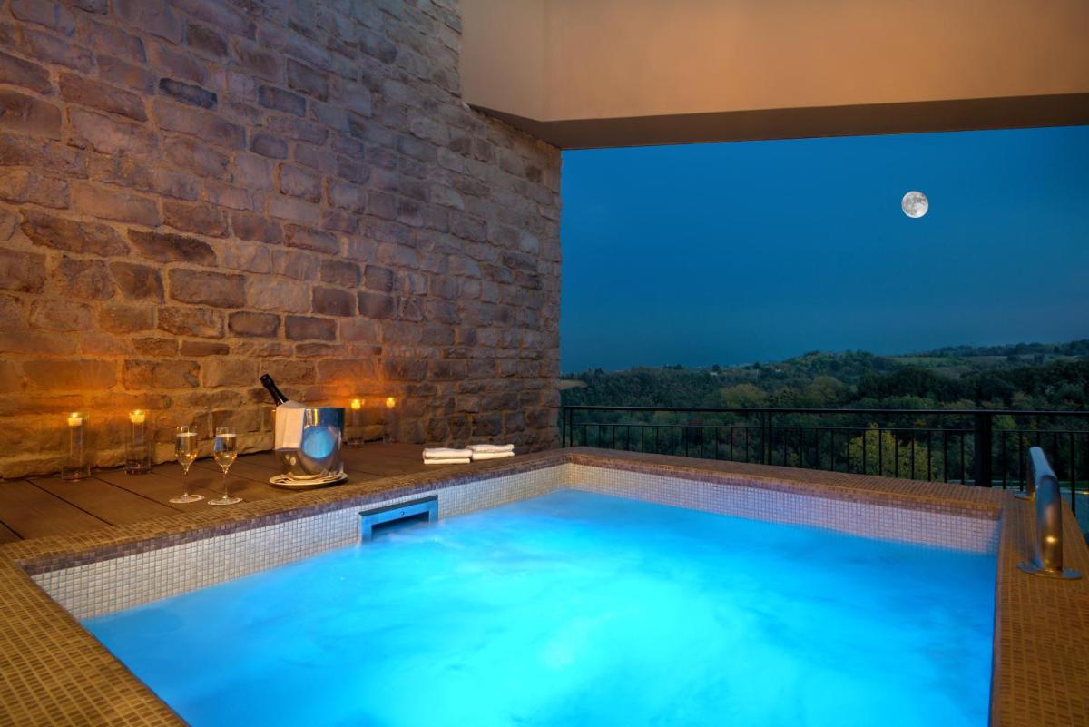 Los alojamientos del Palazzo di Varignana, incluidas las Habitaciones Deluxe y Suites, están diseñados para ofrecer el máximo confort y privacidad. Muchas habitaciones cuentan con un balcón o patio privado con vistas impresionantes al paisaje montañoso. Las lujosas Vital Suites y Suites con Bañera de Hidromasaje ofrecen espacios más grandes y comodidades adicionales, como spas privados en la habitación en algunos alojamientos. Todos los huéspedes se benefician de Wi-Fi Gratuito, aire acondicionado y un set completo de artículos de tocador de cortesía.