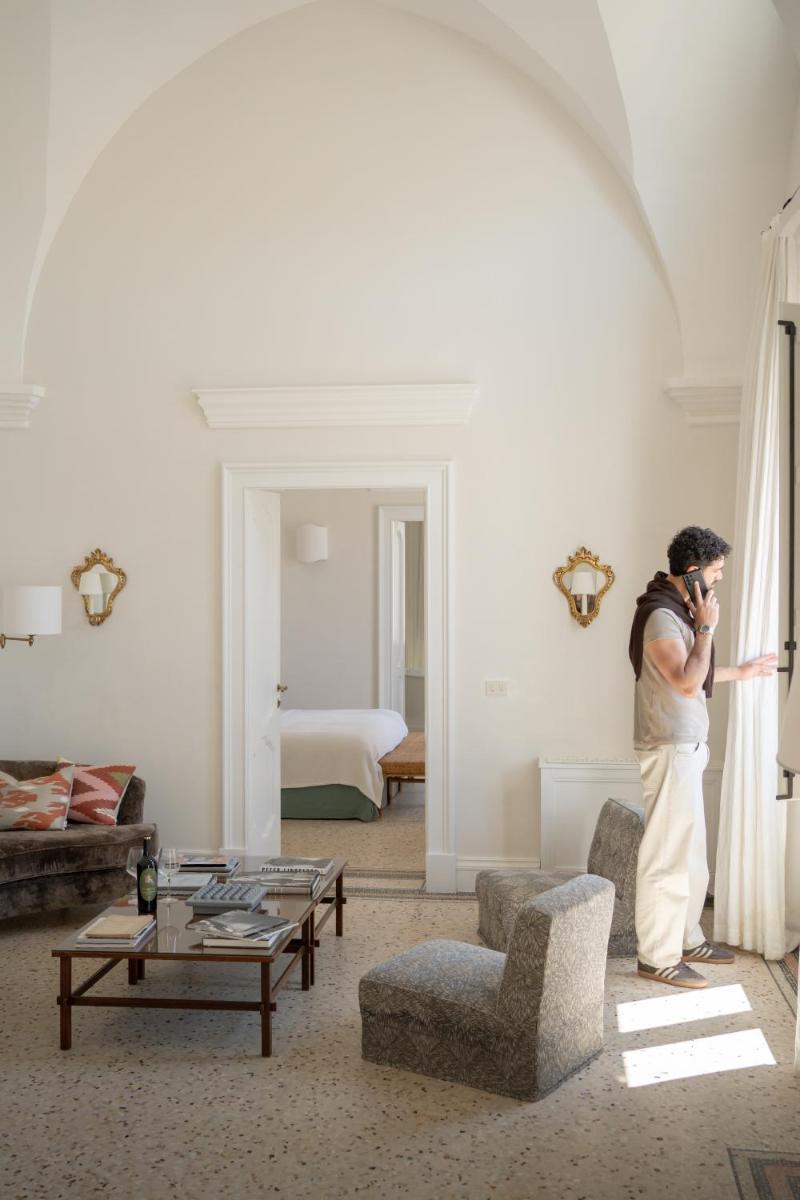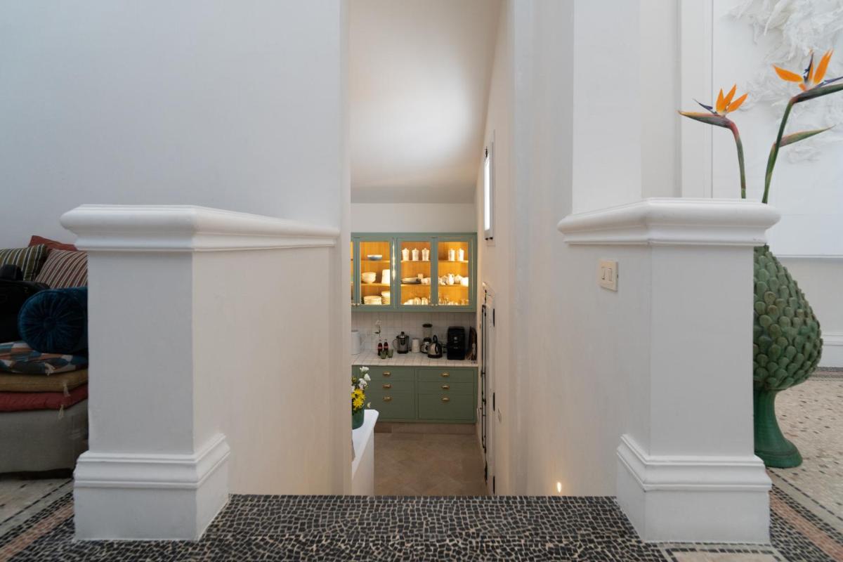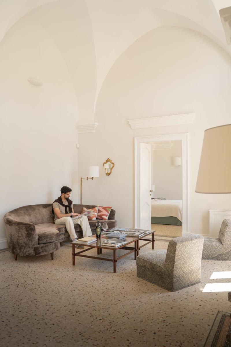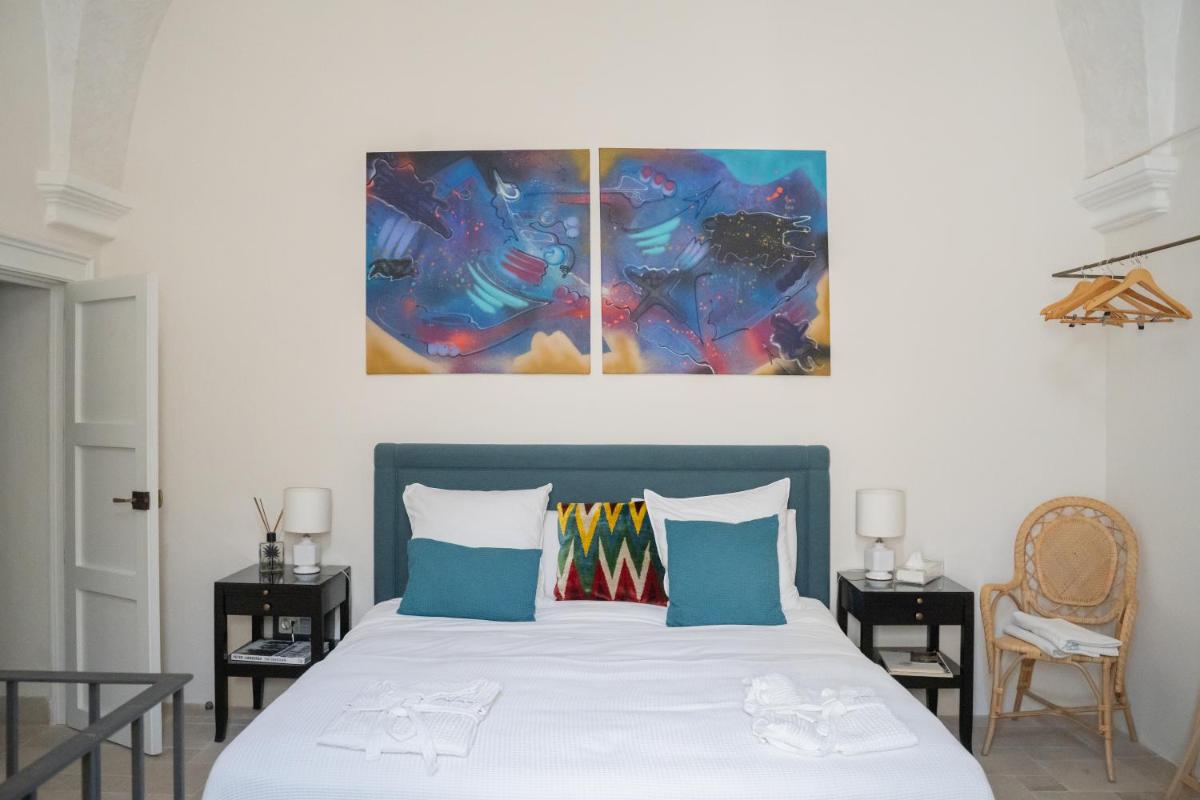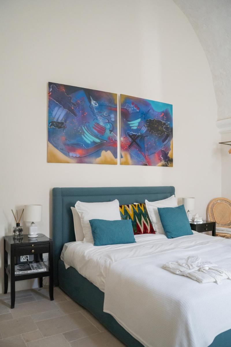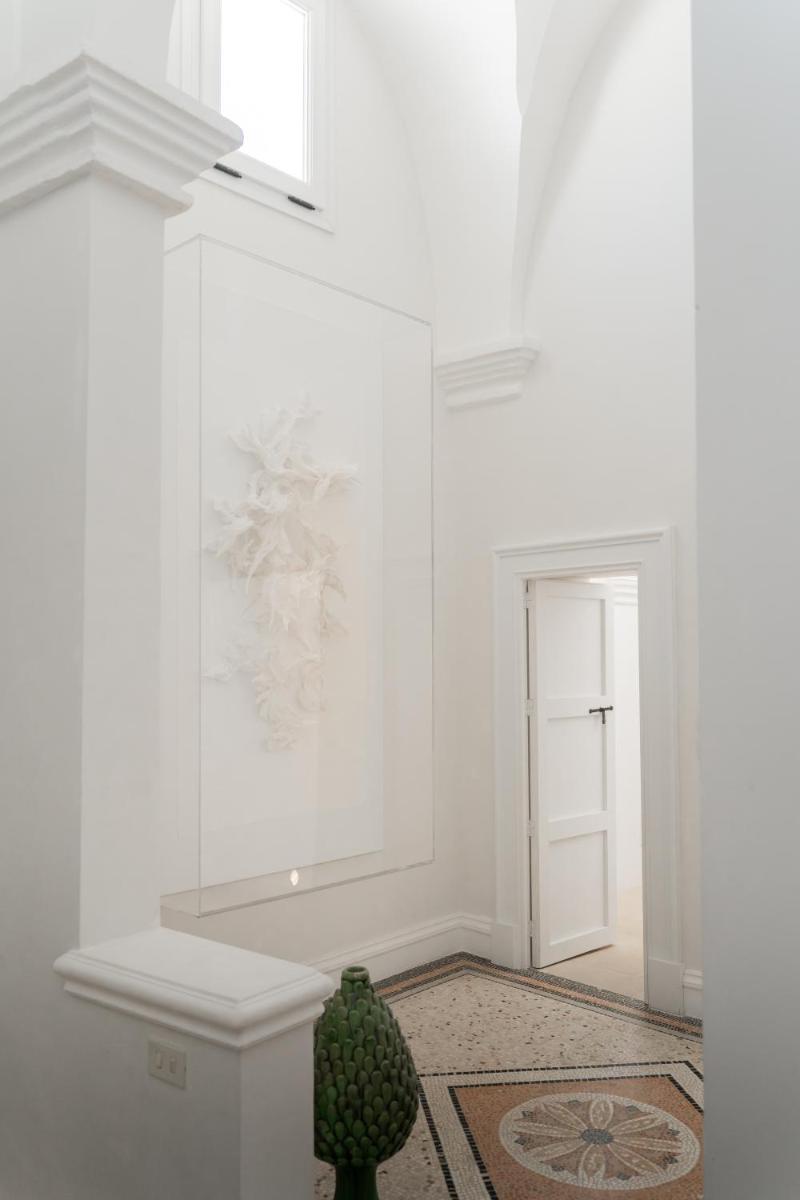 Los espacios comunes están decorados con arte moderno. La cocina de la Royal Suite es ideal para compartir comidas con productos típicos del Salento en un entorno acogedor.