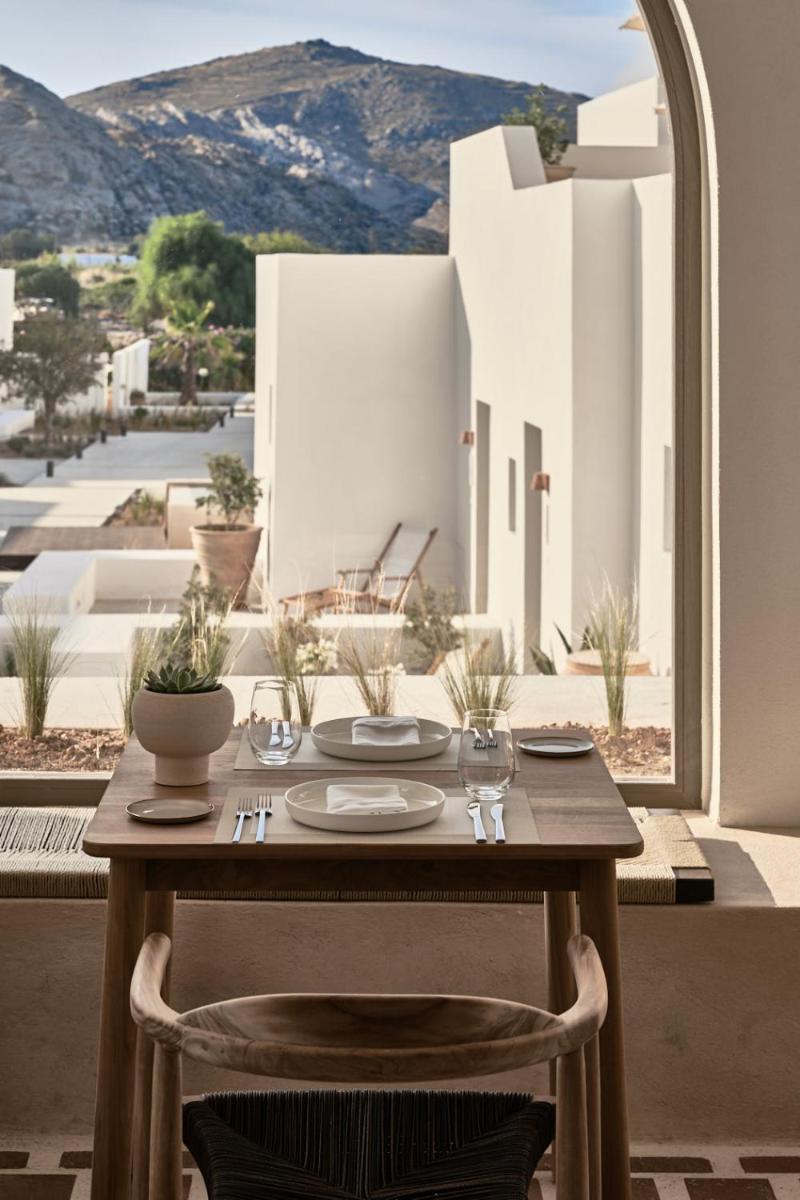El centro visual del hotel es la magnífica piscina central en forma de cruz griega, rodeada de lujosas tumbonas y amplias áreas lounge. La zona exterior se caracteriza por jardines de roca y vegetación autóctona, que ofrecen un ambiente de absoluta tranquilidad y privacidad, ideal para disfrutar del clima de Paros.