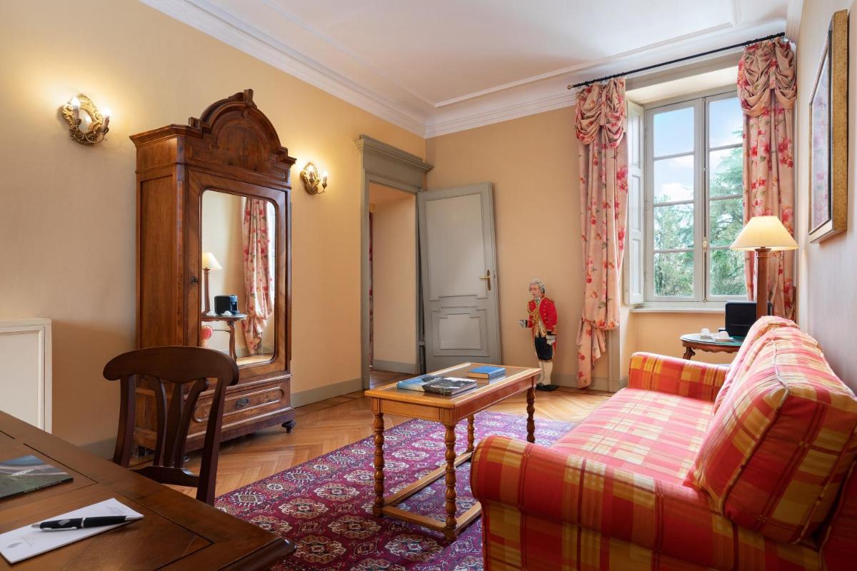 Las 43 habitaciones y suites se distribuyen entre la Villa principal, los Establos (`Scuderie`) y otros anexos como la Orangerie, creando ambientes cálidos y acogedores. Cada alojamiento es único, con un estilo country chic, mobiliario original y telas preciosas. Todas las habitaciones disponen de amplios cuartos de baño en mármol o granilla. Las categorías superiores, como las Suites y las Suites de dos niveles (52 m²), ofrecen un lujo adicional con una bañera de hidromasaje privada (Jacuzzi) en la habitación o el baño.