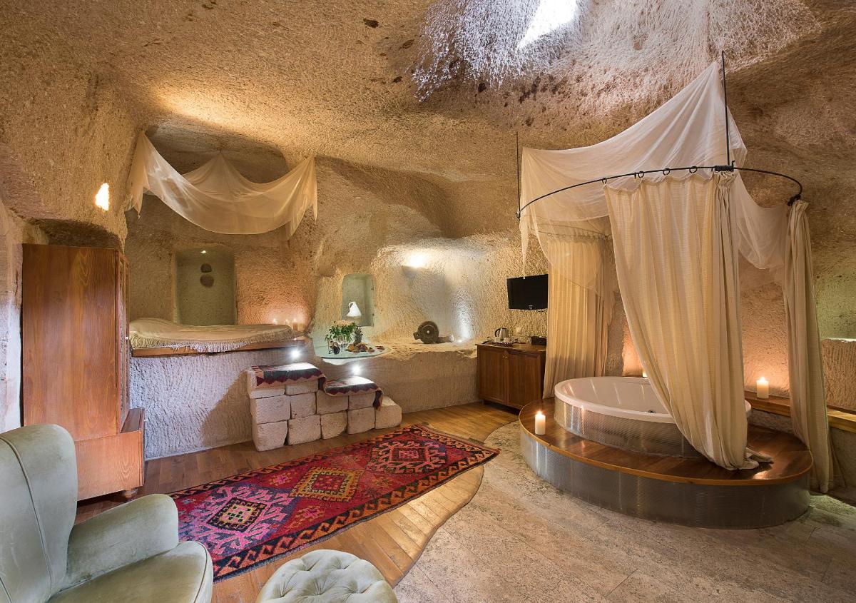Cette suite luxueuse offre une vue sur les cheminées de fées de Göreme. Elle comprend une terrasse privée, une cheminée, une télévision à écran plat, une bouilloire électrique et un minibar. Elle comporte également un salon séparé, une douche double et un jacuzzi. Sa salle de bains privative est pourvue d'un sèche-cheveux, de chaussons, d'articles de toilette gratuits et d'un peignoir. Les serviettes et le linge de maison sont fournis.