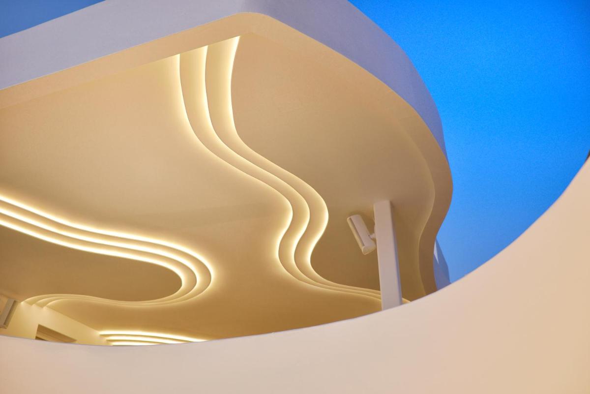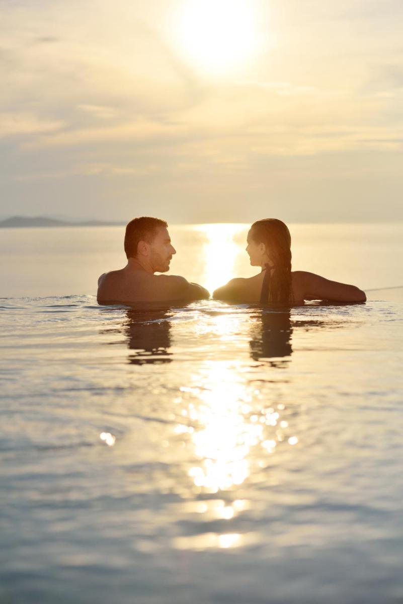La propriété présente la couleur blanche emblématique, combinée à la pierre locale et au bois, avec une grande piscine à débordement à plusieurs niveaux qui semble se fondre dans la mer. De nombreuses suites et villas offrent également des piscines privées à débordement ou des jacuzzis.