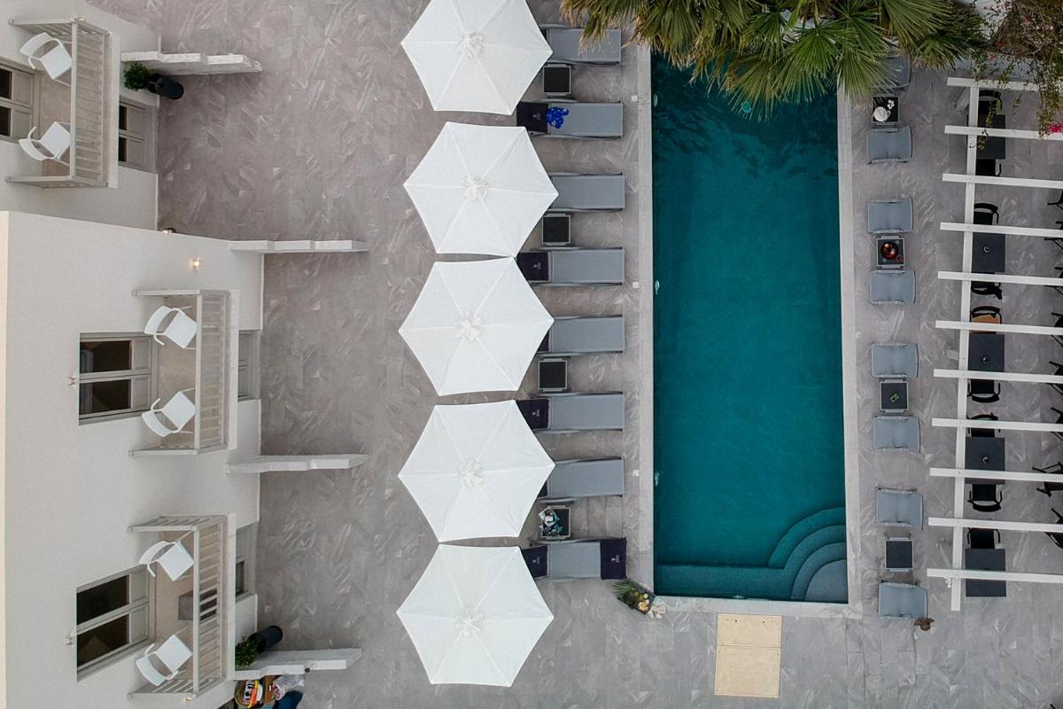 Le cœur battant d'Angels Pillow est sa splendide piscine, conçue comme un salon extérieur. Ici, les hôtes peuvent se détendre sur des lits de repos design en sirotant des cocktails signature préparés avec des ingrédients frais. C'est le lieu idéal pour de longues heures d'oisiveté régénératrice, bercé par une playlist soignée qui accompagne le coucher du soleil grec.