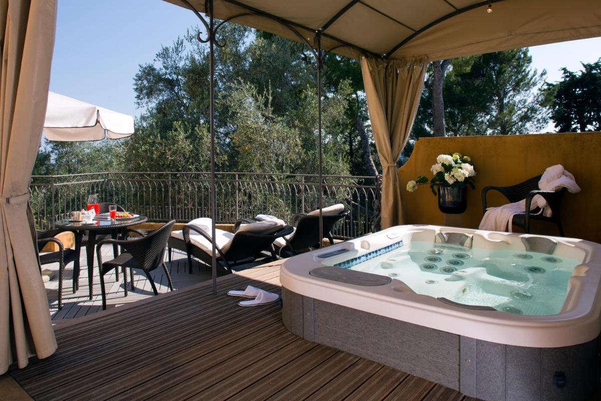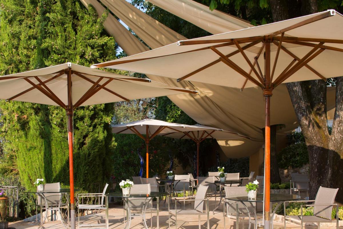 Les jardins de la Bastide sont un véritable hommage à la tradition de la parfumerie de Grasse. Les hôtes peuvent se promener parmi des oliviers centenaires et des plantes aromatiques, profitant de panoramas à couper le souffle. L'atmosphère est d'élégance et de sérénité, avec de nombreux coins isolés pour la détente.