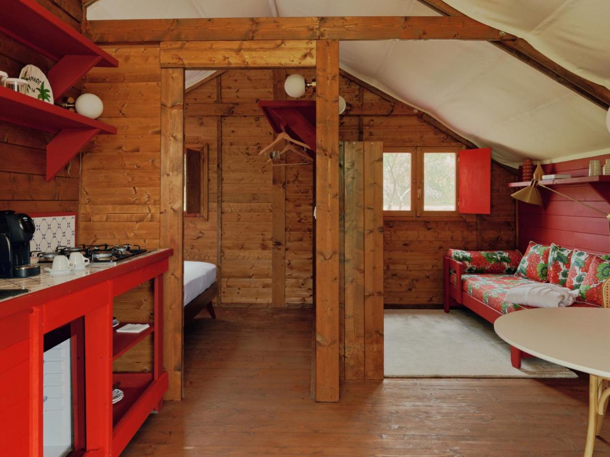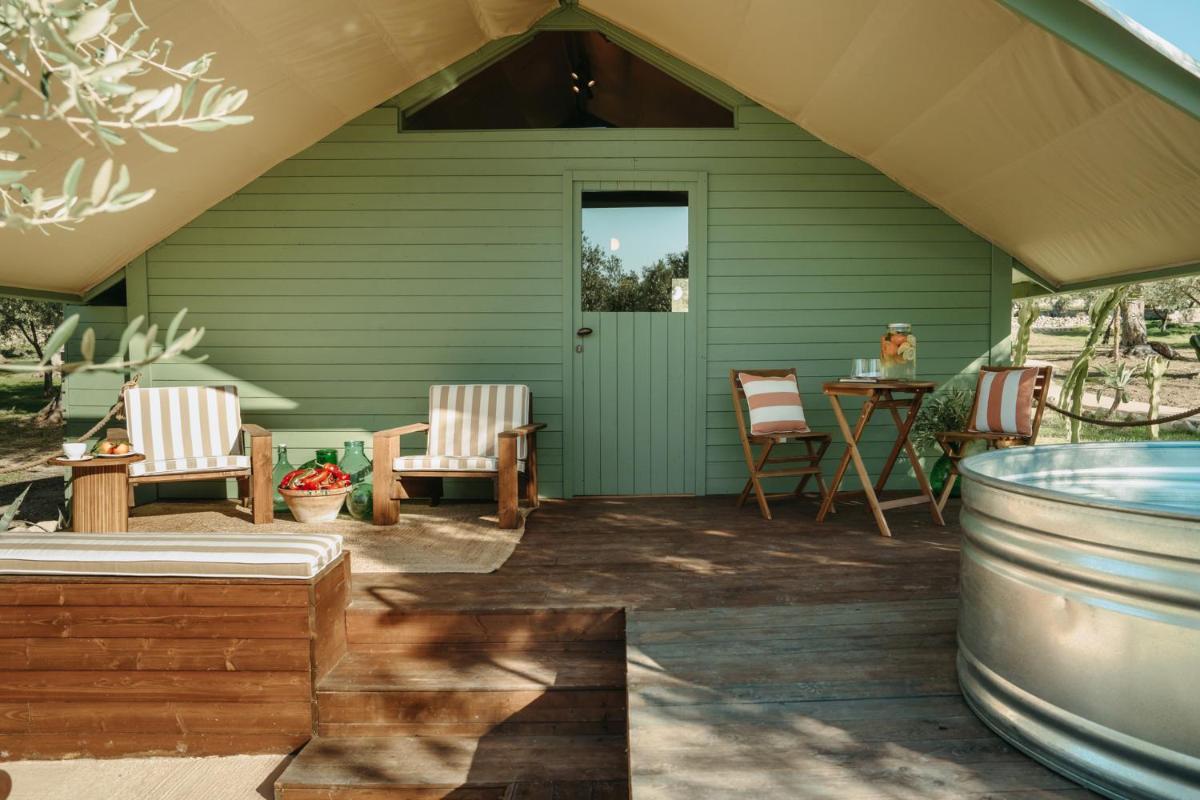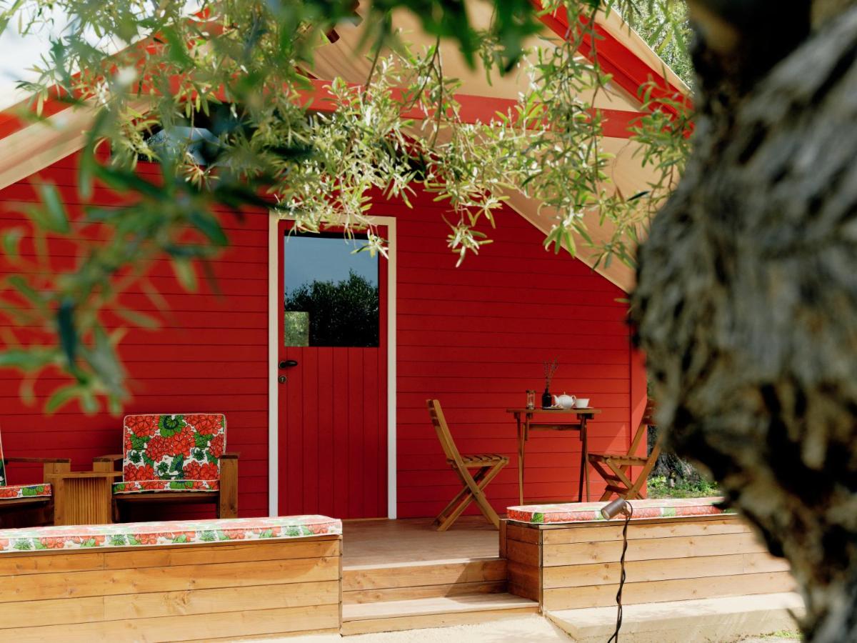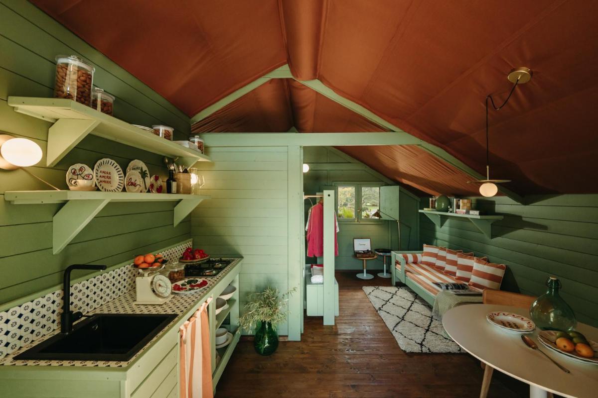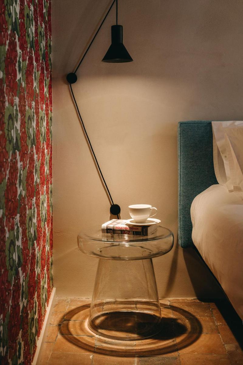 La piscine privée arbore un damier rouge et blanc unique, hommage aux motifs rétro des sols de cuisine. Entourée de lits de repos colorés, elle invite à la flânerie au sein de l’oliveraie, dans une atmosphère à la fois champêtre et sophistiquée.