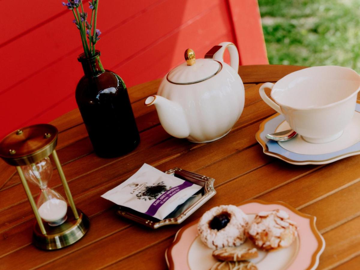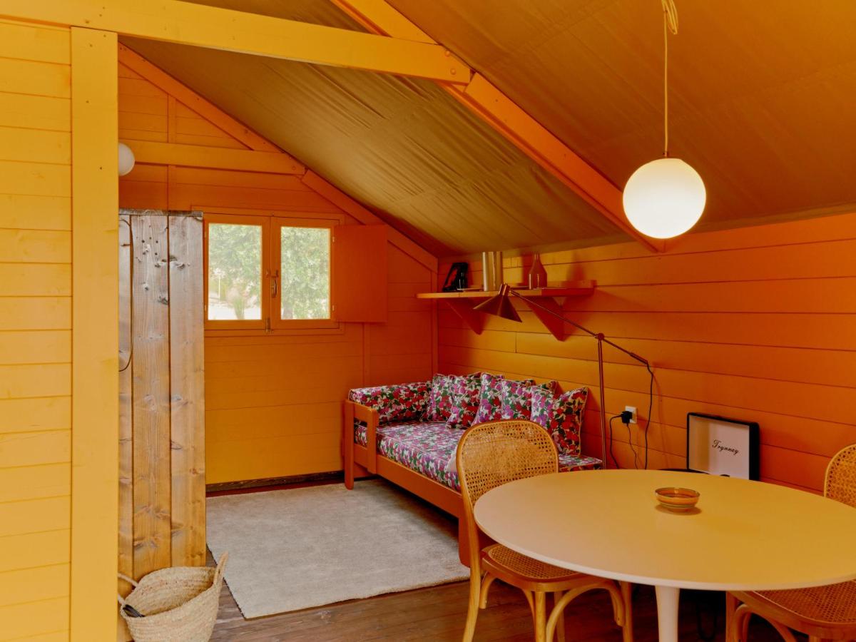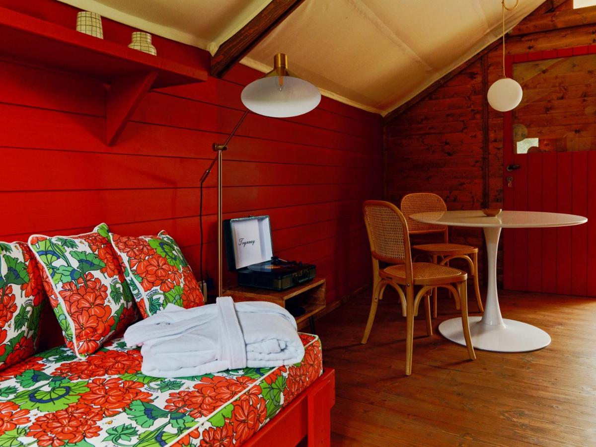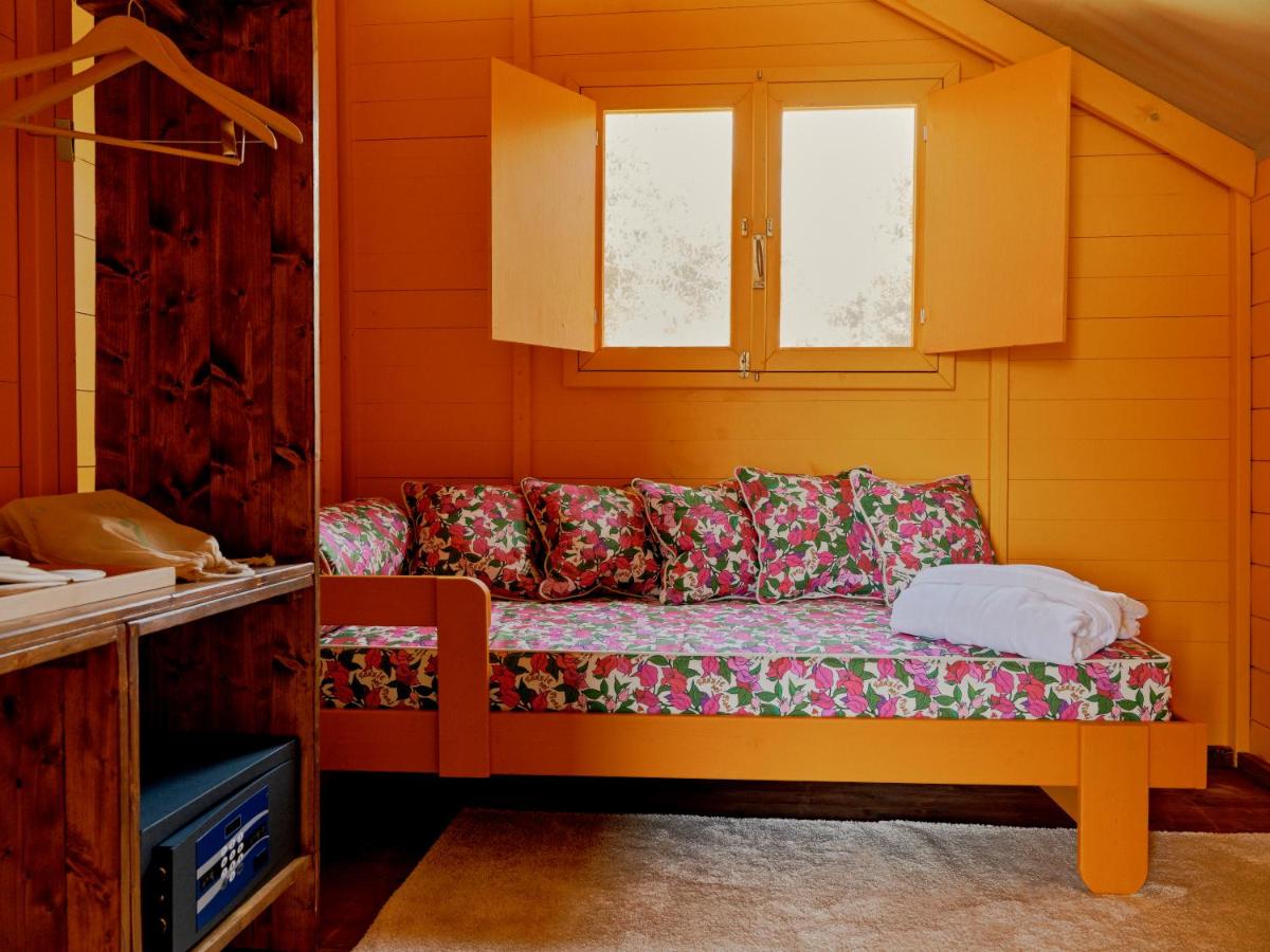 La piscine privée arbore un damier rouge et blanc unique, hommage aux motifs rétro des sols de cuisine. Entourée de lits de repos colorés, elle invite à la flânerie au sein de l’oliveraie, dans une atmosphère à la fois champêtre et sophistiquée.
