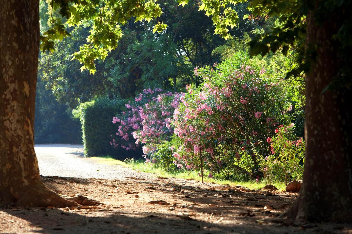 À l'extérieur, le domaine offre de vastes espaces de détente, y compris une grande piscine entourée d'arbres et un parc de plusieurs hectares. L'environnement est d'une tranquillité absolue, idéal pour des promenades entre les rangs de vigne et pour profiter de la lumière et des parfums caractéristiques de la campagne provençale.