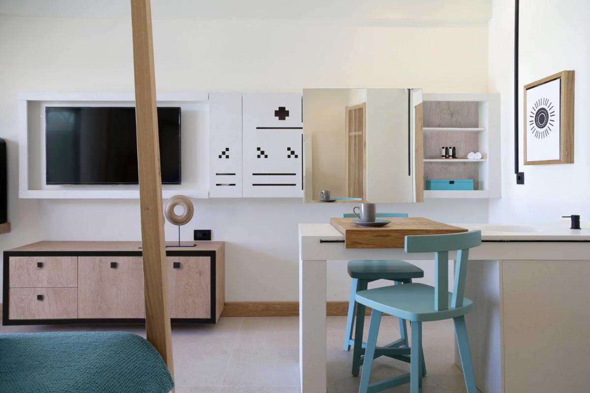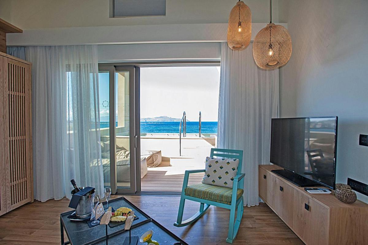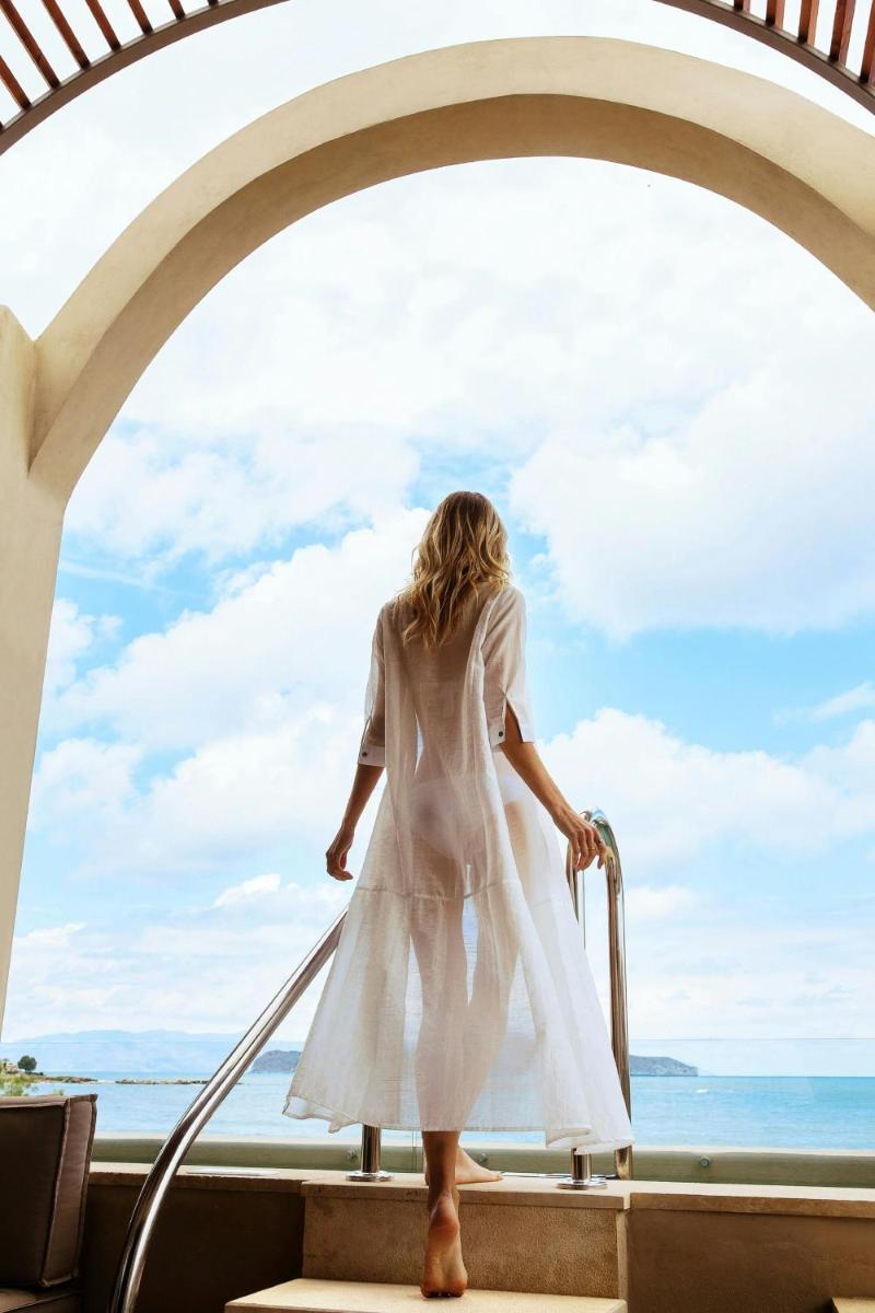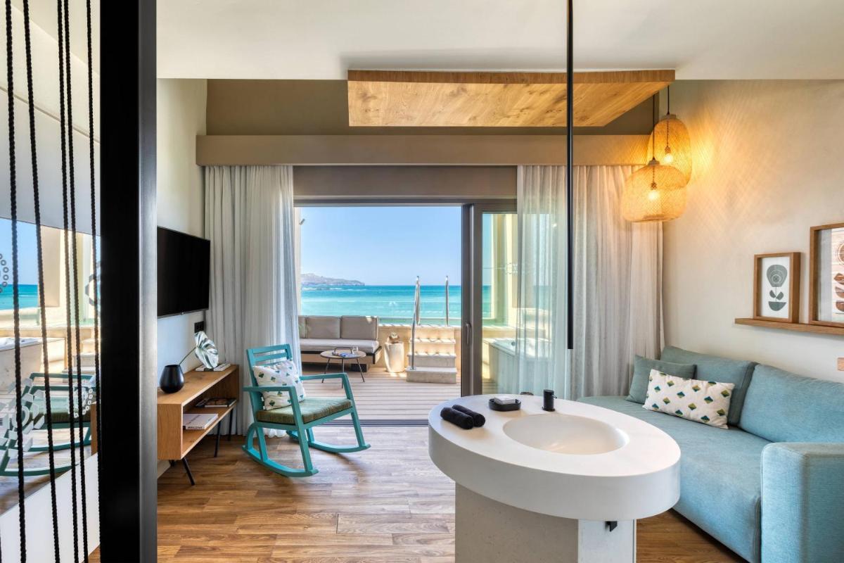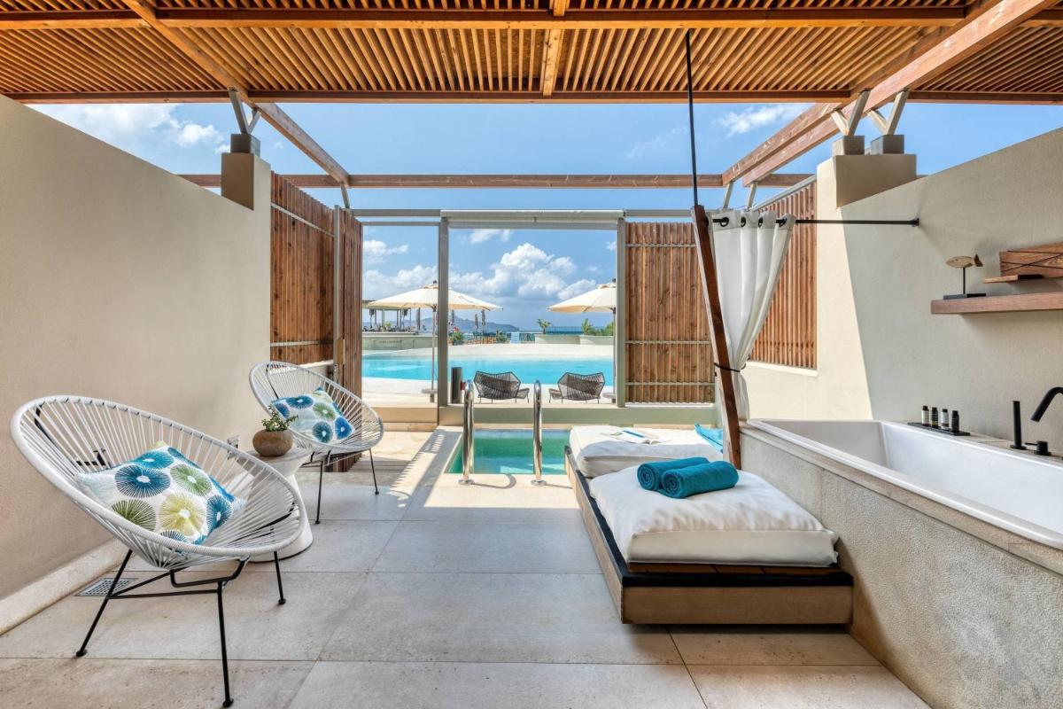 Le design se distingue par des lignes épurées, du béton apparent, du bois naturel et une palette de couleurs neutres qui reflète le sable et la mer crétoise. Presque toutes les chambres et suites disposent de piscines ou de bains à remous privés, créant un refuge intime avec vue sur la Méditerranée, parfait pour les couples.