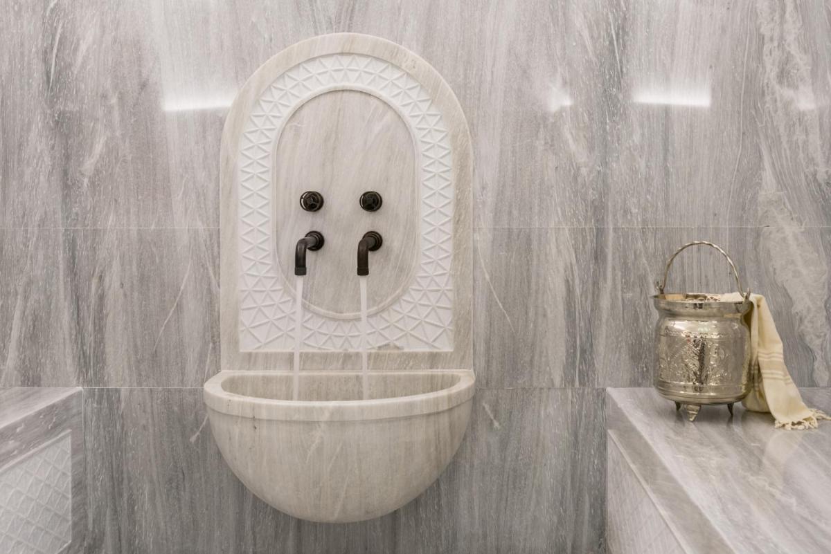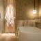 - une salle de bains en marbre de luxe en onyx munie d'une douche et/ou d'une baignoire