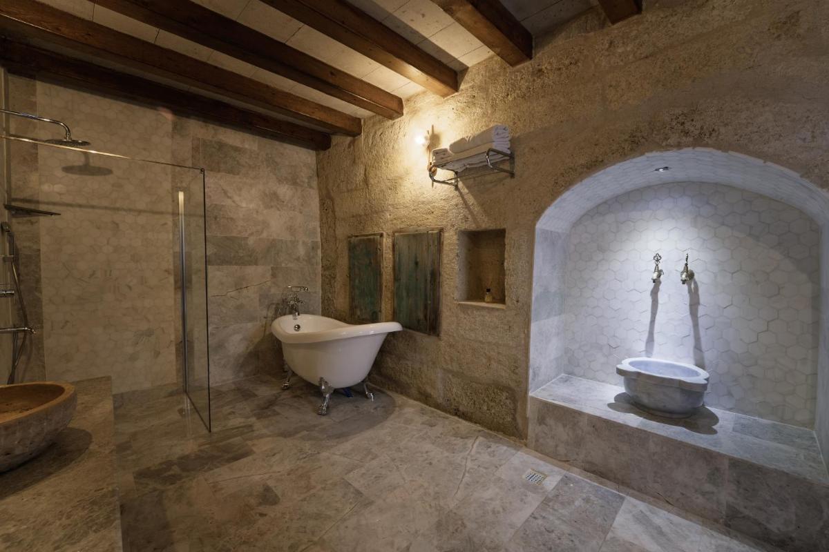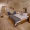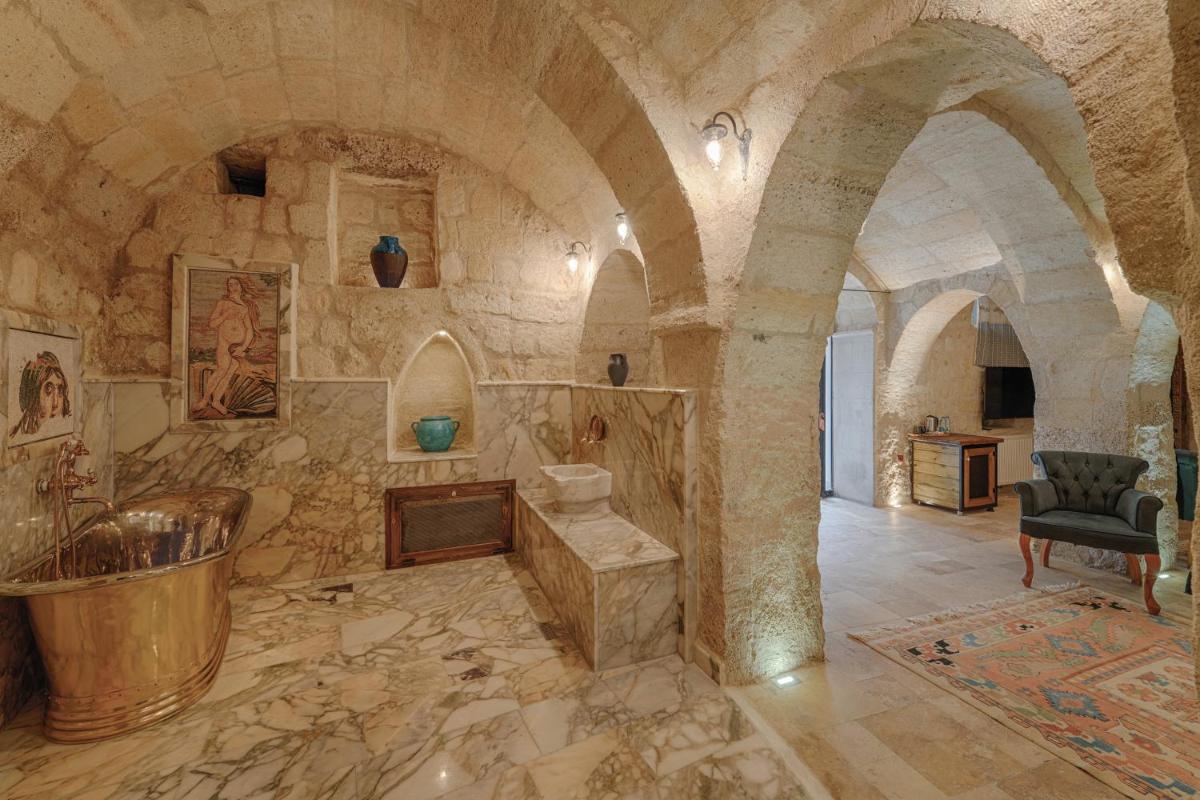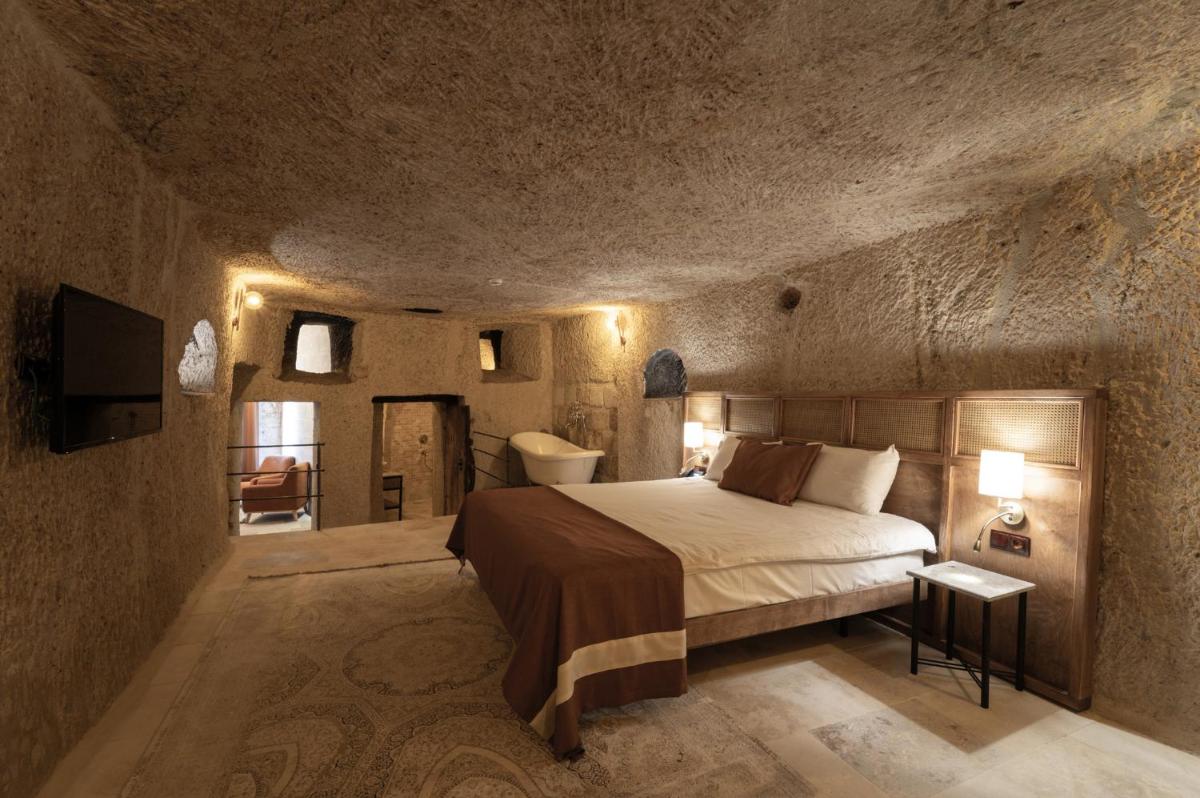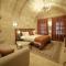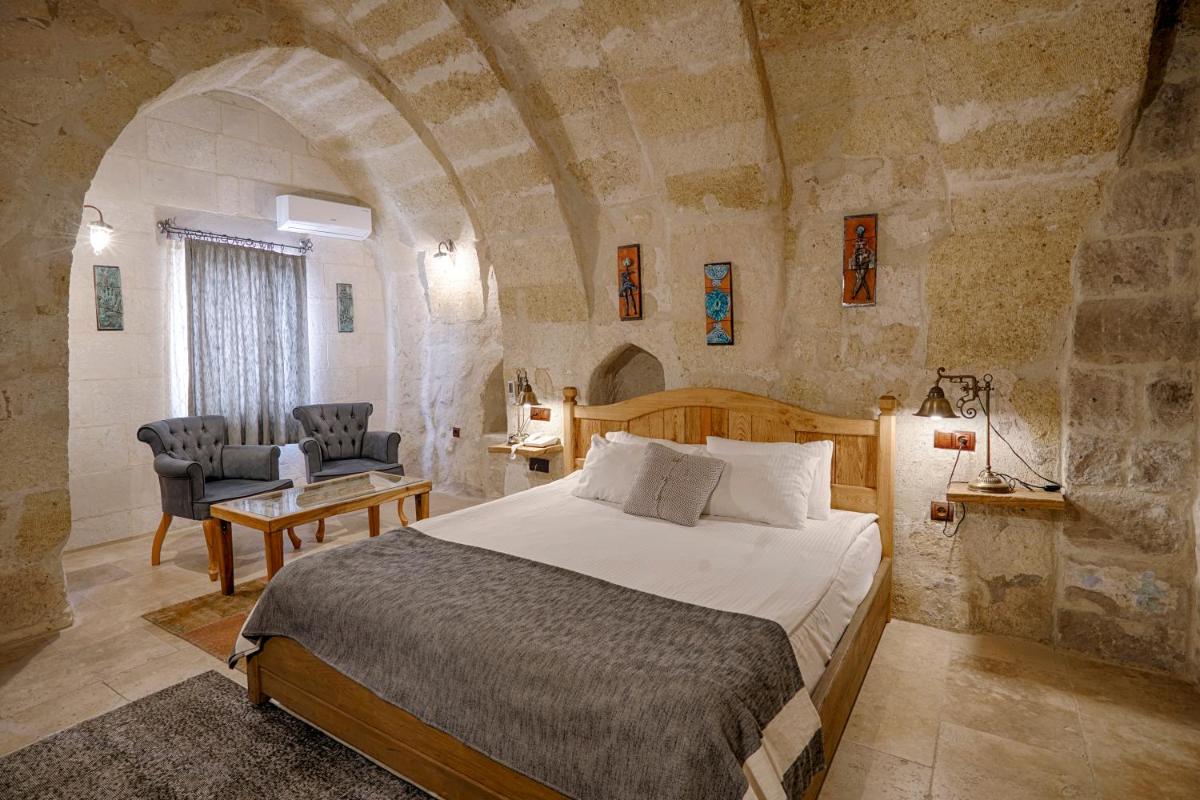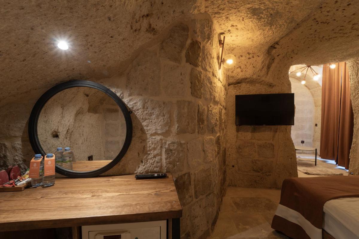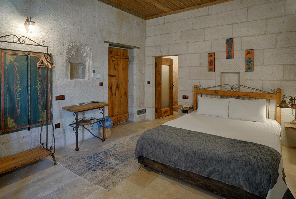 Les 6 chambres ont été rénovées en respectant la structure historique, préservant les murs en pierre d'origine. Le design intérieur, de style traditionnel rustique, est agrémenté d'artefacts qui racontent l'histoire de la région. La caractéristique la plus captivante est la possibilité de profiter de vues à couper le souffle sur les vallées et le volcan Erciyes, et d'admirer le spectacle des montgolfières au lever du soleil directement depuis les terrasses en pierre.