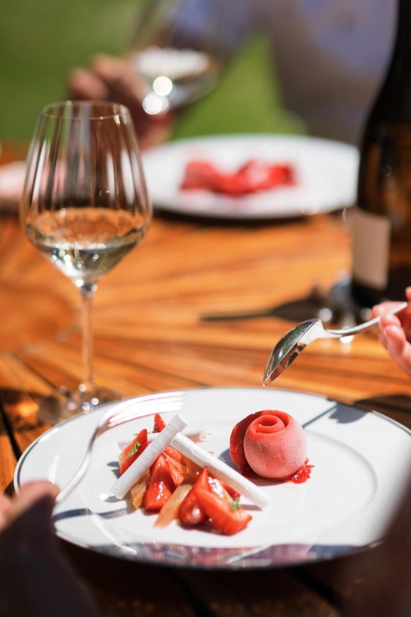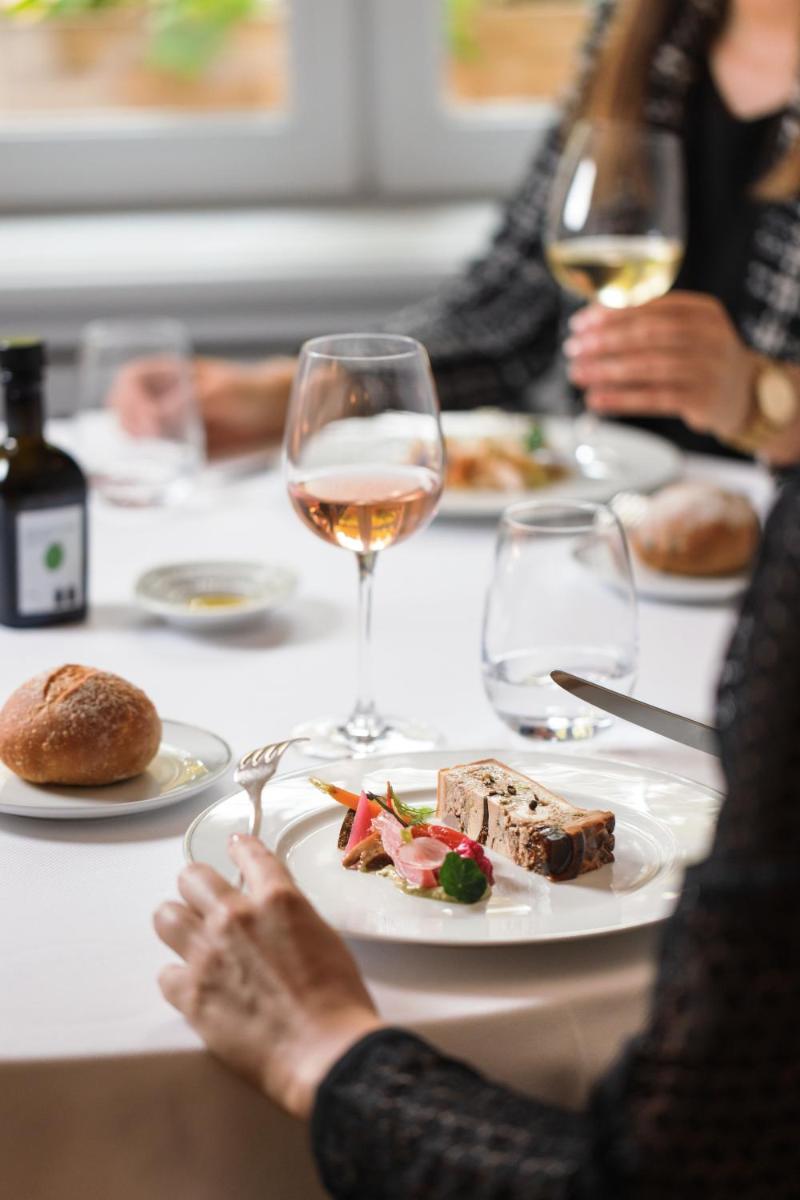 La pièce maîtresse est le restaurant, étoilé Michelin, géré par Alain Ducasse. La philosophie culinaire est entièrement basée sur le "de la ferme à la table" (farm-to-table), la majorité des ingrédients provenant directement du potager de l'abbaye ou de producteurs dans un rayon de 30 km. C'est une célébration de la cuisine provençale authentique et de haute qualité.