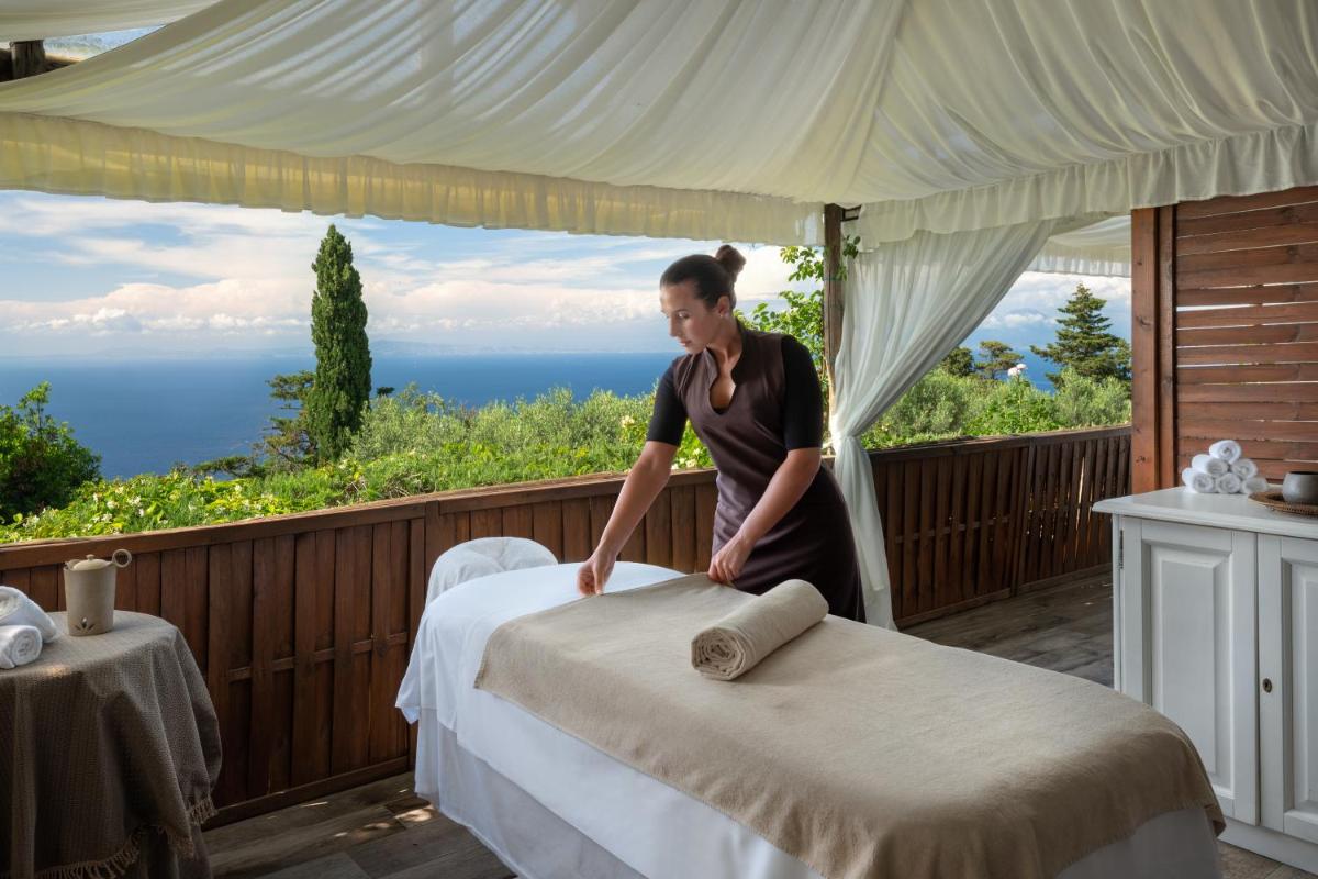 Le point central de l’espace extérieur est la magnifique piscine à débordement, située juste au bord de la falaise, qui semble plonger dans le bleu de la Méditerranée. L’hôtel offre également un petit espace bien-être pour les massages et les soins, une salle de sport et un accès direct au célèbre Sentiero dei Fortini Borbonici. Un service de navette gratuite est disponible pour les clients afin de rejoindre facilement le centre d’Anacapri.
