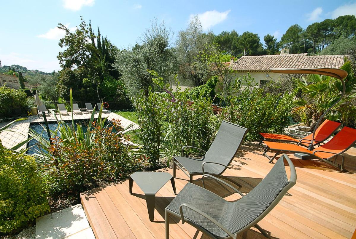 Le cœur de l'hôtel est son splendide jardin, une véritable invitation au calme. La piscine extérieure est nichée parmi les oliviers centenaires et les plantes aromatiques, offrant un cadre idyllique pour prendre un bain de soleil et profiter de la tranquillité de la campagne azuréenne.
