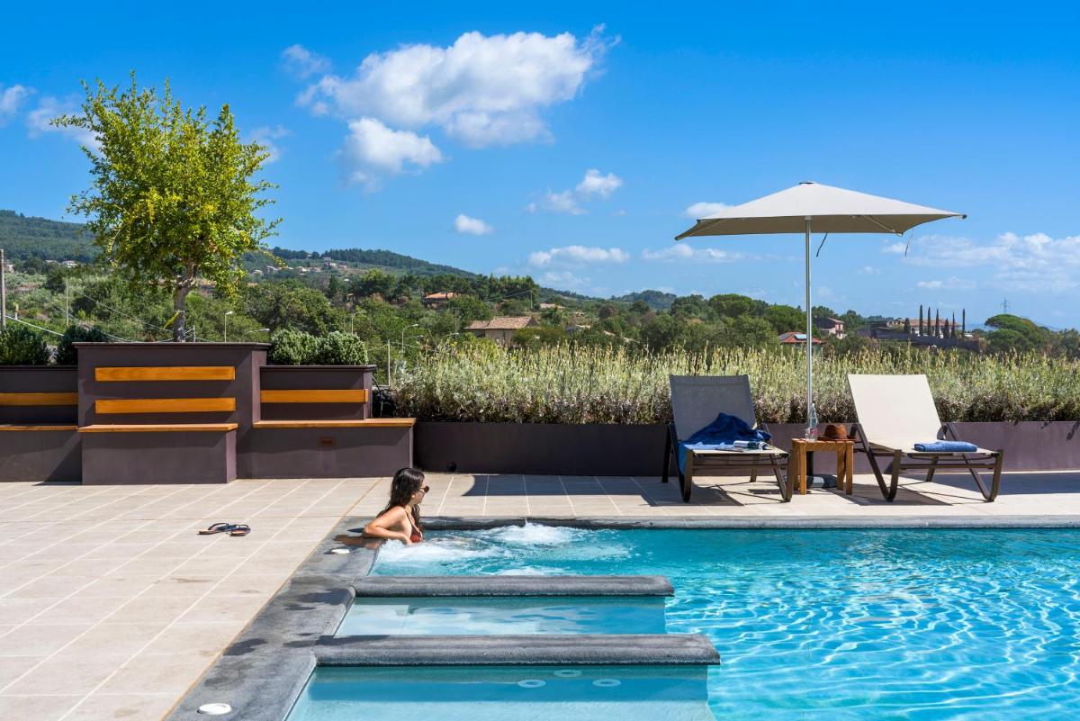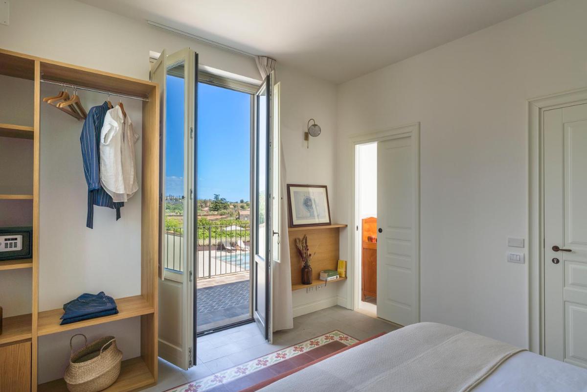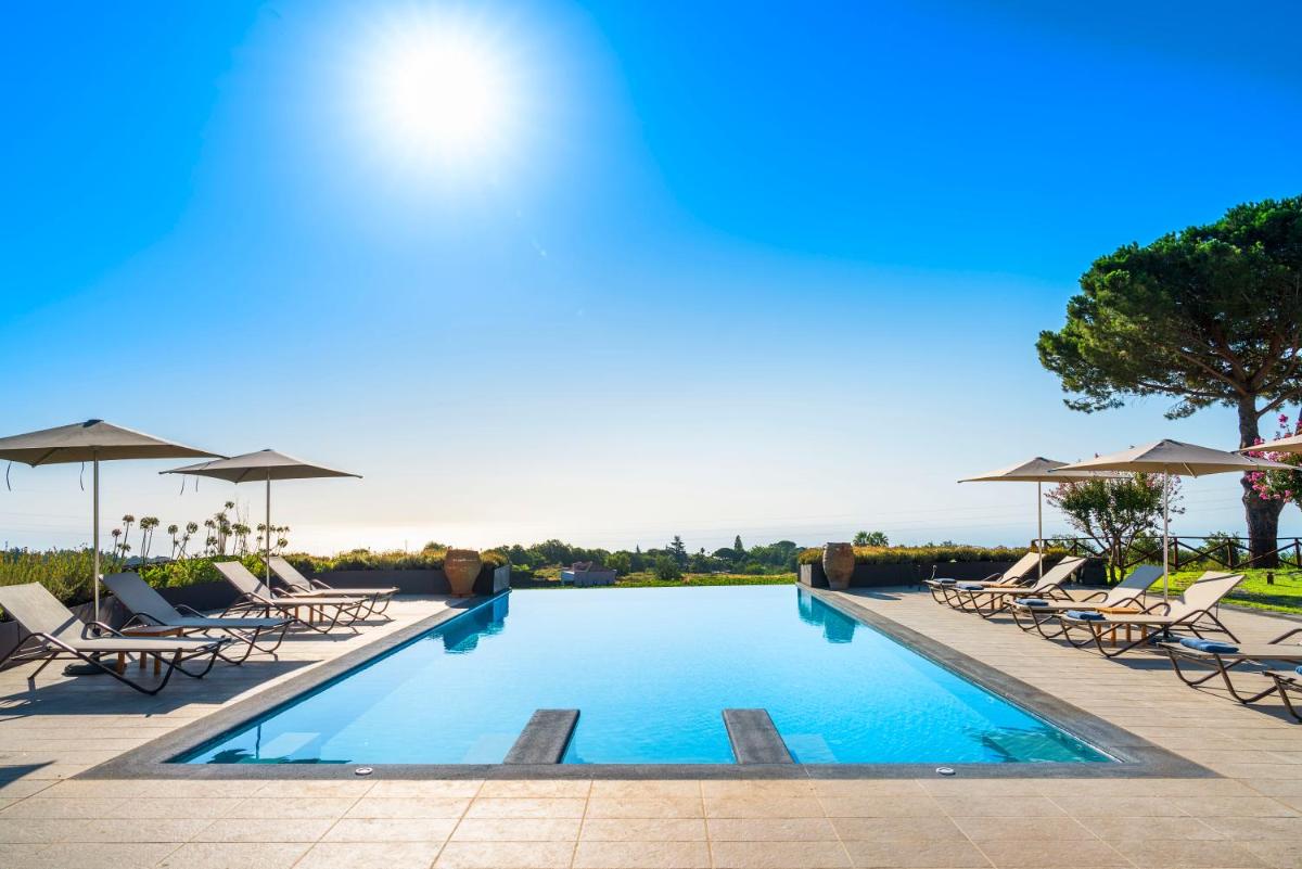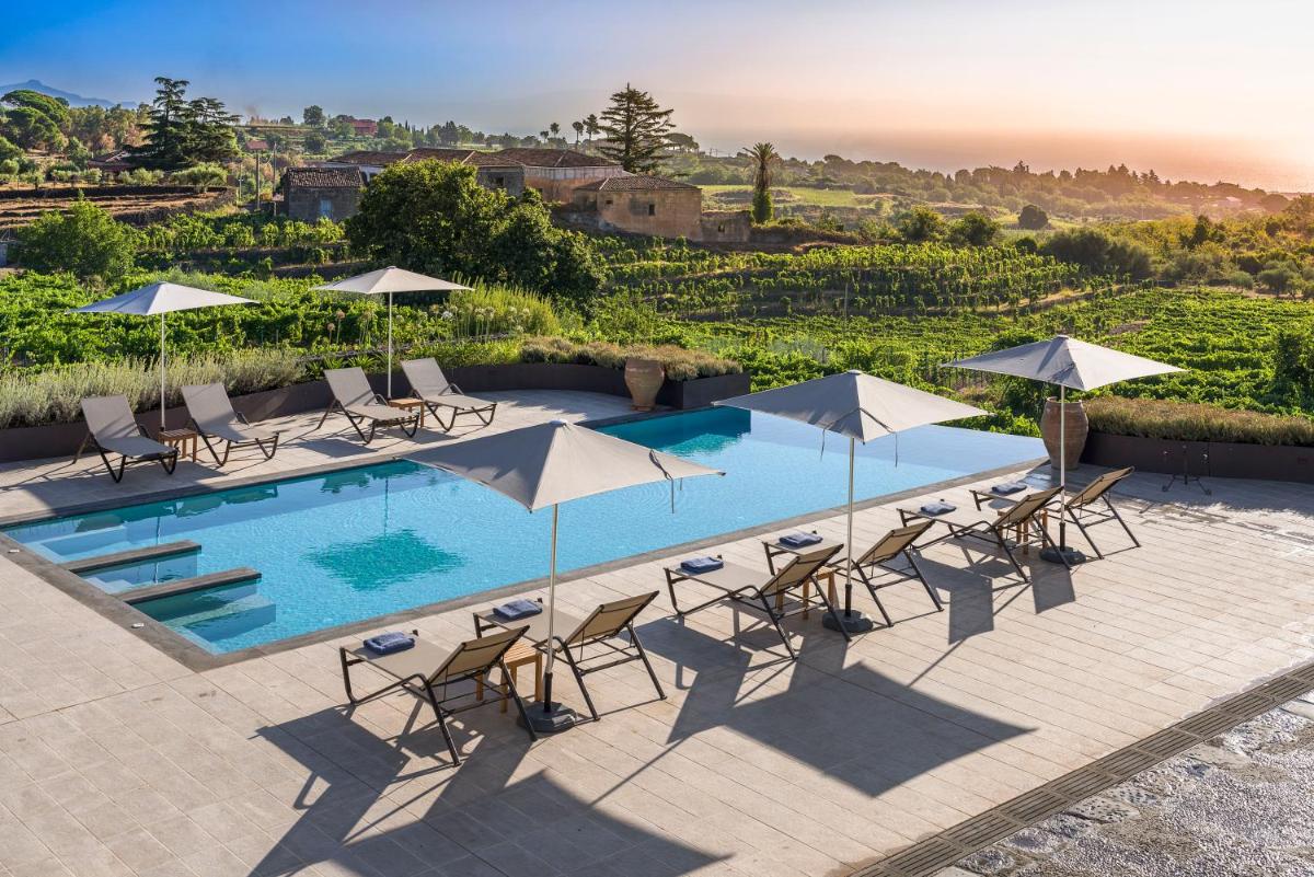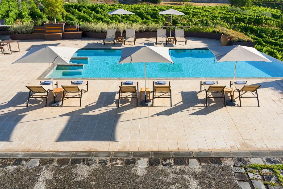 La piscine extérieure, bordée de chaises longues et d’un vaste solarium, offre une vue imprenable sur les vignes et le cône de l’Etna. Un espace bien-être est en cours d’aménagement pour compléter l’offre de relaxation.