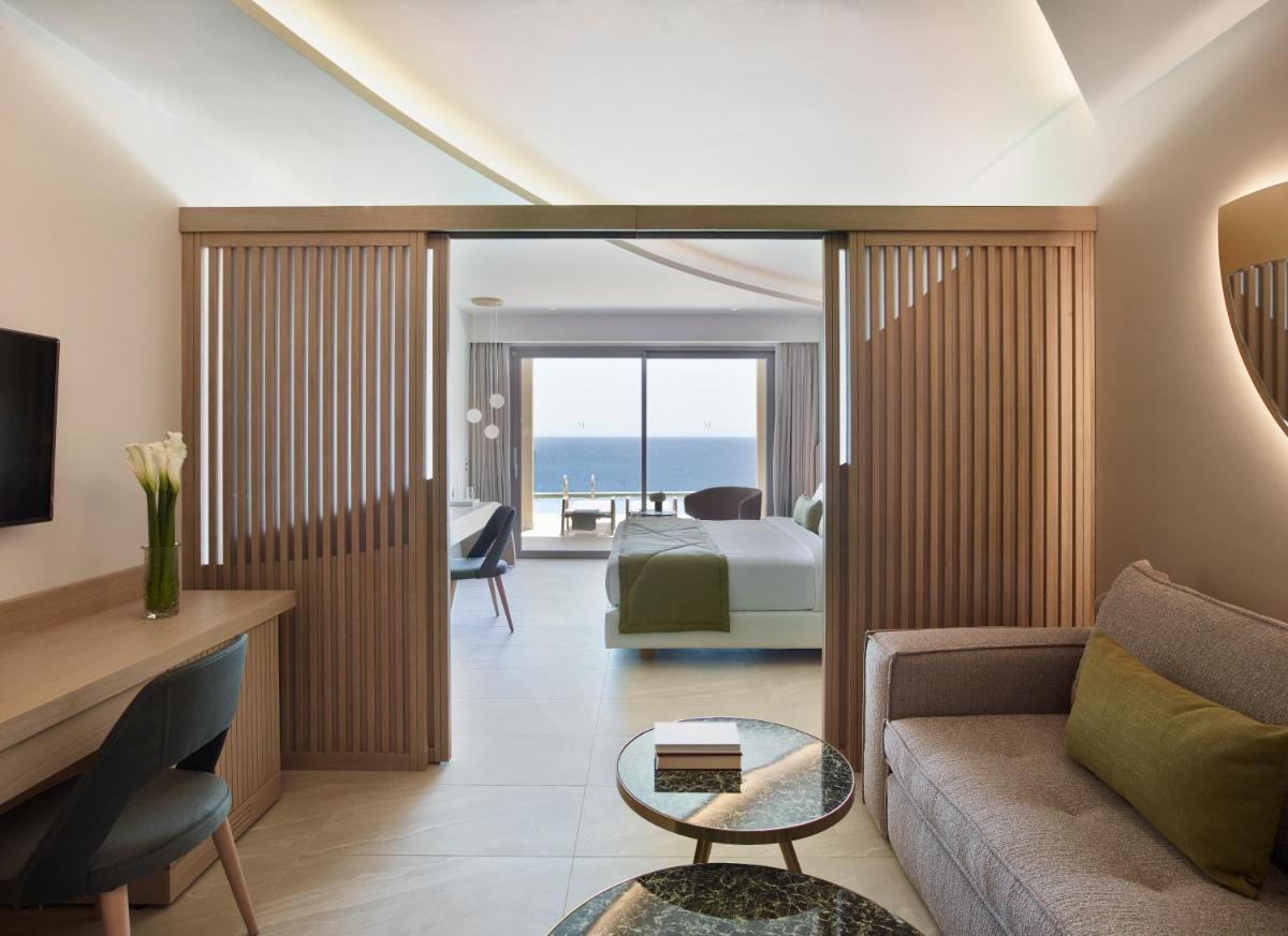 Le design est contemporain, avec de grandes baies vitrées et des terrasses pour maximiser la vue sur la Mer Égée. De nombreuses chambres et suites offrent des piscines privées ou partagées, ajoutant un niveau d'exclusivité et de confort.