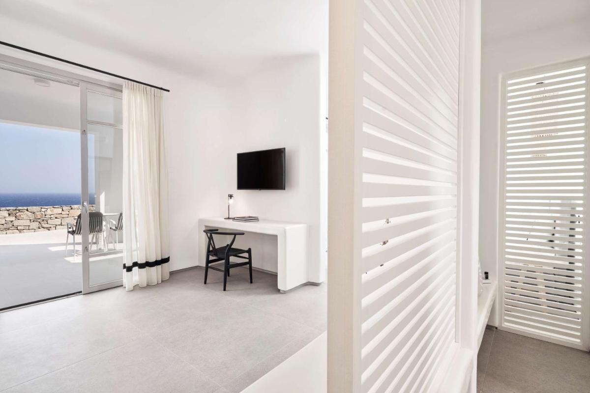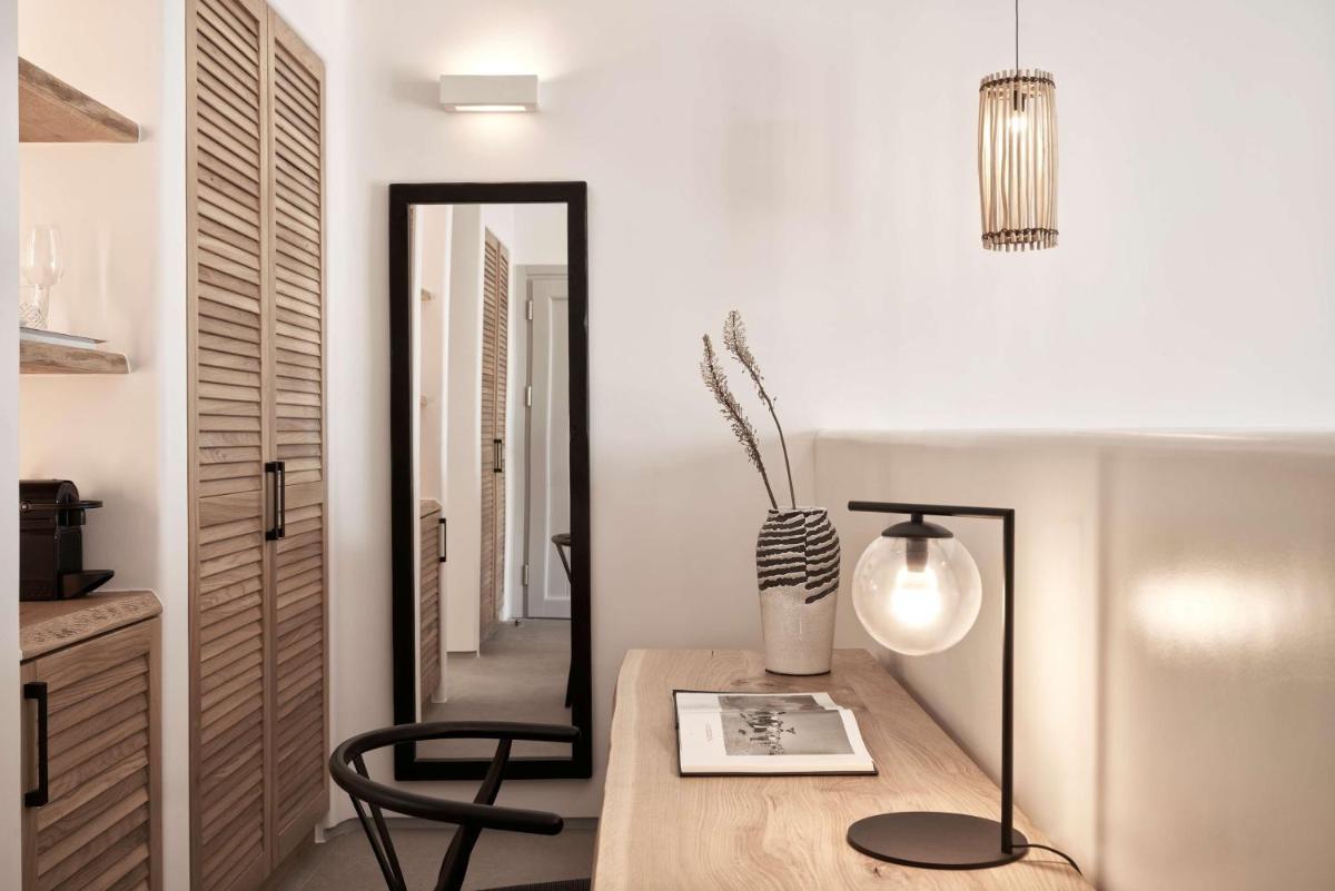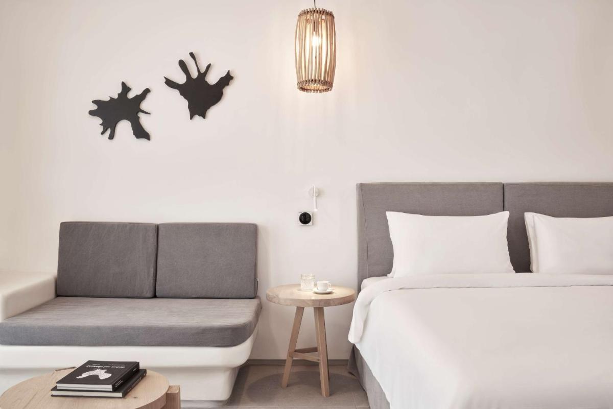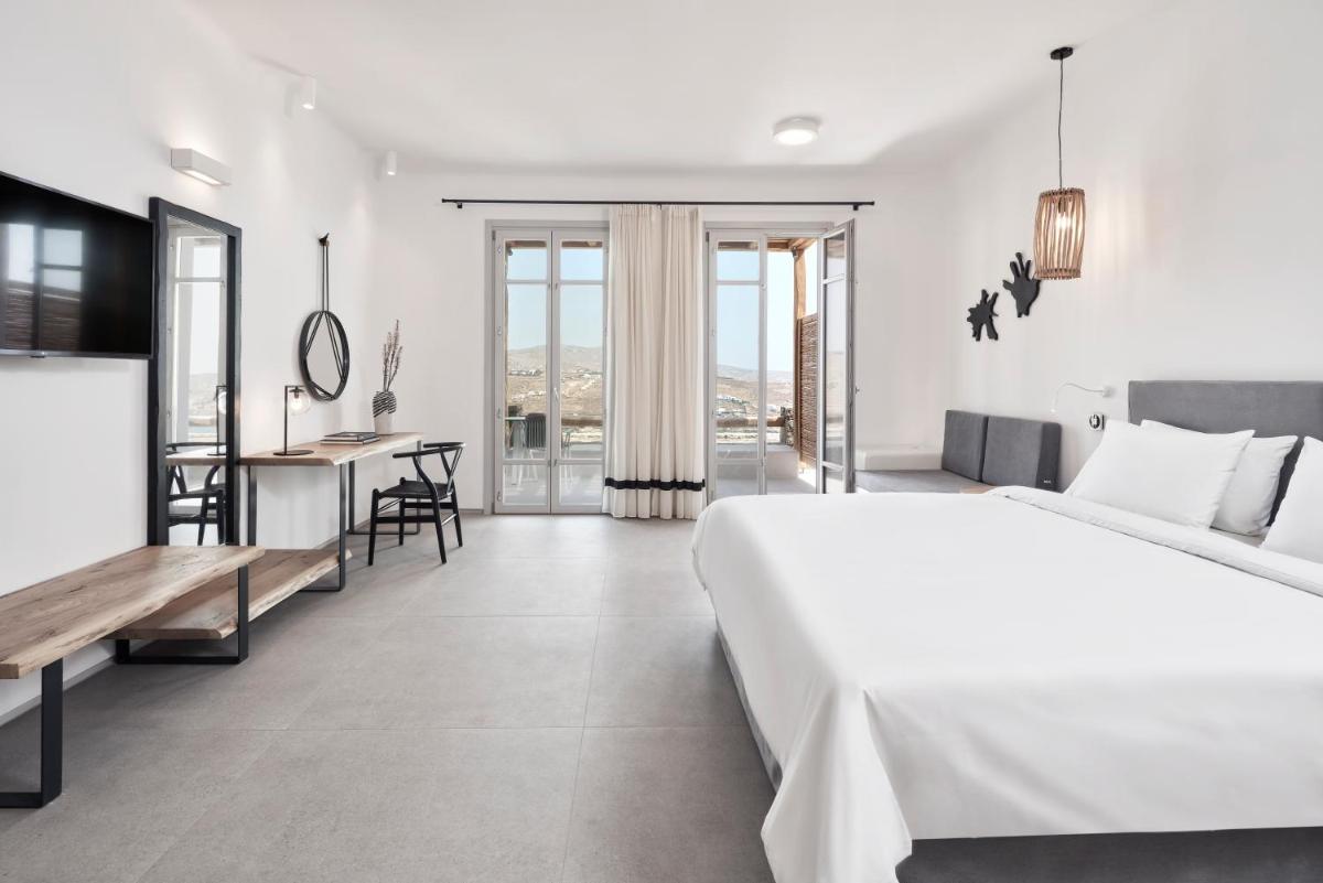 Les chambres et les suites ont été conçues en pensant à la détente et à l'élégance. Caractérisées par un design minimaliste et luxueux, avec des touches de couleur et des matériaux naturels locaux, elles offrent des espaces lumineux et aérés. De nombreux hébergements de catégorie supérieure incluent des piscines ou Jacuzzis privés sur la terrasse, d'où il est possible de profiter du célèbre coucher de soleil de Mykonos en toute intimité.