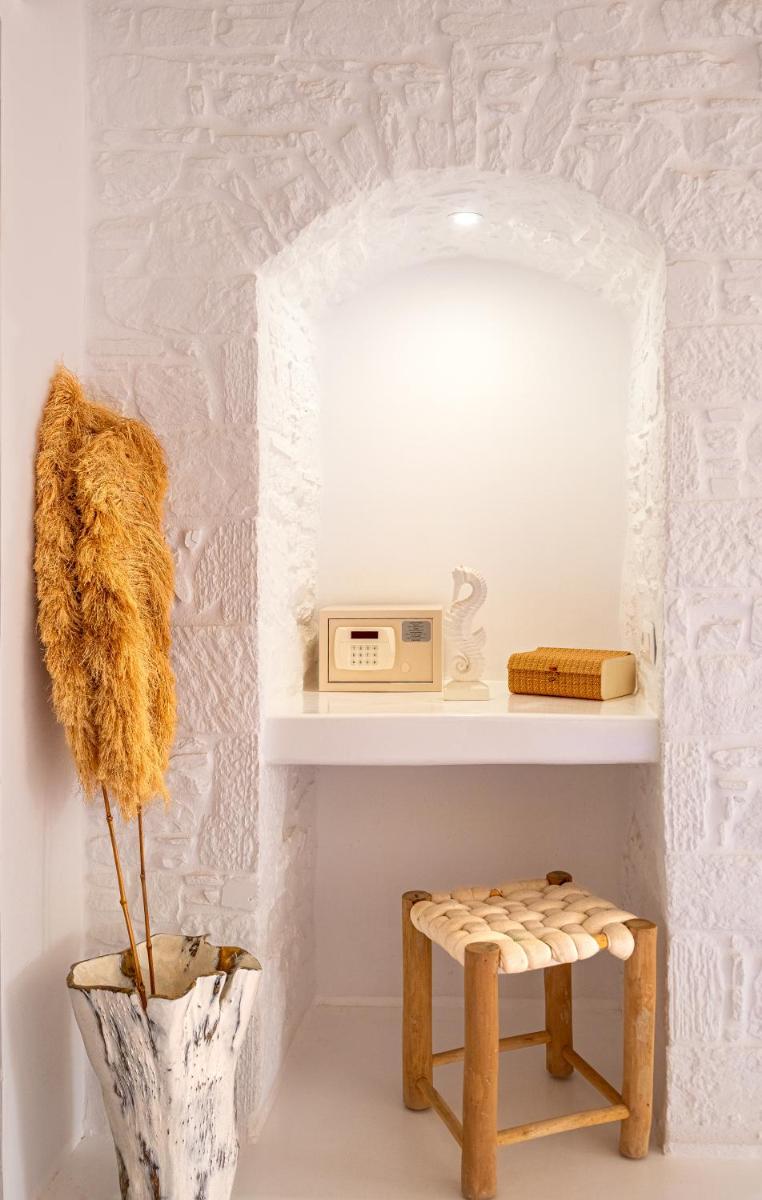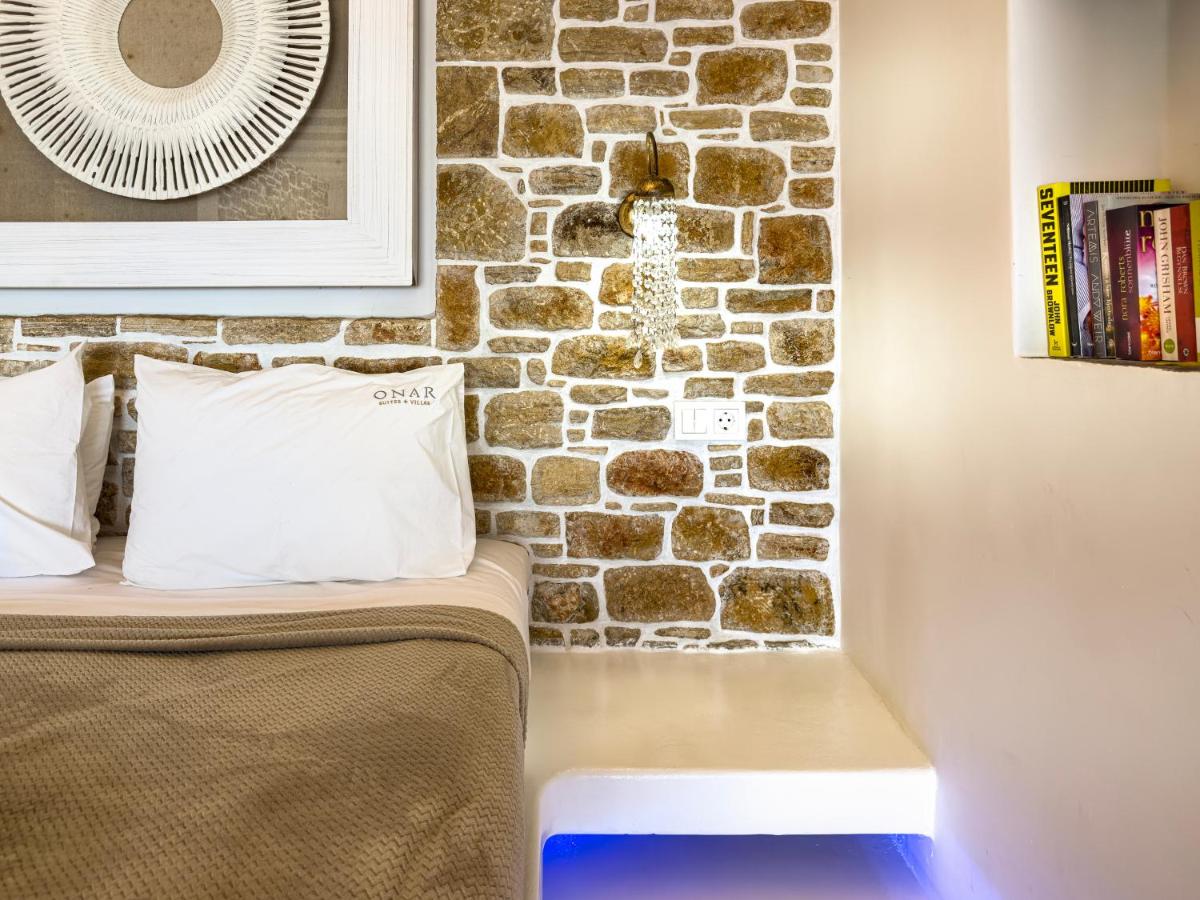 Les suites et villas d'Onar reflètent la pureté du design grec : murs à la chaux blanche, sols en résine et mobilier soigné. Une petite pépite réside dans l'utilisation de pierres apparentes et de bois naturels che créent une atmosphère organique, permettant aux hôtes de se sentir en symbiose totale avec l'environnement sauvage de l'île.