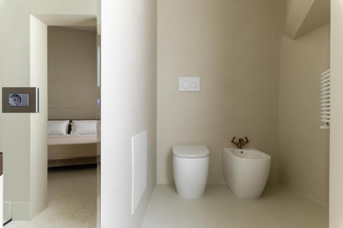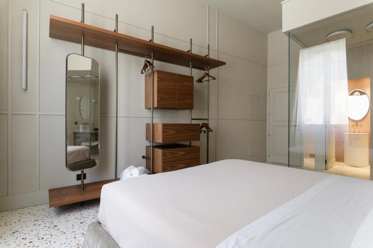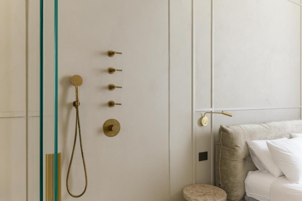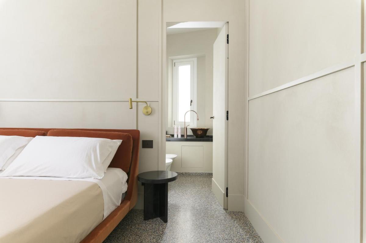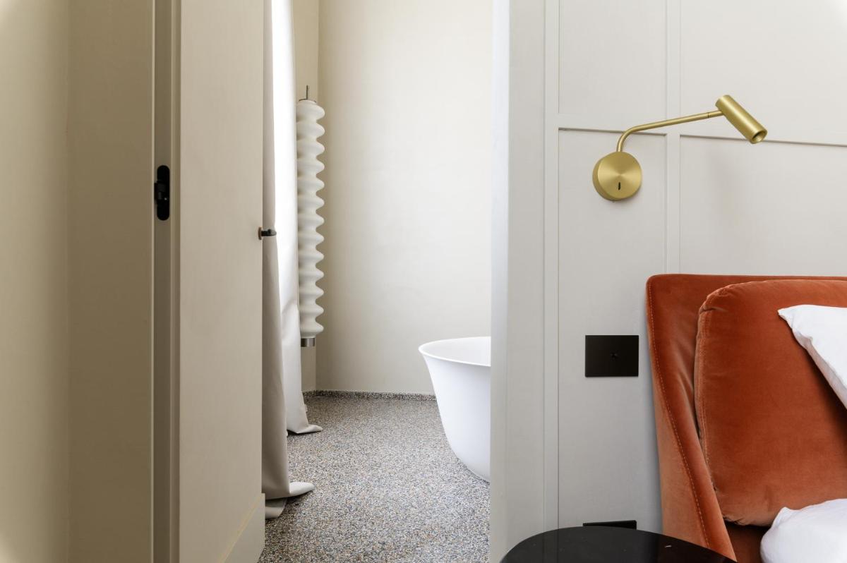 Tons clairs, bois et textiles naturels composent des pièces mesurées en cohérence avec l’architecture originelle. Les vues changent au fil des heures — coupoles, clochers et perspectives urbaines mouvantes.