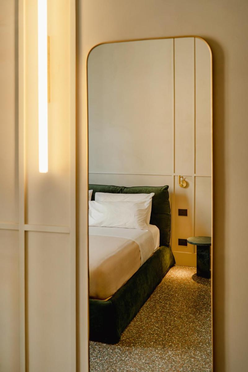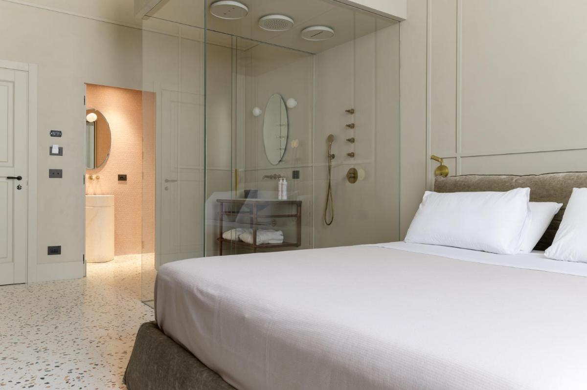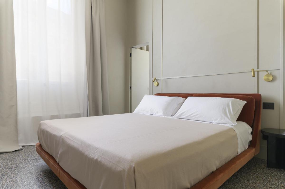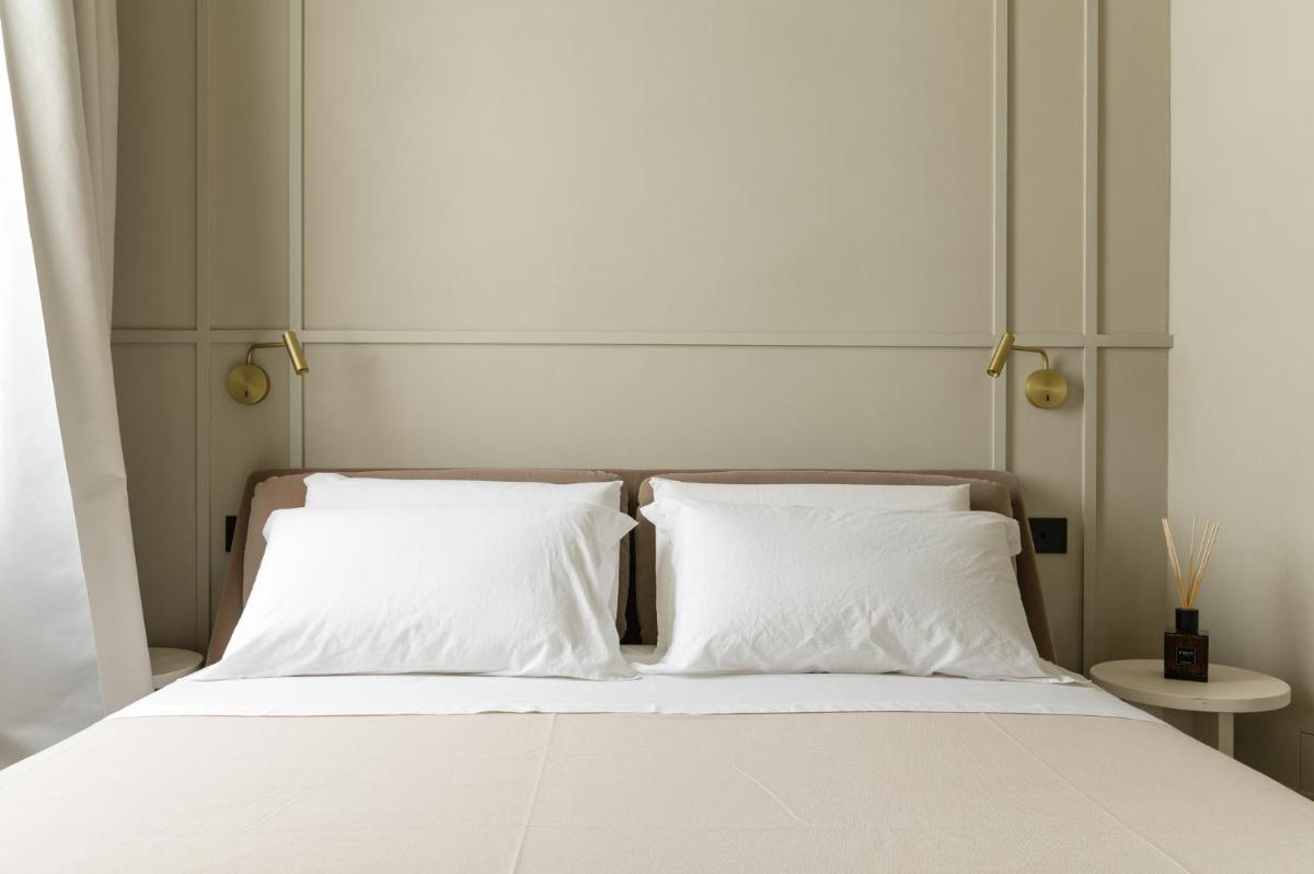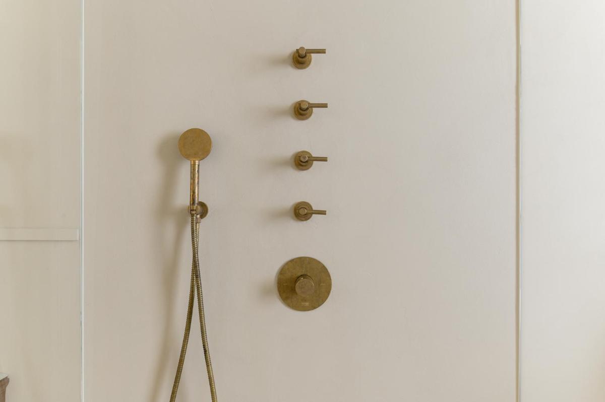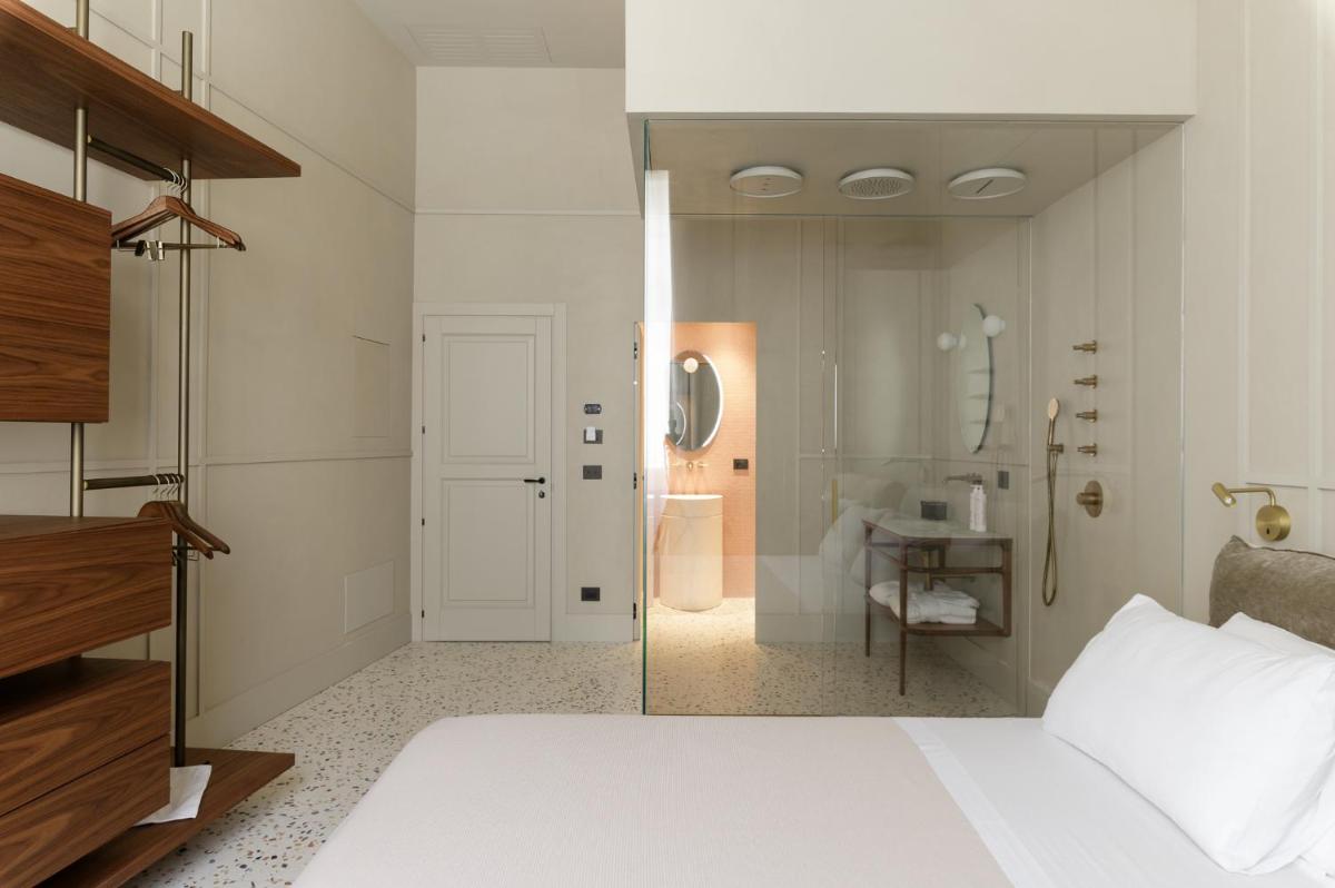 Tons clairs, bois et textiles naturels composent des pièces mesurées en cohérence avec l’architecture originelle. Les vues changent au fil des heures — coupoles, clochers et perspectives urbaines mouvantes.