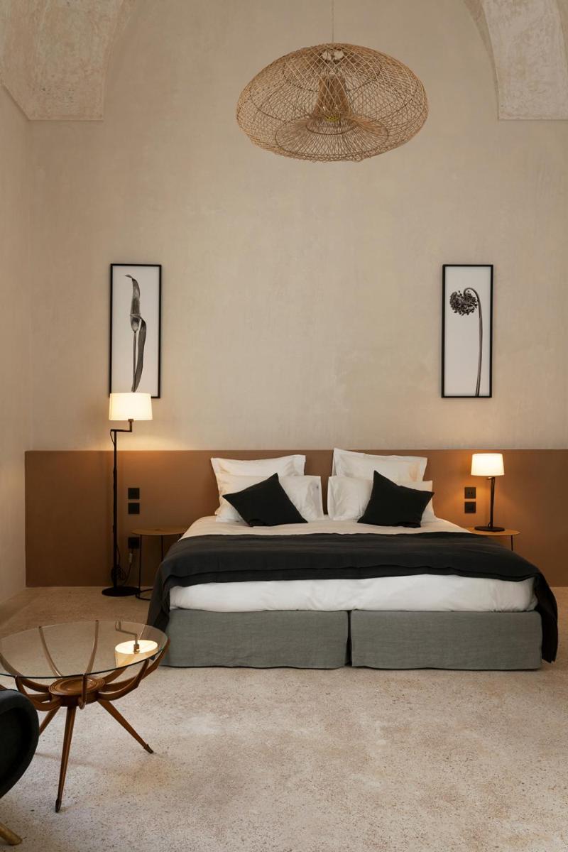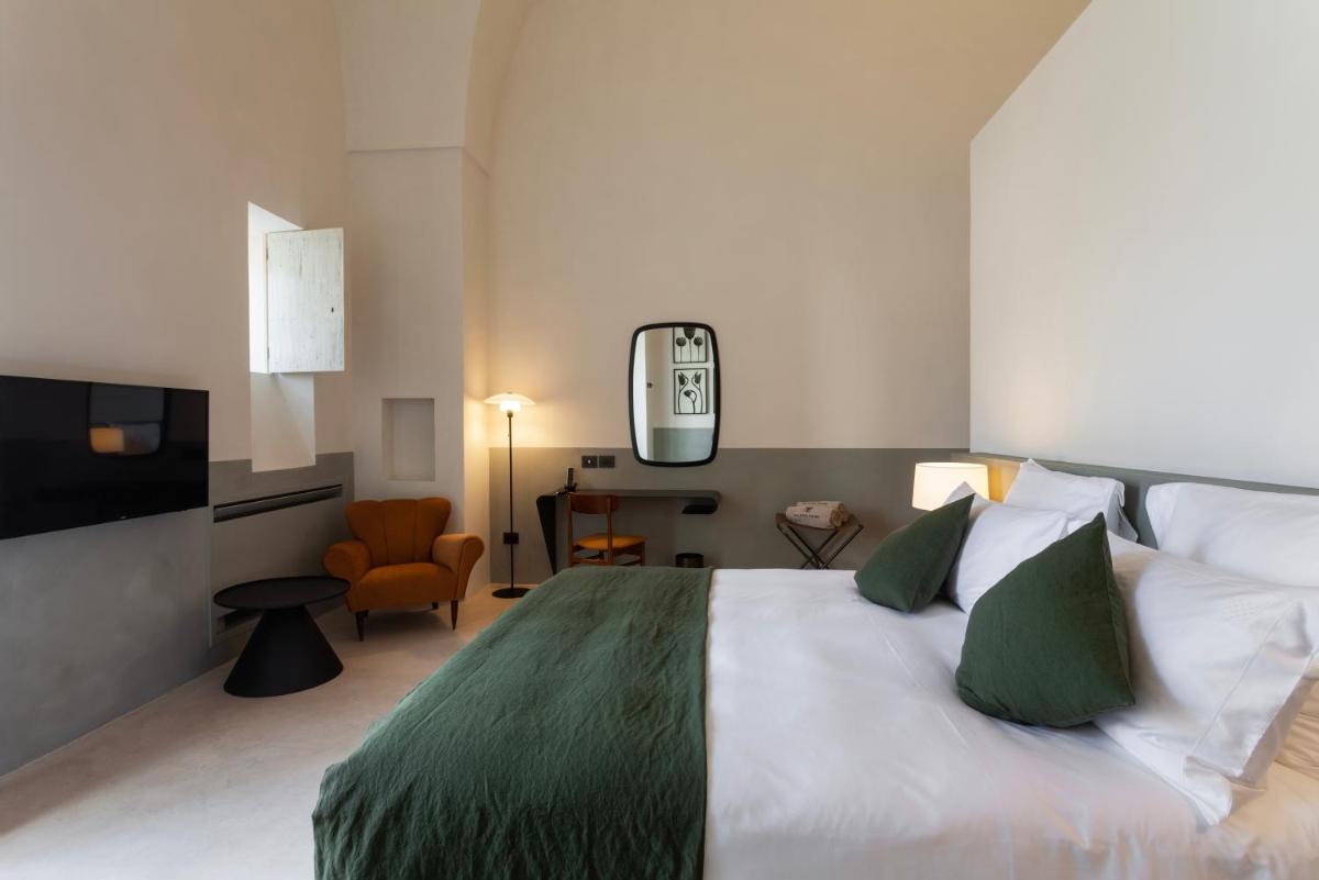 Les chambres et suites sont caractérisées par de hauts plafonds voûtés, des sols en pierre de Lecce ou d'anciennes tomettes. L'ameublement combine des pièces de design moderne avec des éléments d'époque, créant une atmosphère de luxe discret. Tous les hébergements offrent un confort moderne, notamment la climatisation, un minibar, le Wi-Fi gratuit et des salles de bains en marbre. Beaucoup bénéficient d'une vue suggestive sur le centre historique de Nardò ou sur la campagne du Salento environnante.