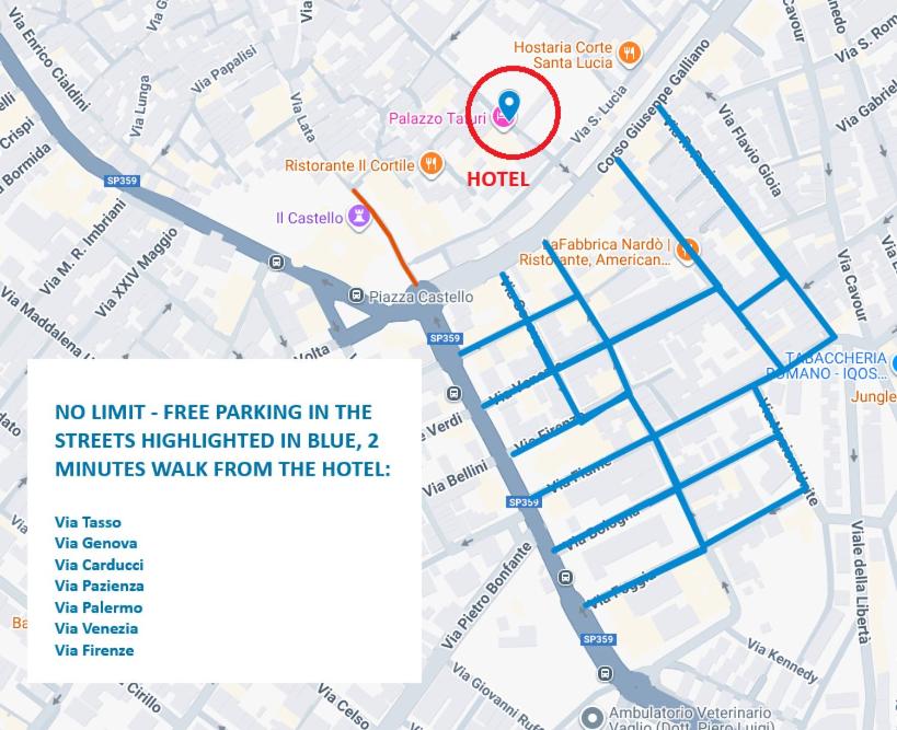 Le palais est situé dans le centre historique de Nardò, permettant de visiter à pied ses places et églises baroques. C'est également une base parfaite pour rejoindre les stations balnéaires renommées et les plages du Parc Naturel de Porto Selvaggio et Santa Caterina, à quelques minutes en voiture. Le personnel est disponible pour recommander les meilleurs itinéraires œnogastronomiques et culturels du Salento.