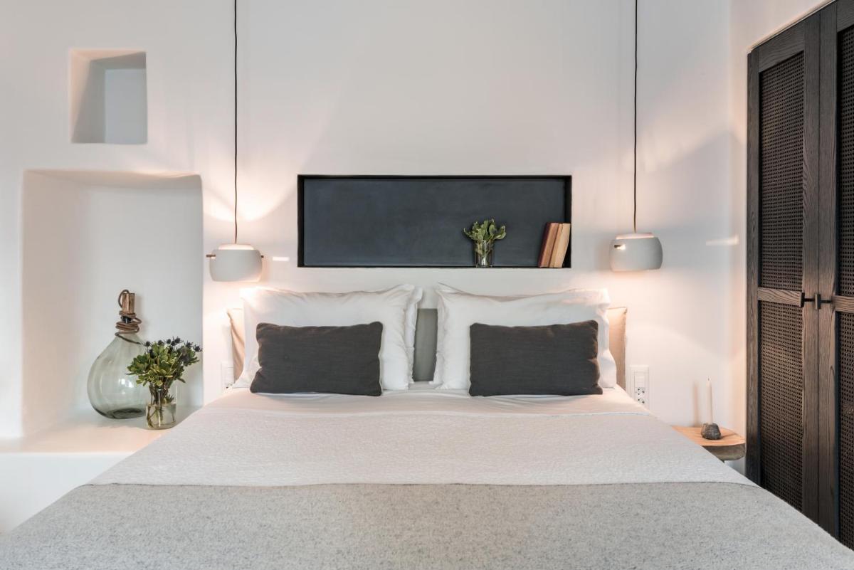 Les suites sont creusées dans la roche volcanique, suivant l'esthétique traditionnelle de Santorin, garantissant un environnement frais et authentique. Le design intérieur est cycladique classique, avec des murs blanchis à la chaux, des sols en pierre et un mobilier simple mais élégant. Chaque suite offre le luxe d'une terrasse ou d'un balcon privé avec une vue directe sur la Caldeira.