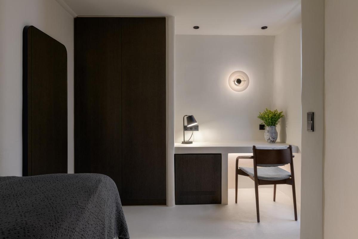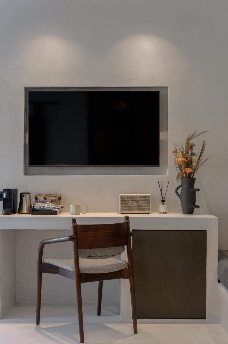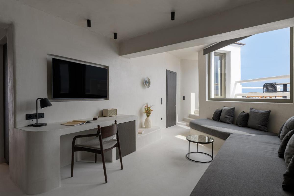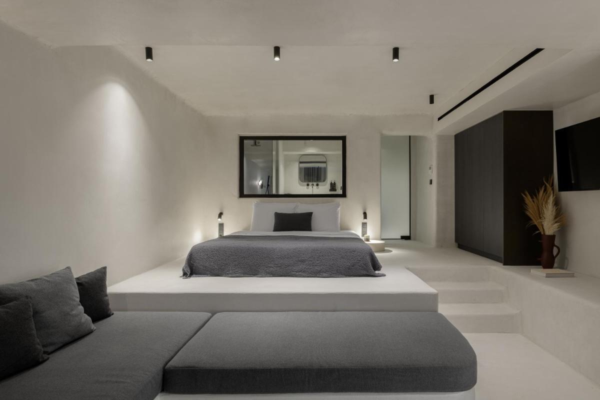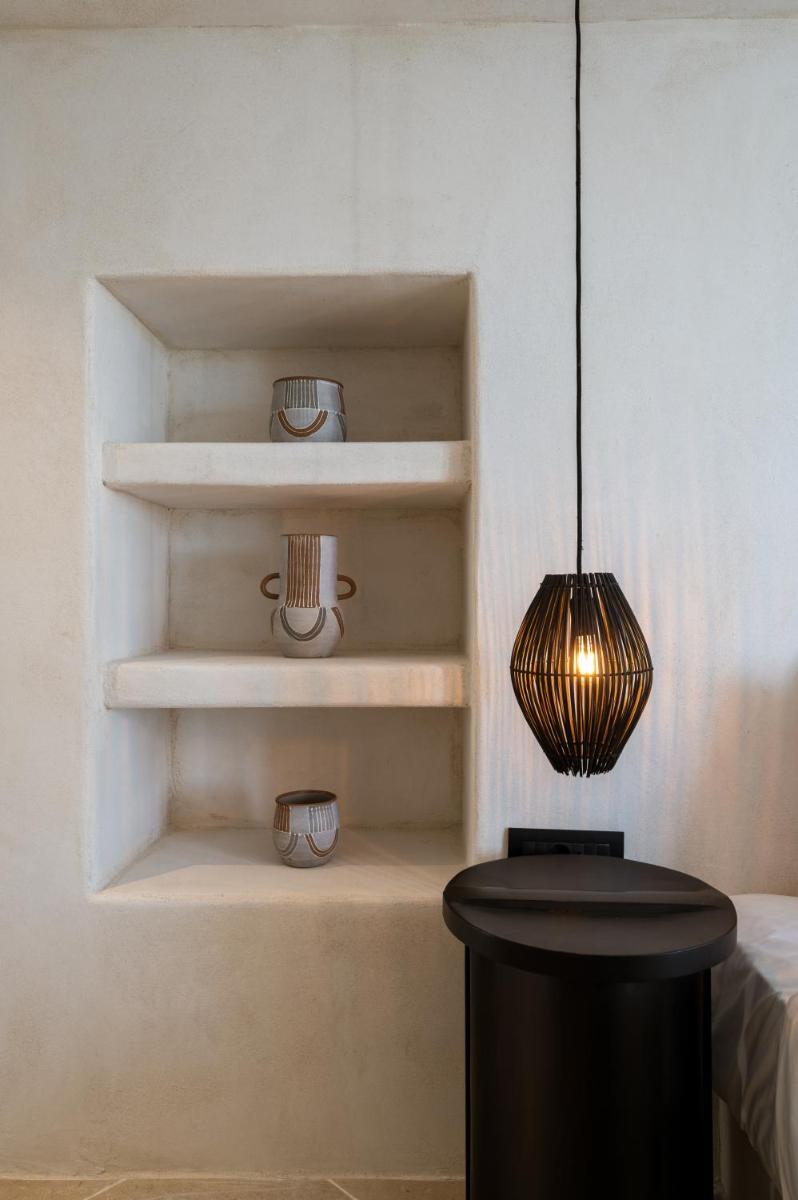 L'hôtel propose une variété de chambres et de suites, dont beaucoup sont équipées de jacuzzis privés extérieurs ou de petites piscines donnant sur l'Égée et le port de Tourlos. Chaque espace est une retraite de design, conçue pour offrir un confort absolu et une sensation d'évasion.