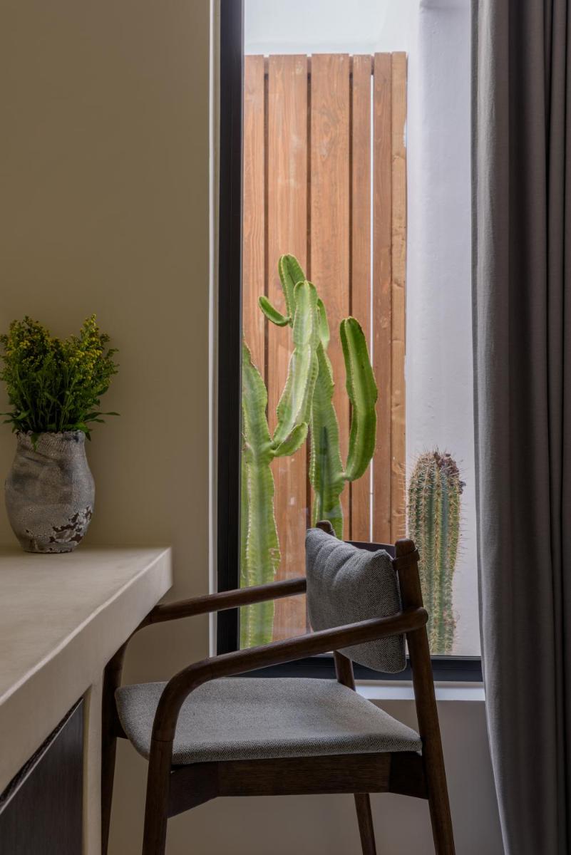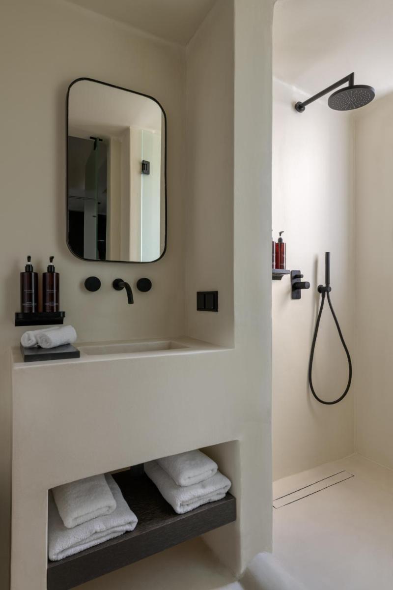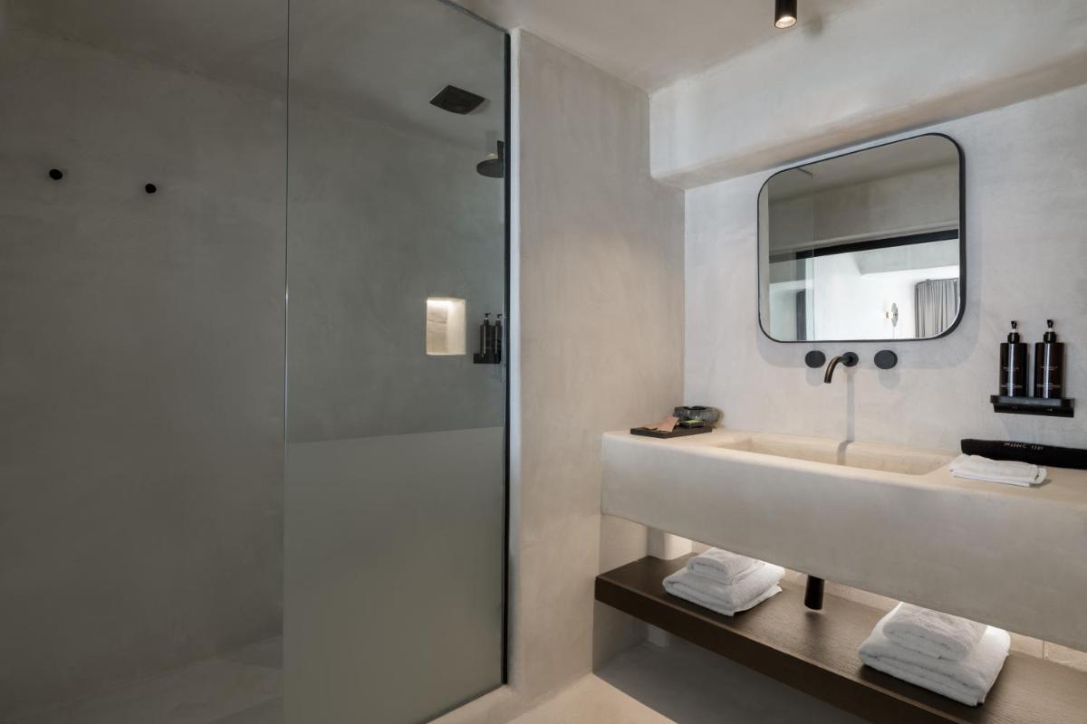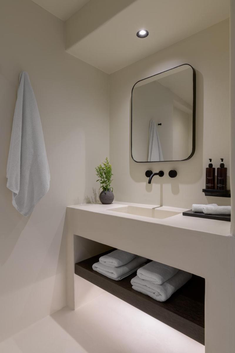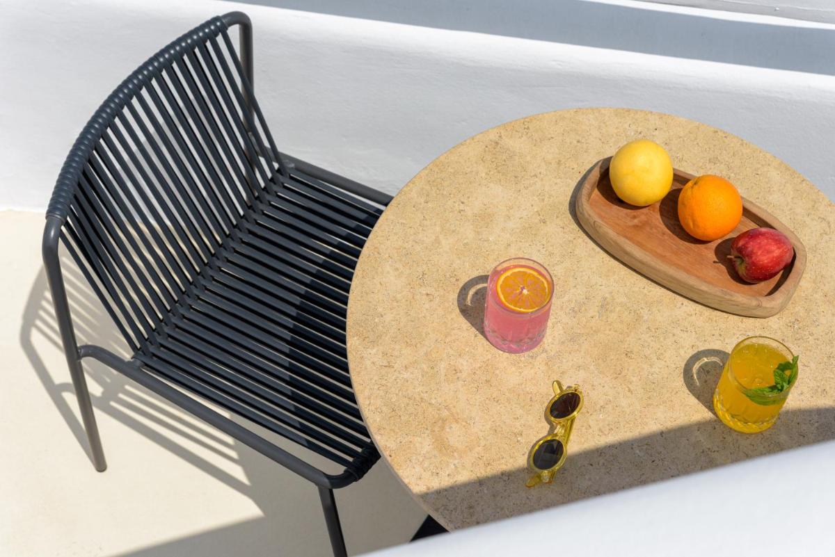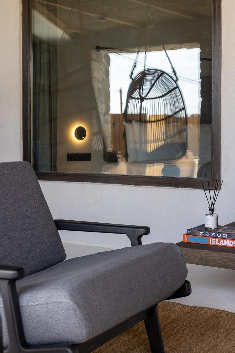 L'hôtel propose une variété de chambres et de suites, dont beaucoup sont équipées de jacuzzis privés extérieurs ou de petites piscines donnant sur l'Égée et le port de Tourlos. Chaque espace est une retraite de design, conçue pour offrir un confort absolu et une sensation d'évasion.
